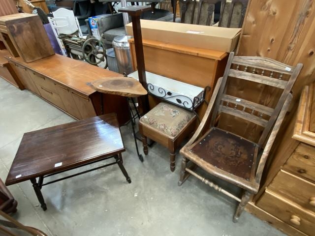 Stained pine occasional table 45H 70W 44D, Victorian mahogany stool, Edwardian oak rocking chair 49W etc