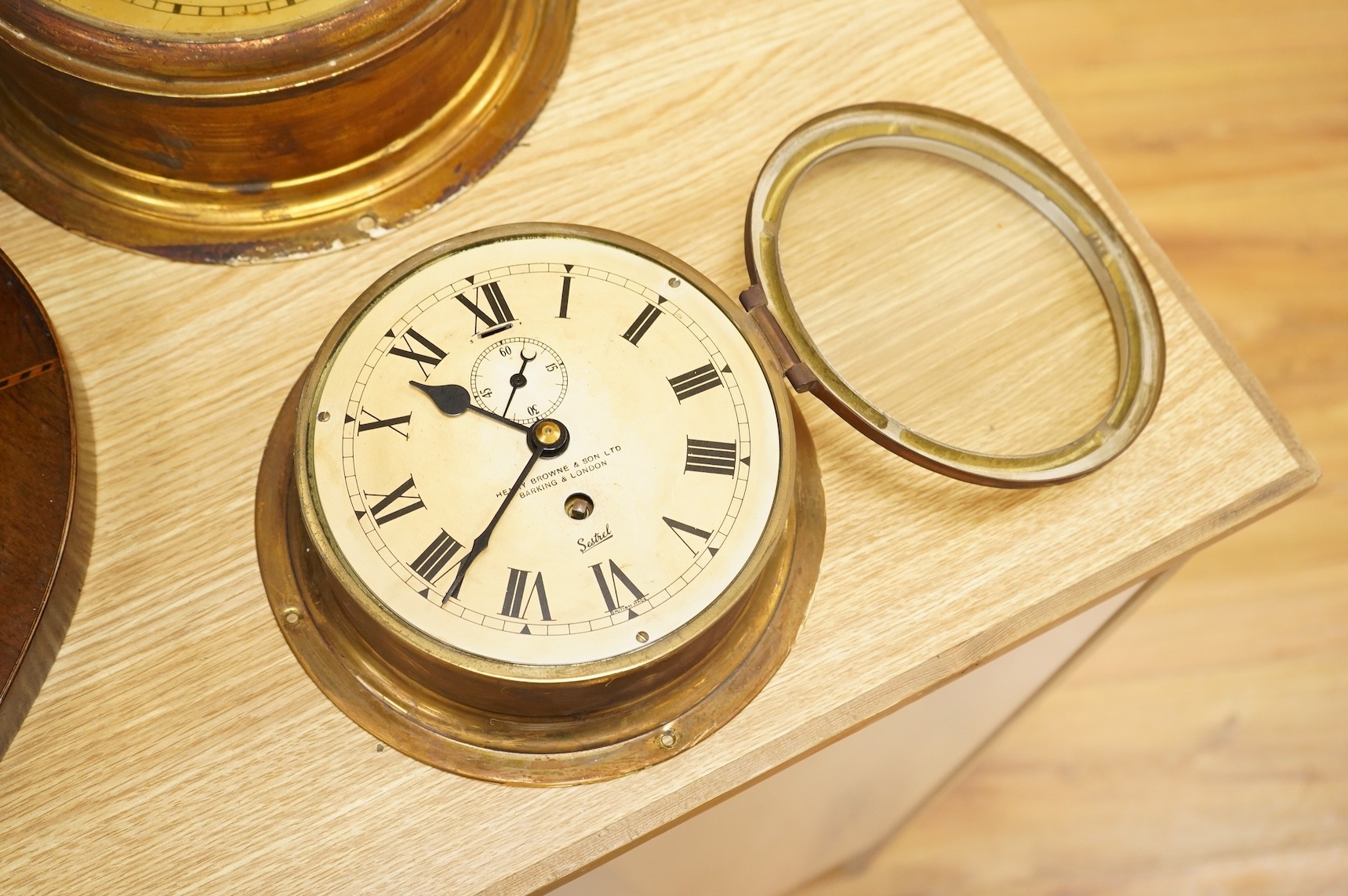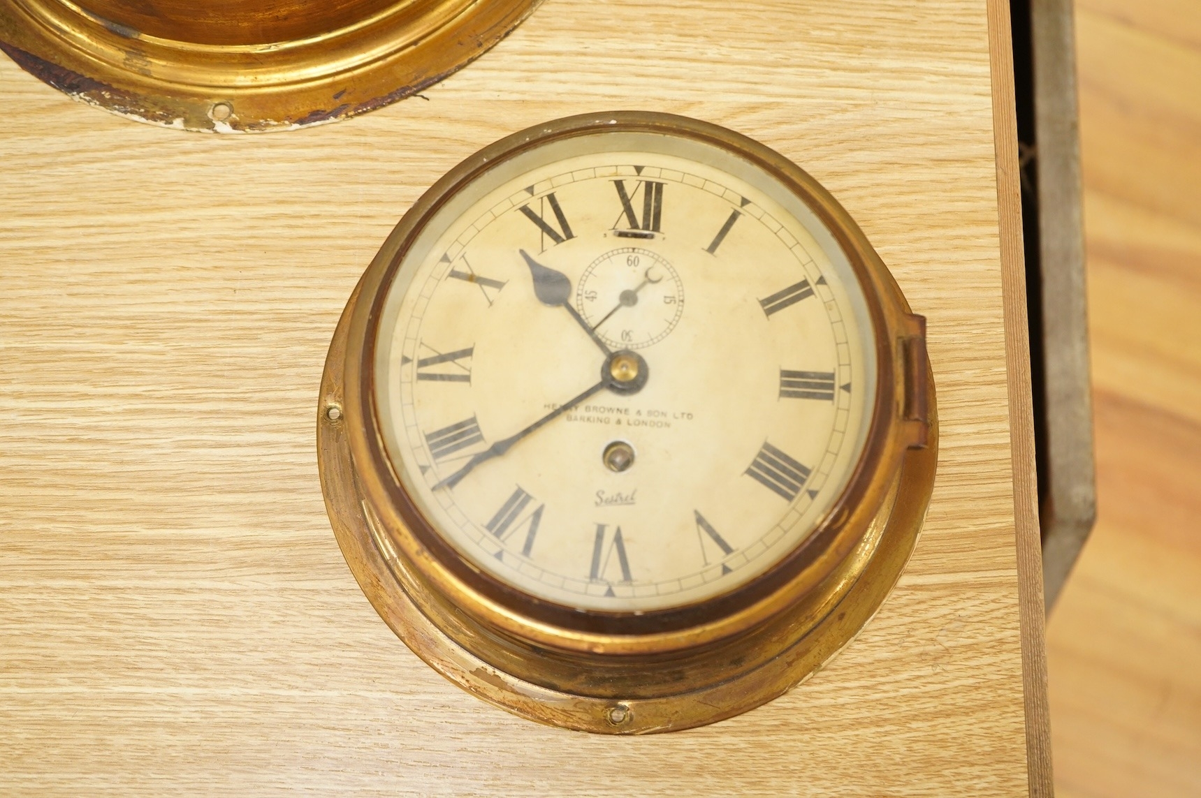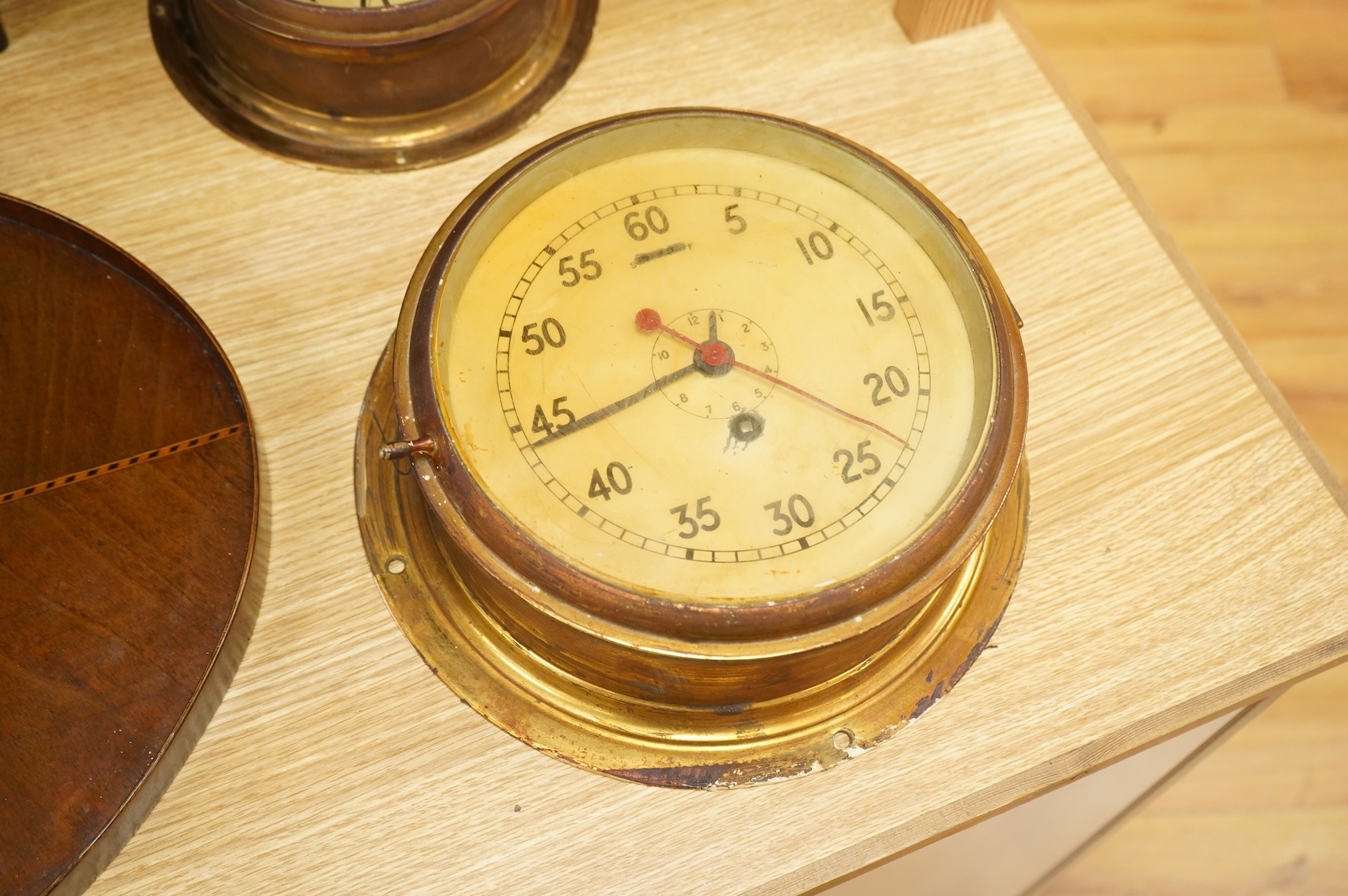 Two brass ships bulkhead timepieces, largest 25cm