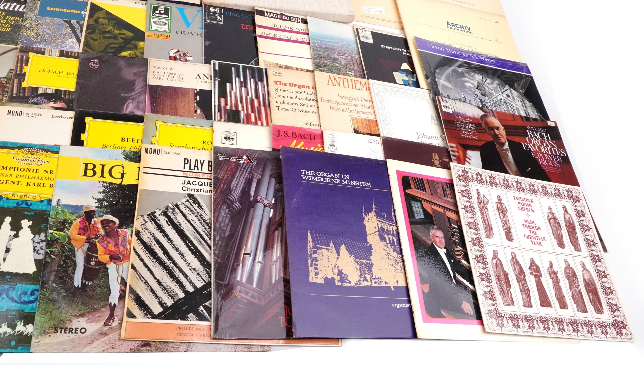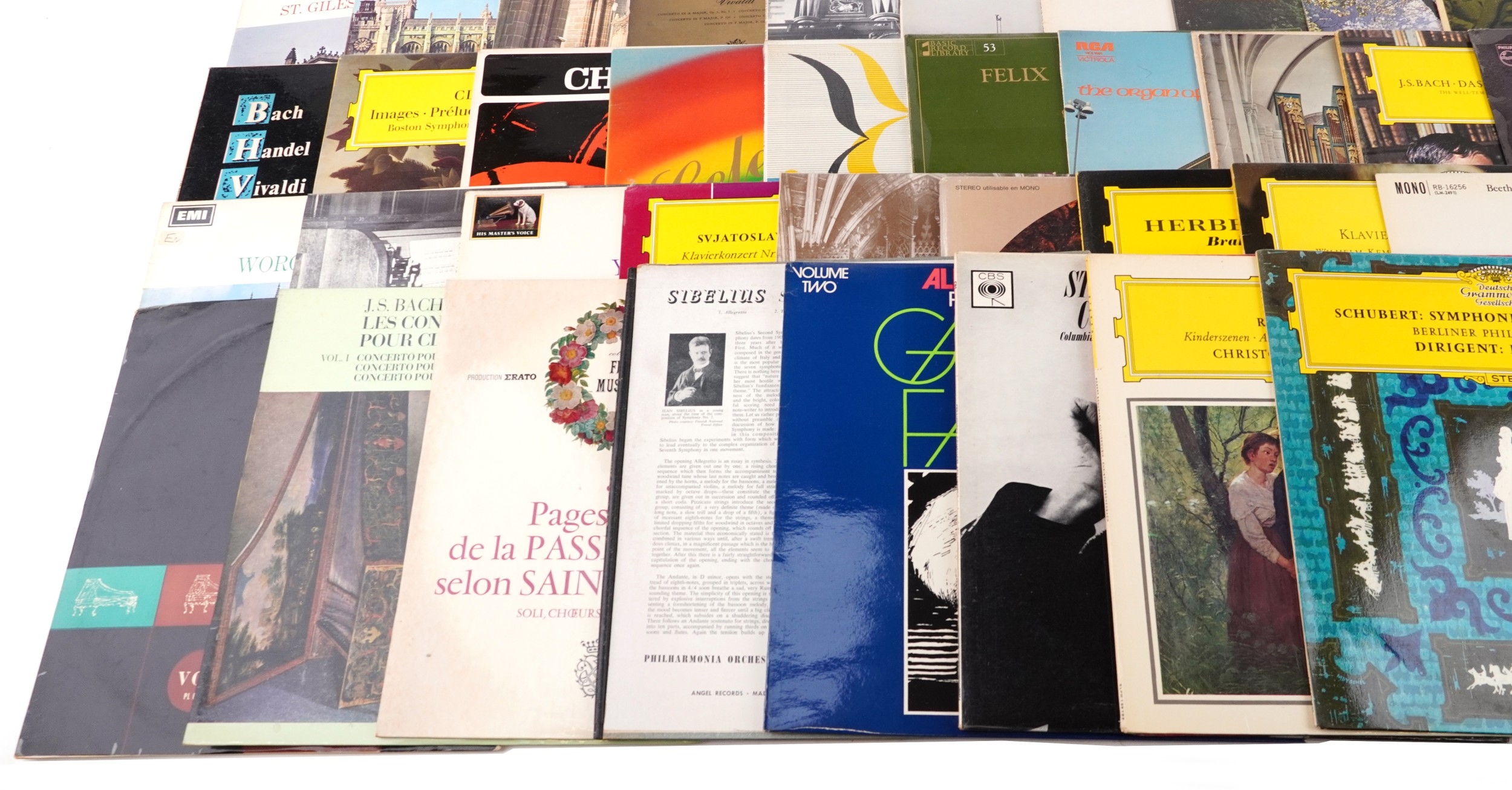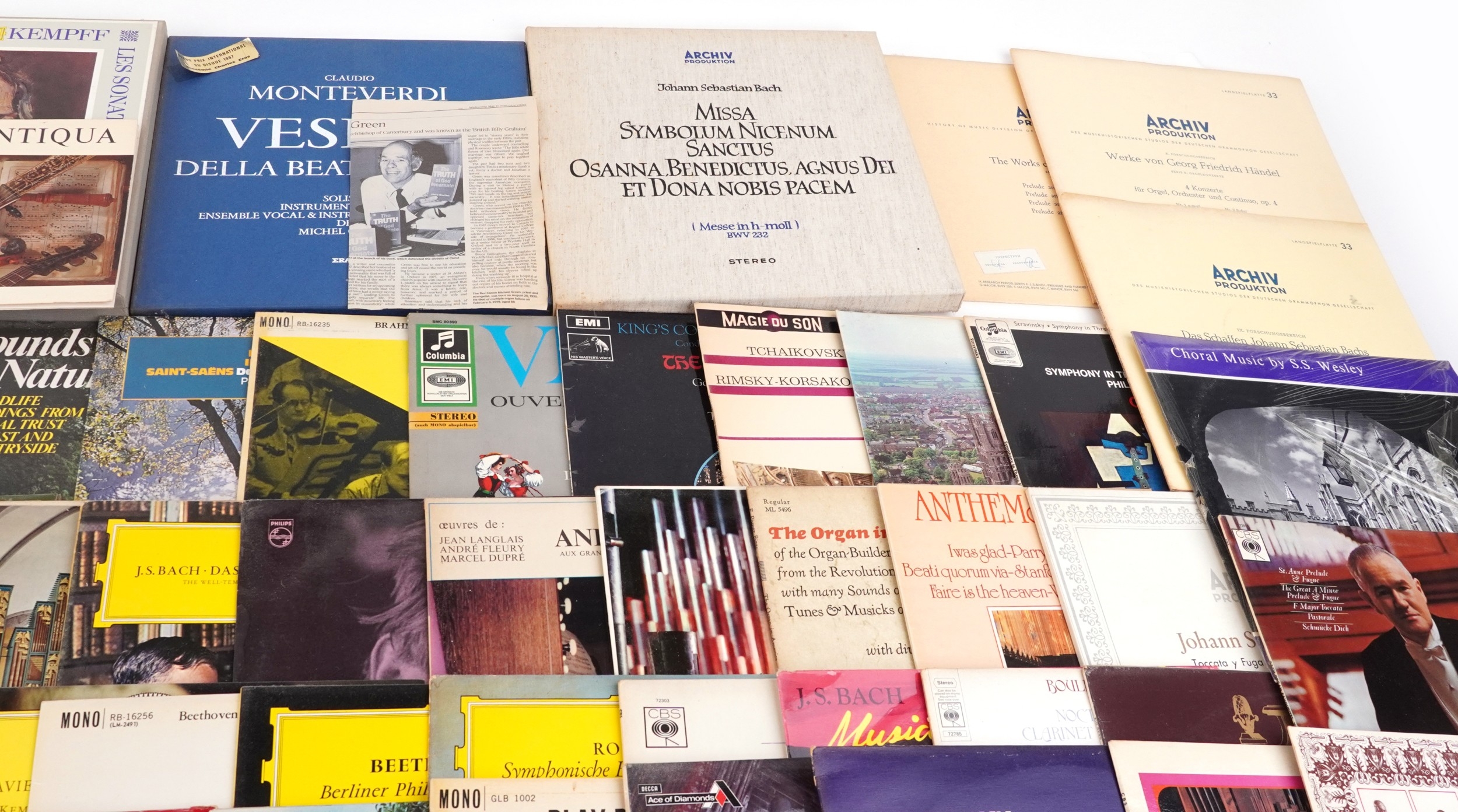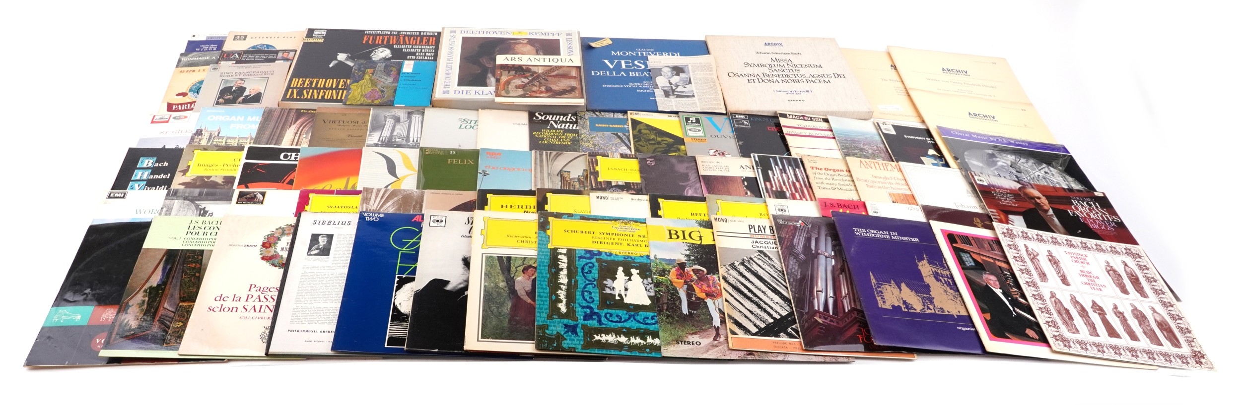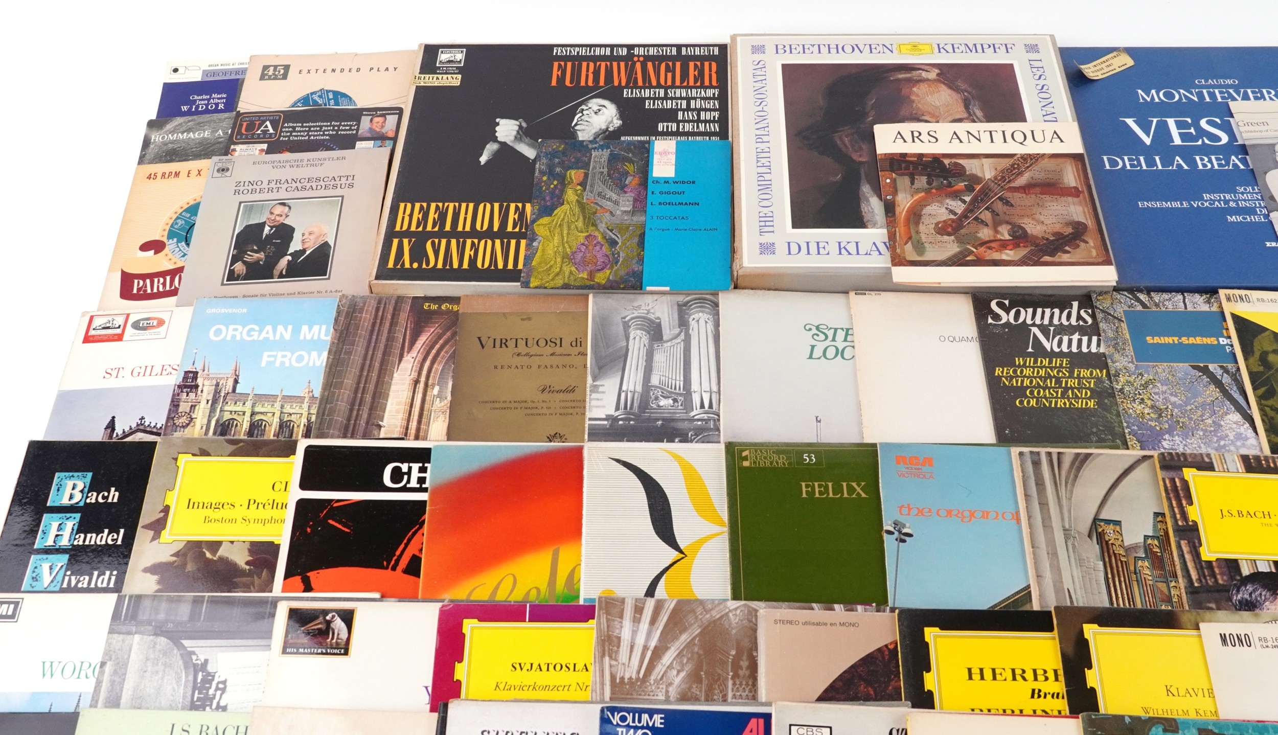 Vinyl LP records and 45rpm records, mostly classical, including Verdi, Tchaikovsky and Stravinsky.