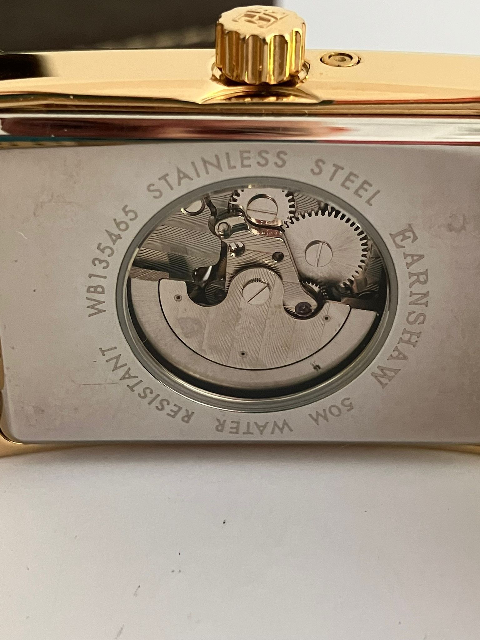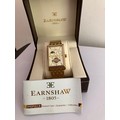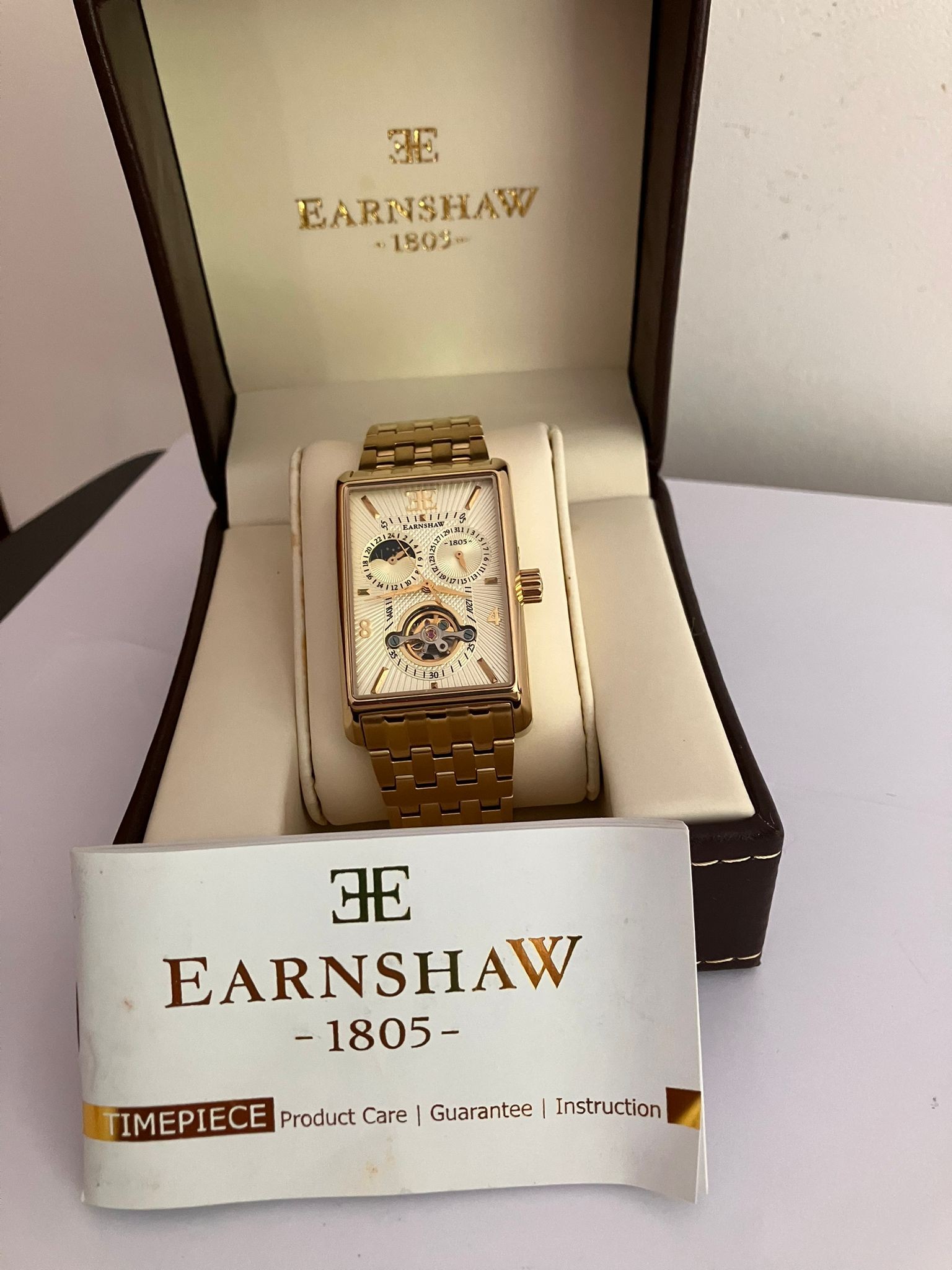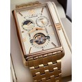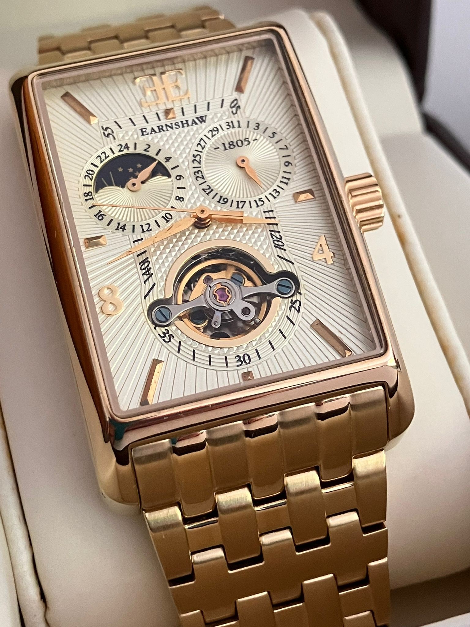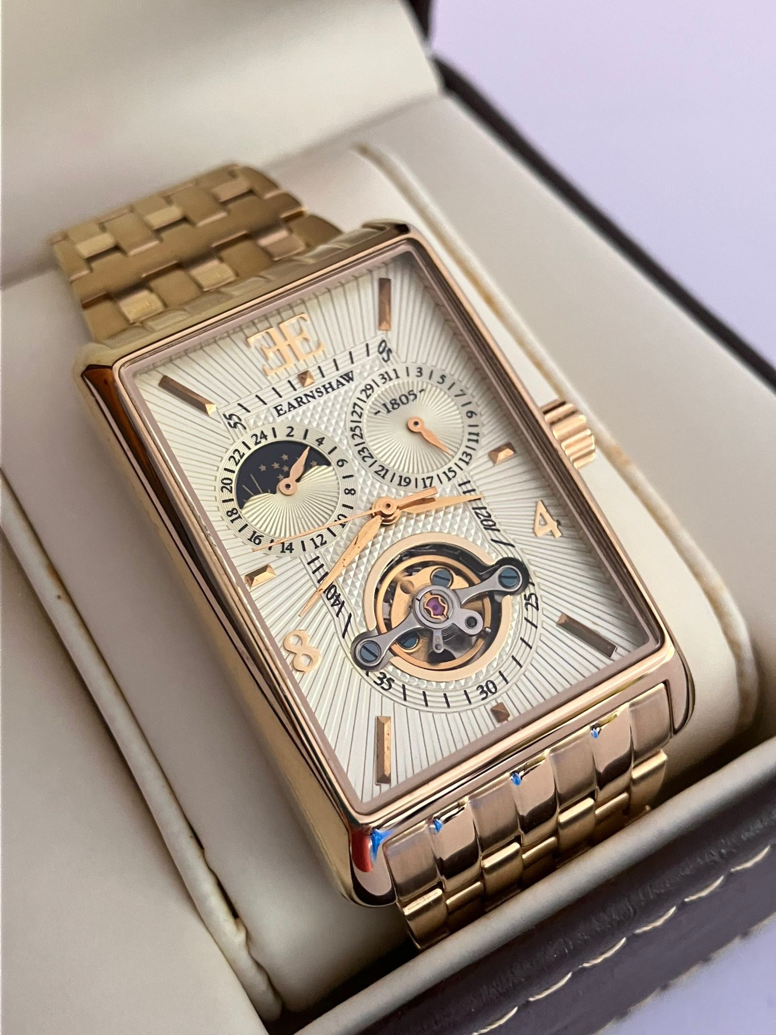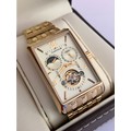 An Impressive THOMAS EARNSHAW AUTOMATIC CHRONOGRAPH WATCH. Large Tank Style. Moonphase Multi Dial with Skeleton Window to front and back. Finished in Gold Tone. Condition as new and unworn. Complete with original case and manual. Full working order. Please see pictures.