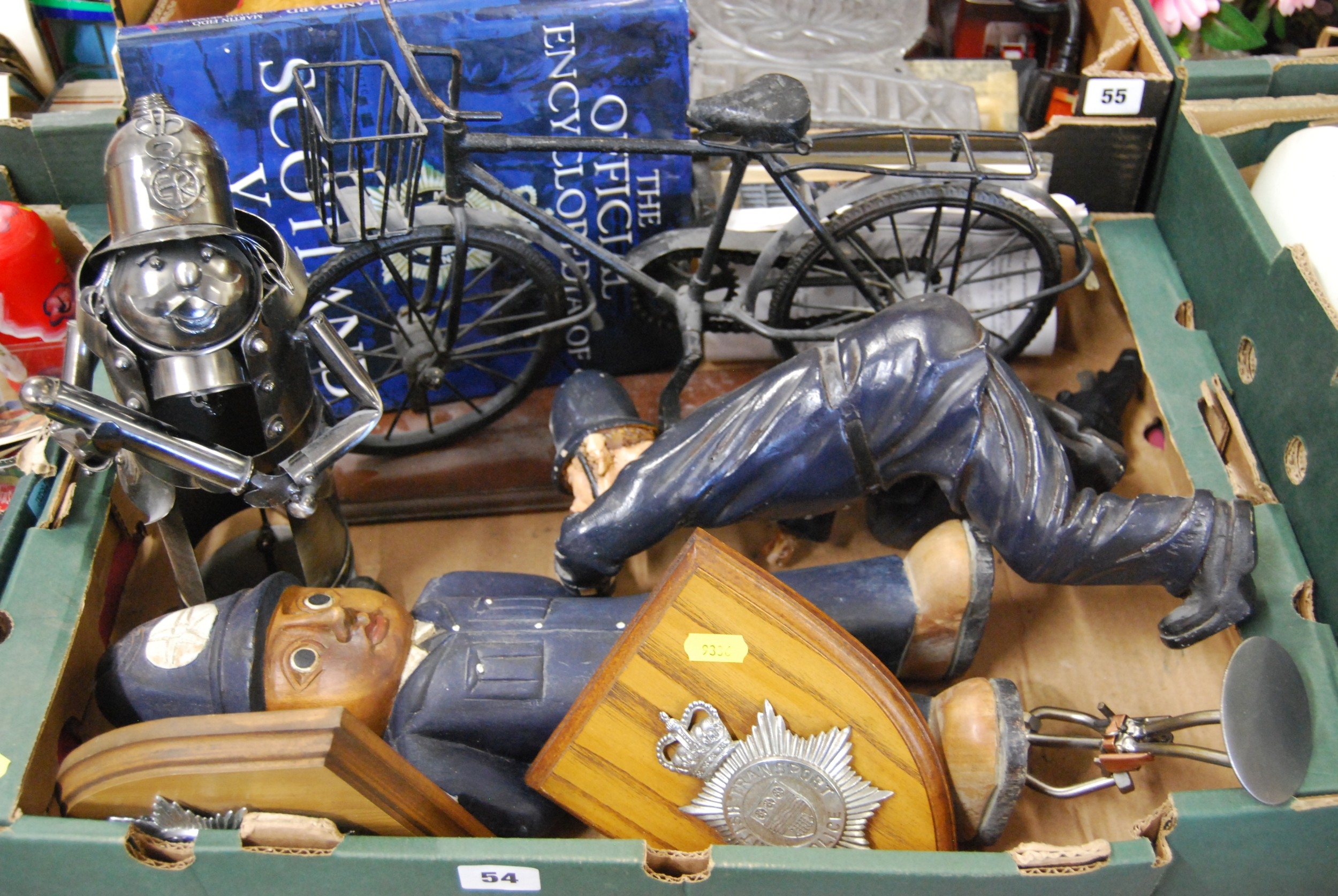 QUANTITY OF POLICE RELATED ITEMS INCLUDING FIGURES, BOTTLE HOLDER, SHIELDS, MODEL BICYCLE & BOOKS, ETC