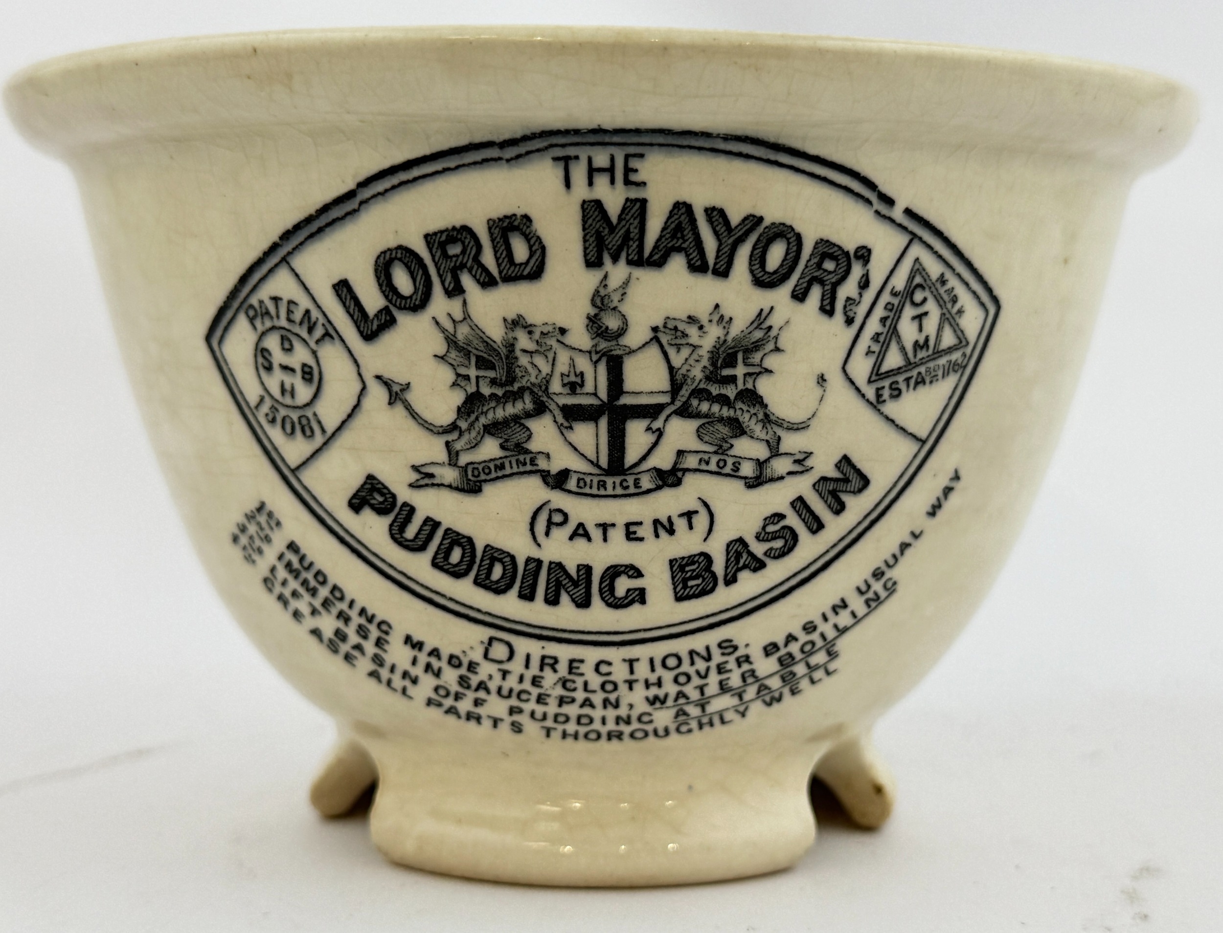 THE LORD MAYOR PATENT PUDDING BOWL. 3.5ins tall. Directions underneath coat of arms. Slight discolouration.