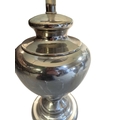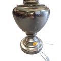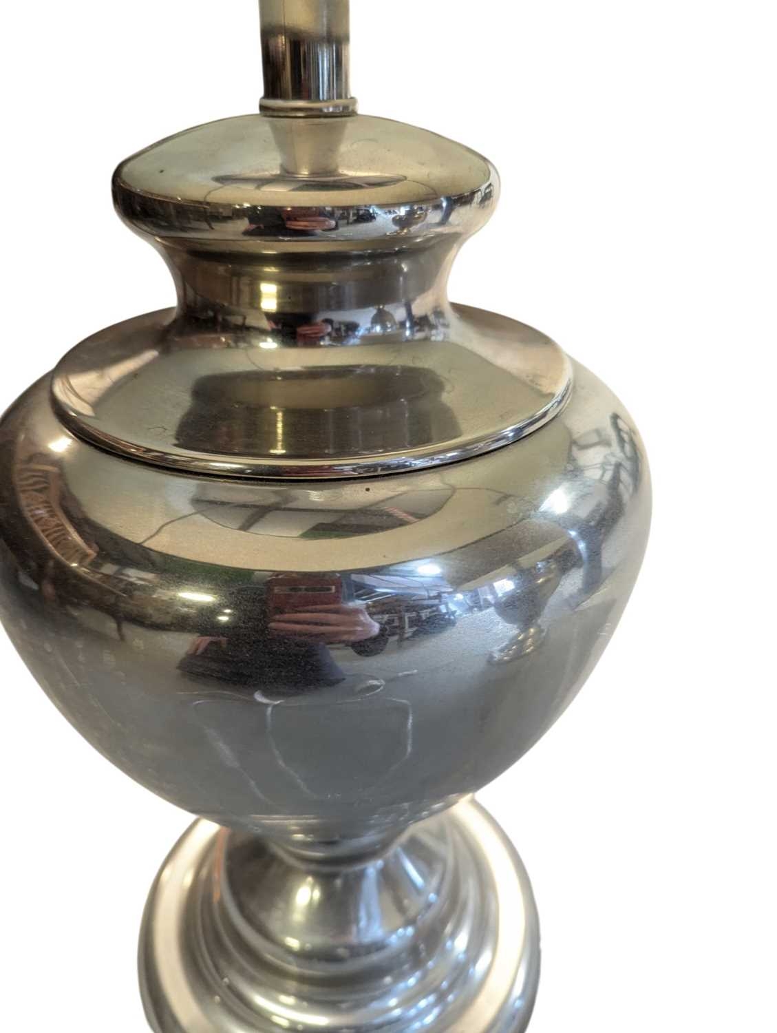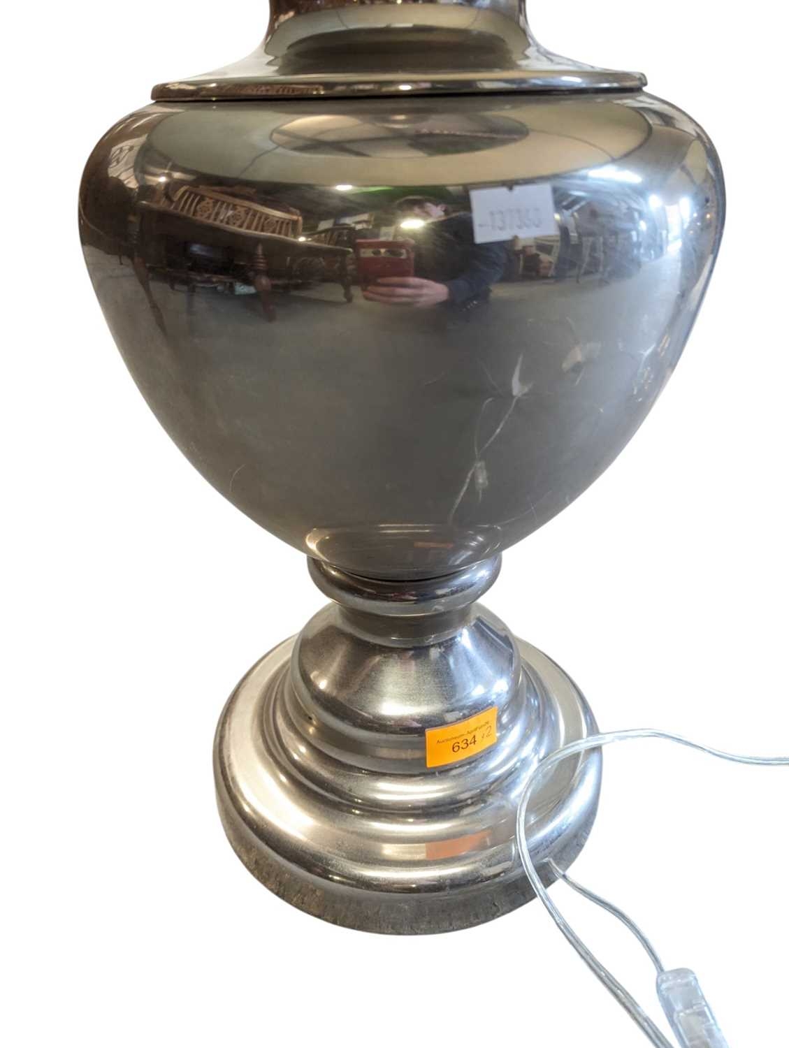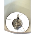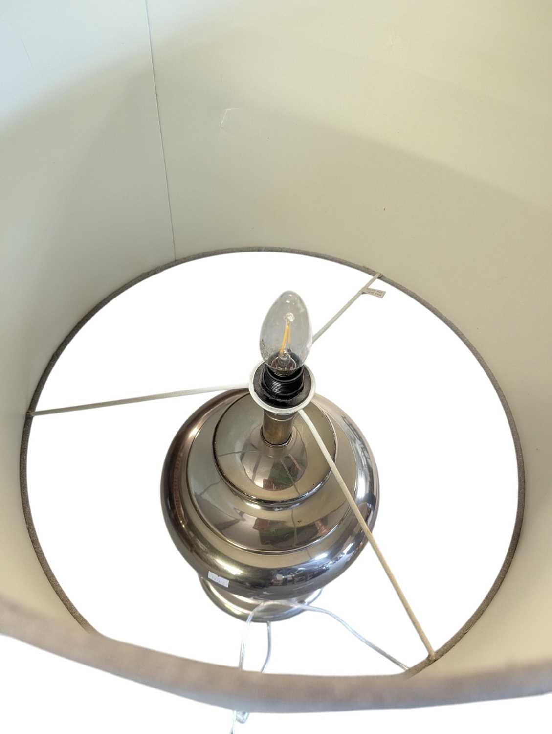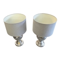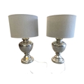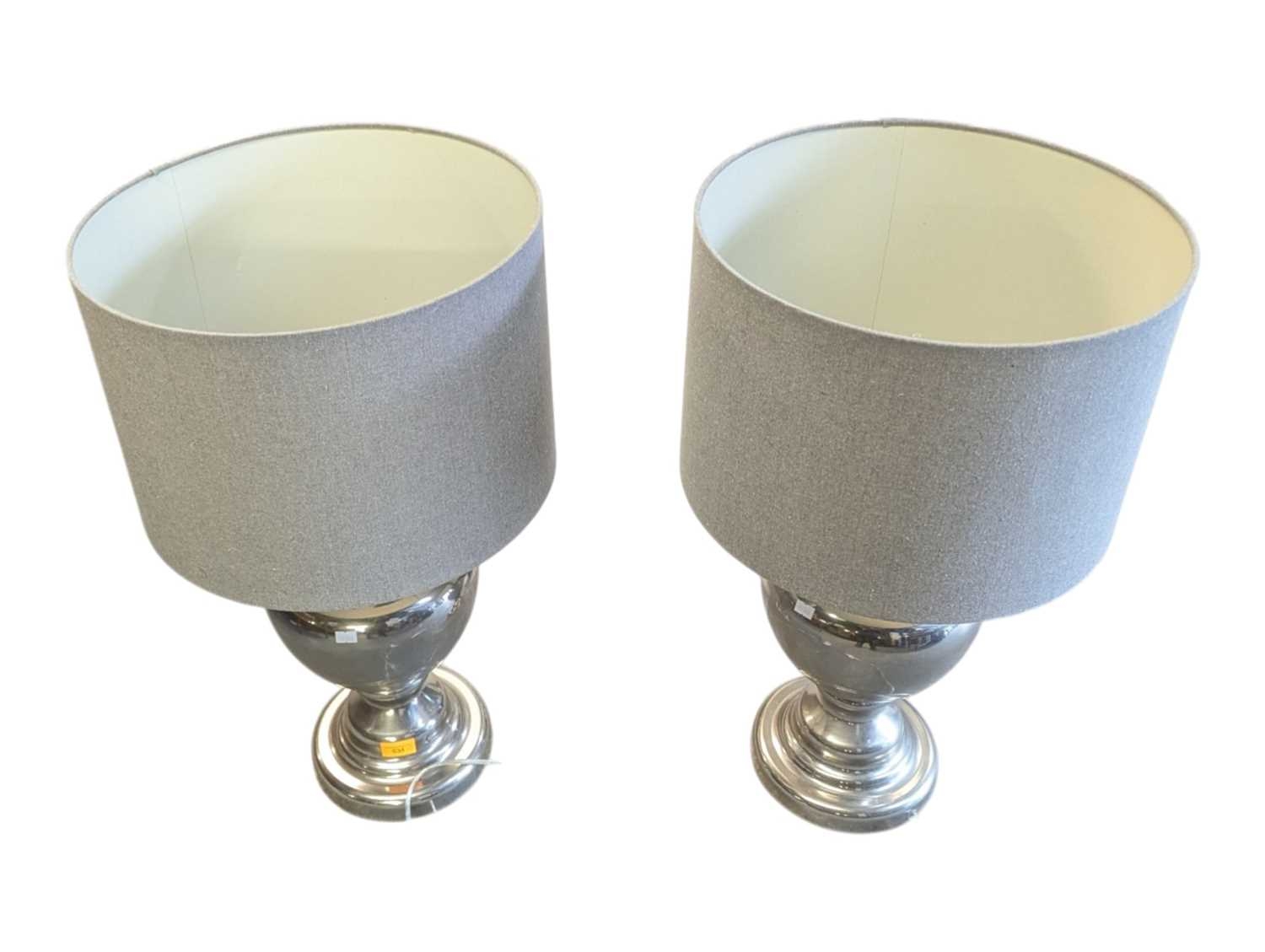 Pair of contemporary polished silver metal table lamps. Having grey conical shades on silver bulbous body on a tiered circular foot. Sold as untested.