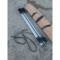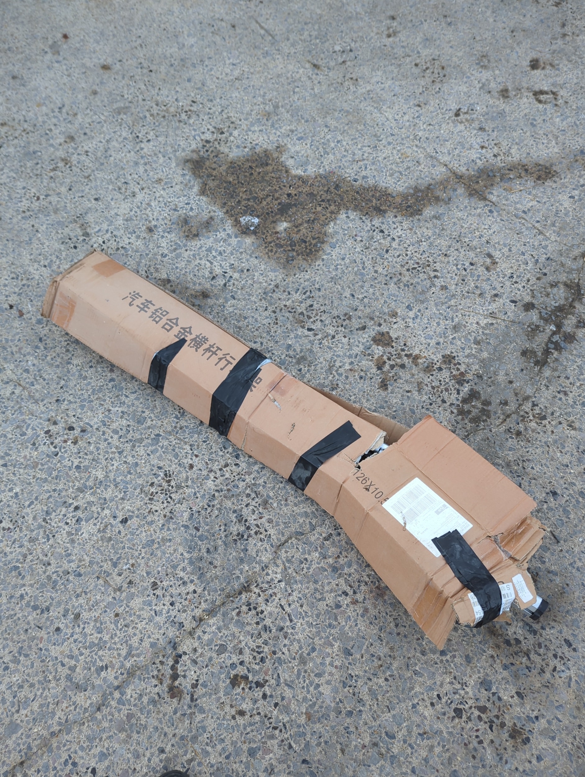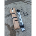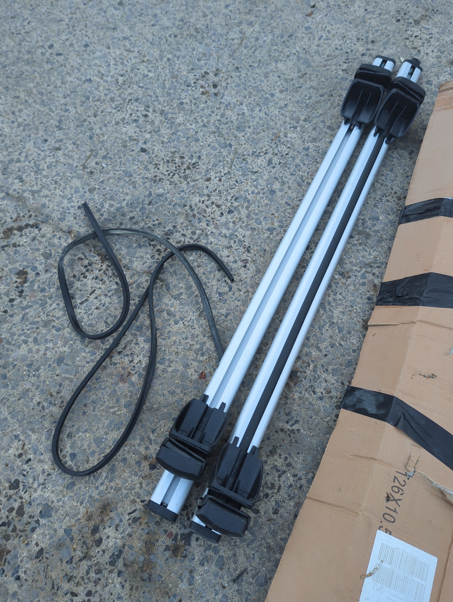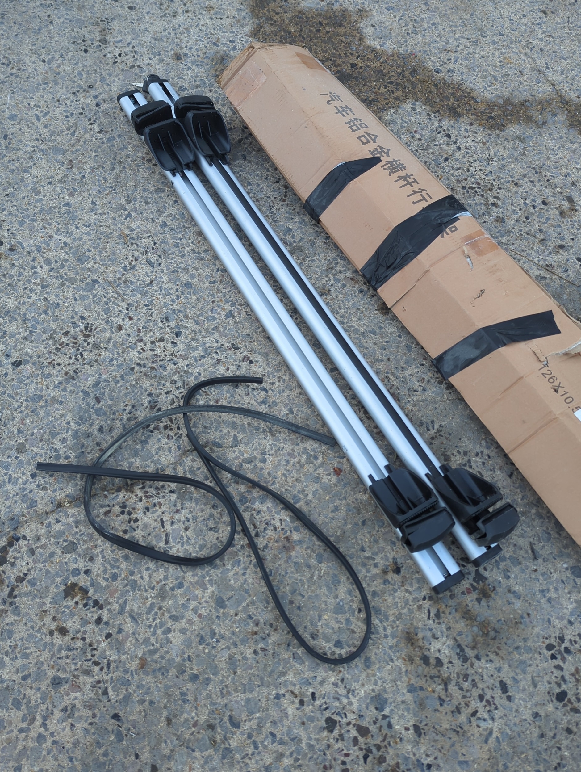 A pair of aluminium roof racks, suitable for vehicle use. The racks are lightweight and include black attachment clamps with accompanying straps for securing. They come with original packaging displaying foreign text. Ideal for carrying sports equipment or luggage on roof rails.