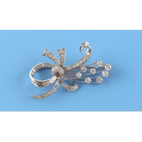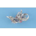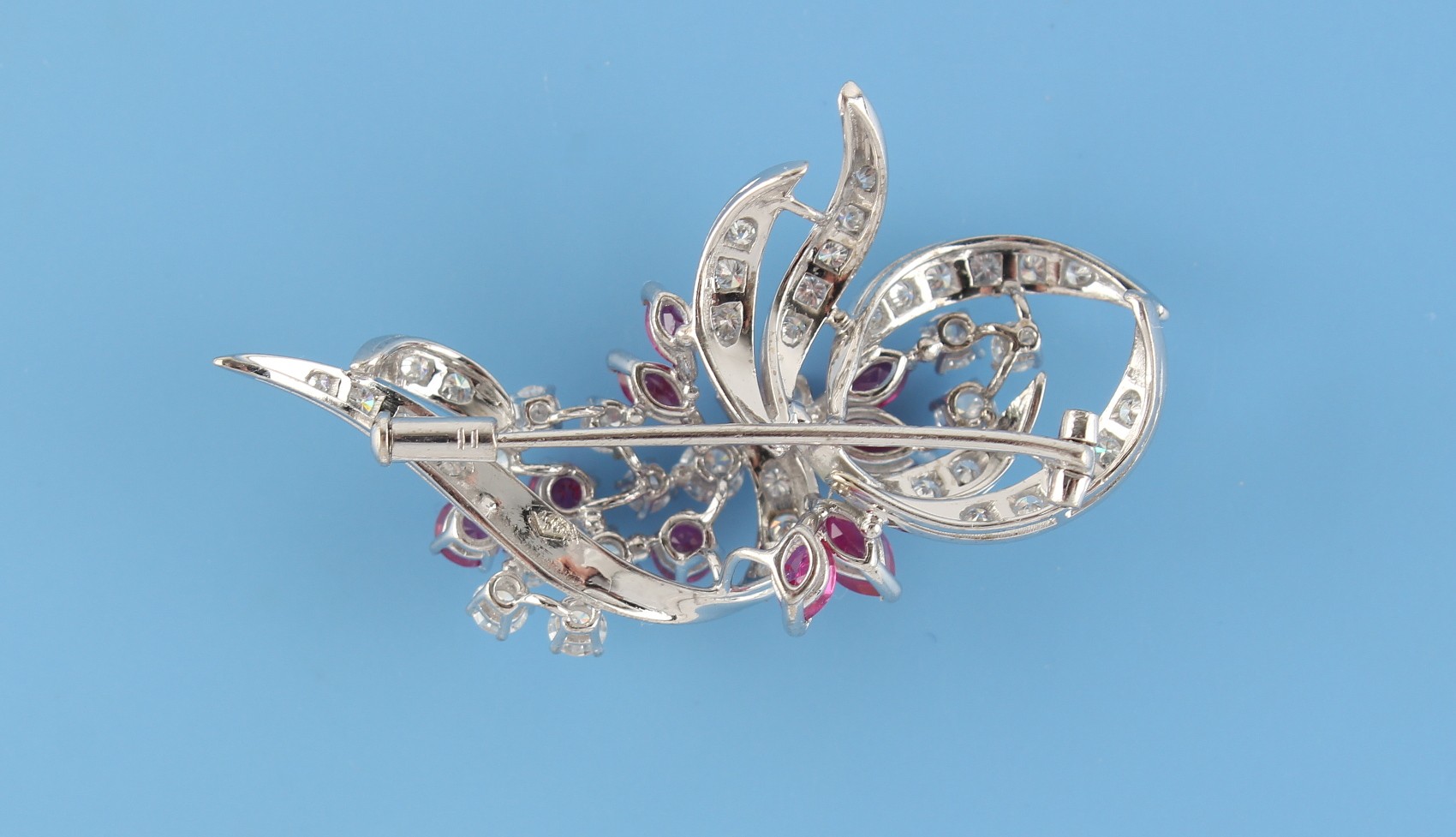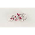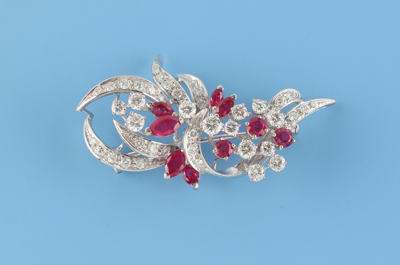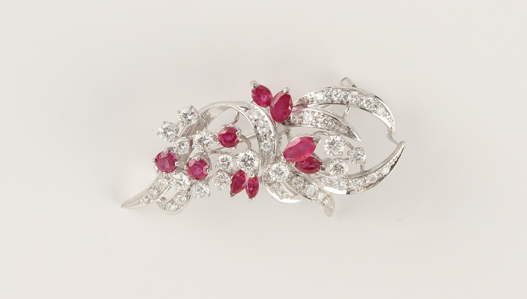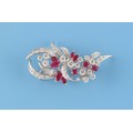 A platinum diamond & ruby floral brooch, set with six marquise shaped cut rubies, three round cut rubies and round brilliant cut diamonds, the total diamond weight approximately 2.20 carats, indistinct maker's mark, 48mm long.