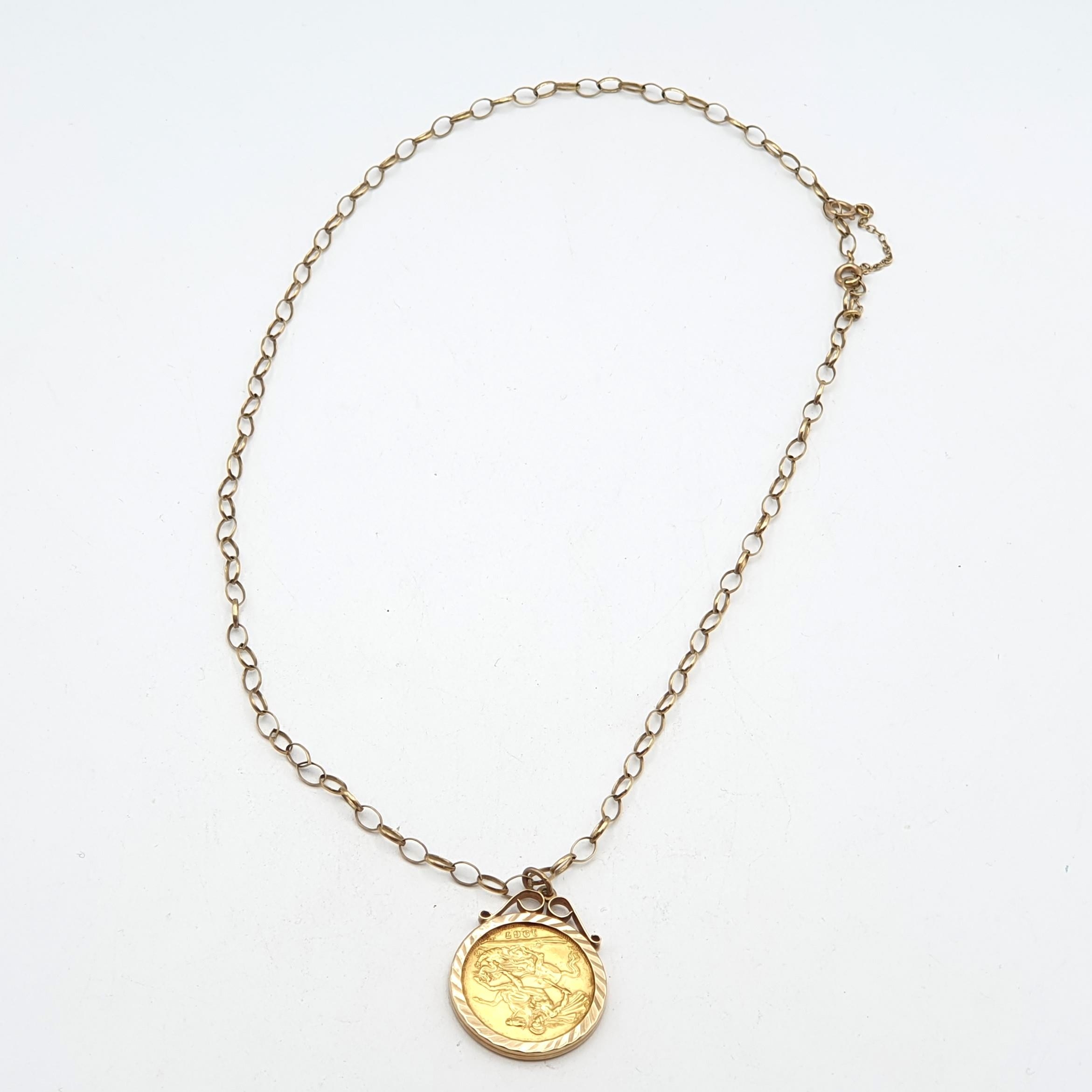 A 1967 QEII Sovereign in 9ct gold Pendant Mount on a 9ct gold open link Belcher Chain, approx 13.8gms