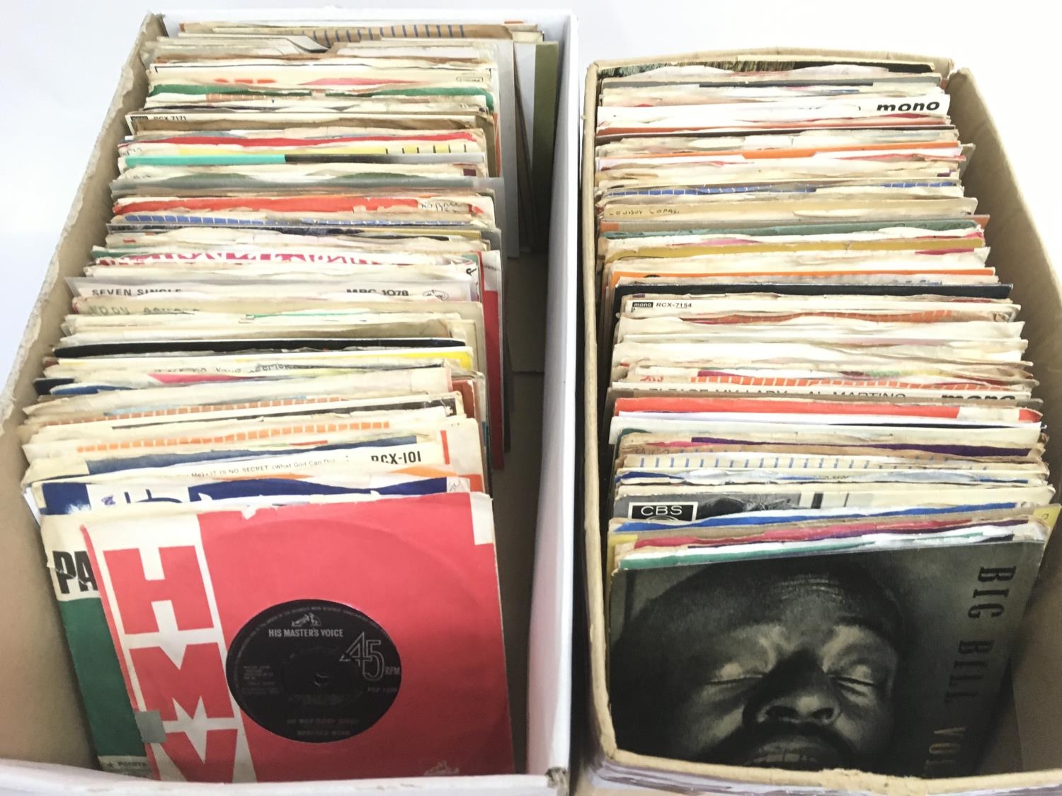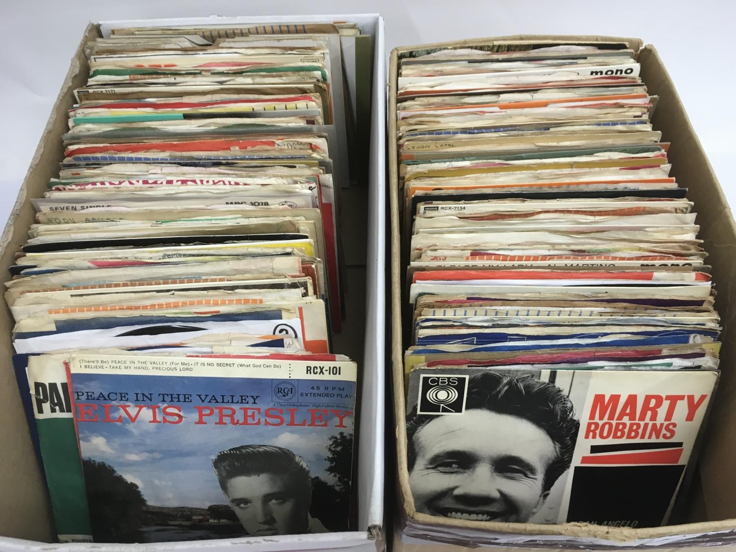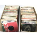 Two boxes of 1950s/60s 7 inch singles and EPs including gold labels, London labels etc.