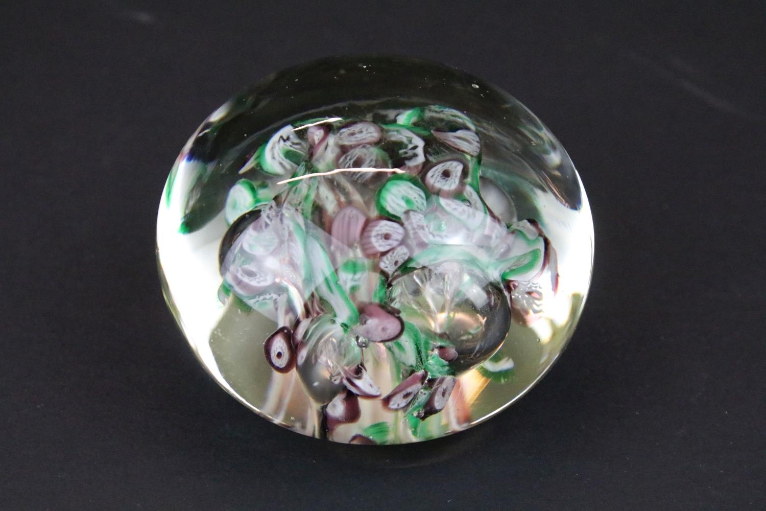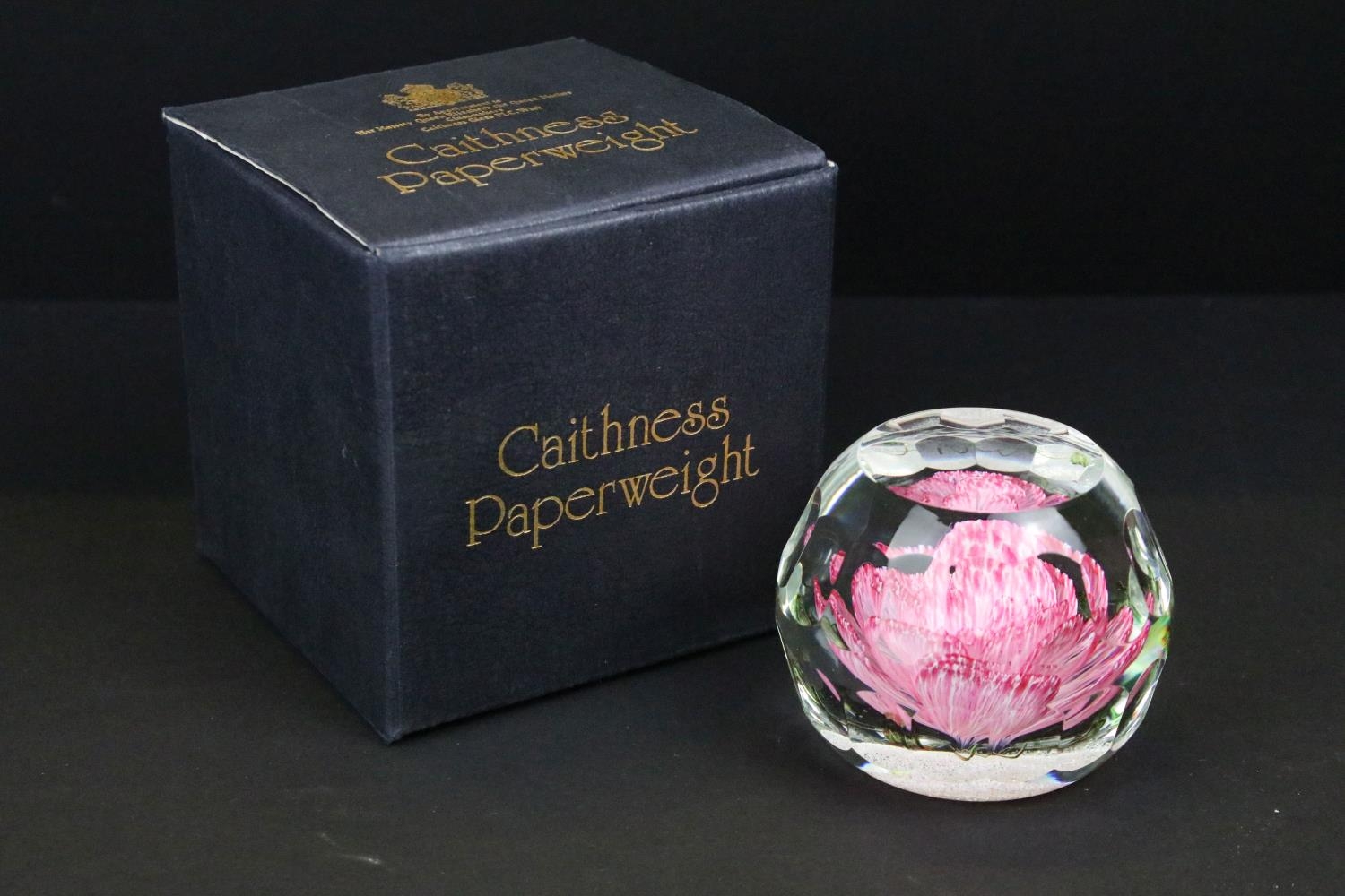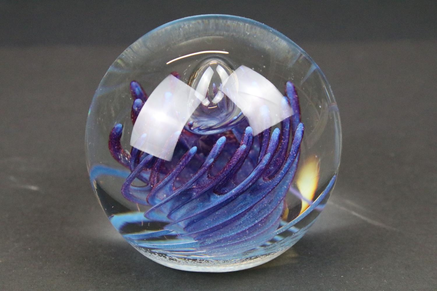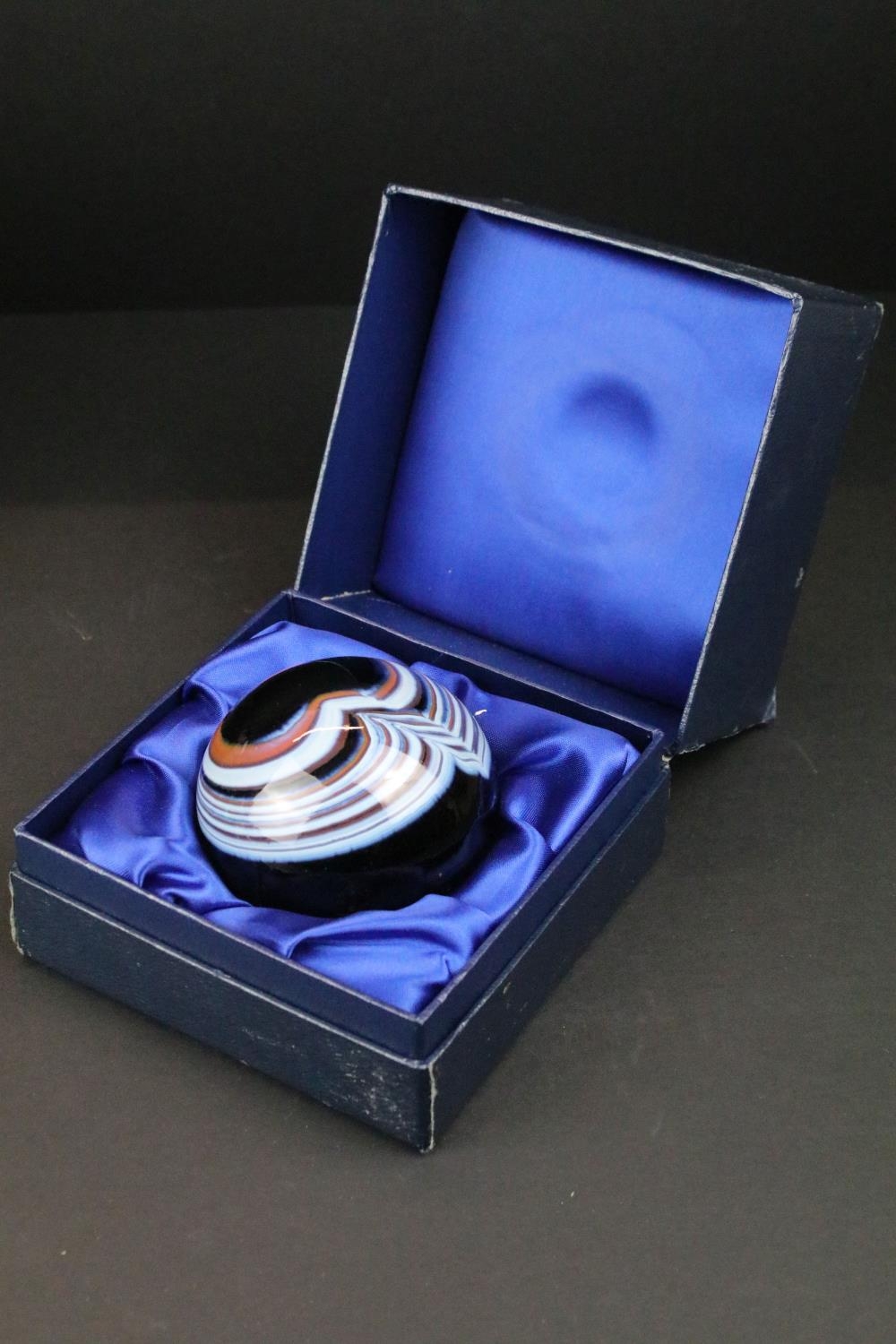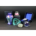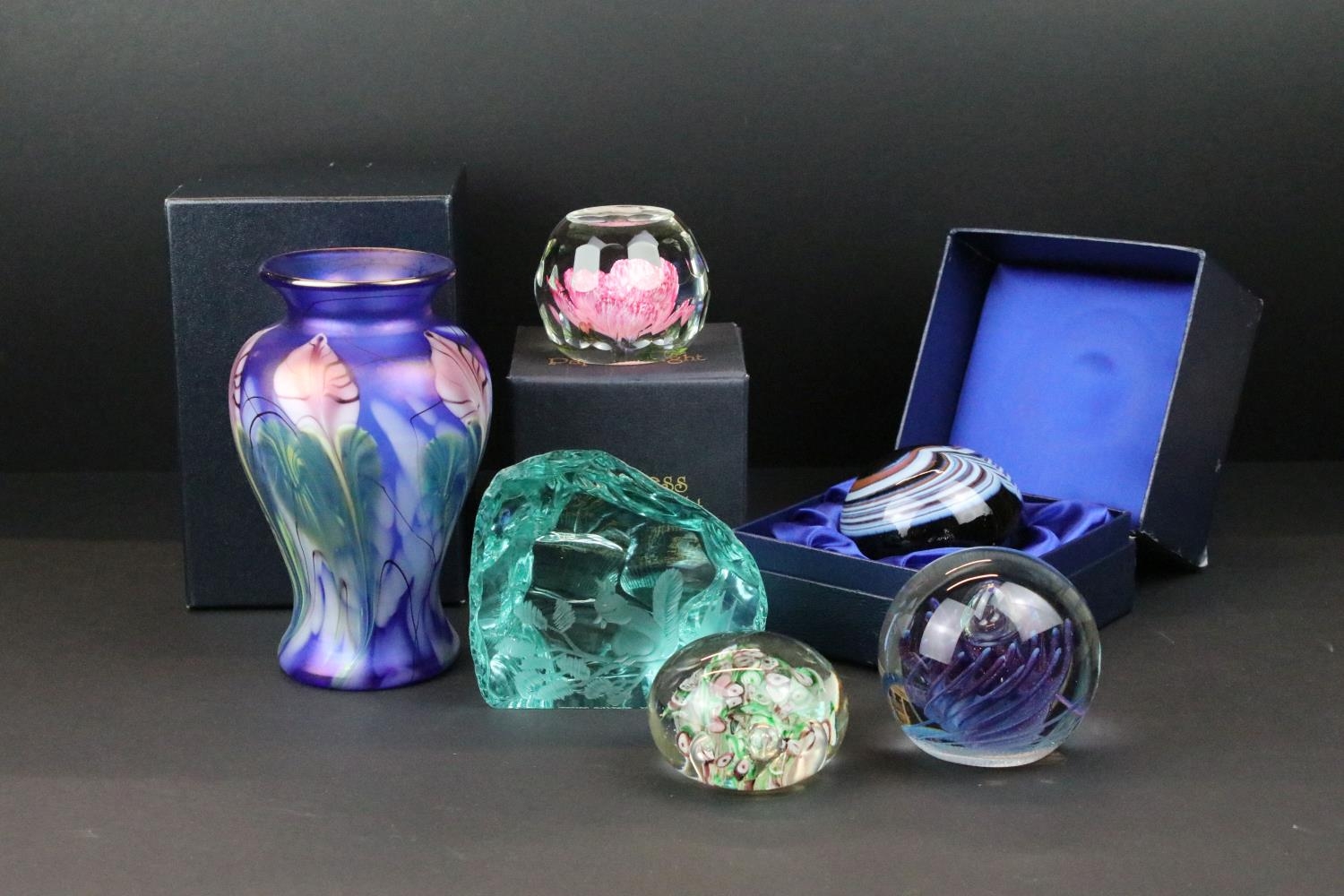Group of 20th century glassware to include an Okra vase (boxed, approx 16.5cm high), Swedish glass paperweight (signed), Caithness 'Zest' paperweight, etc