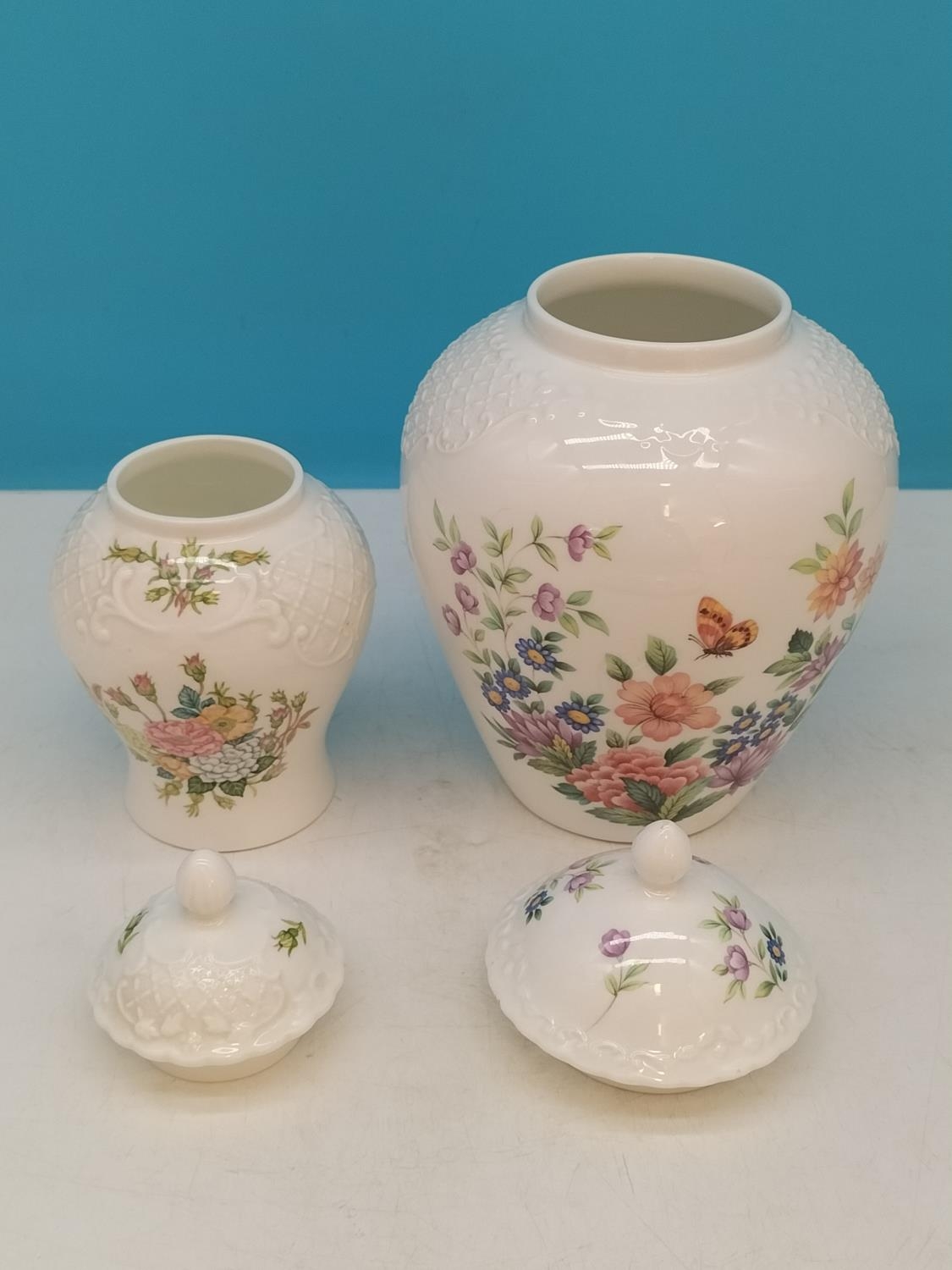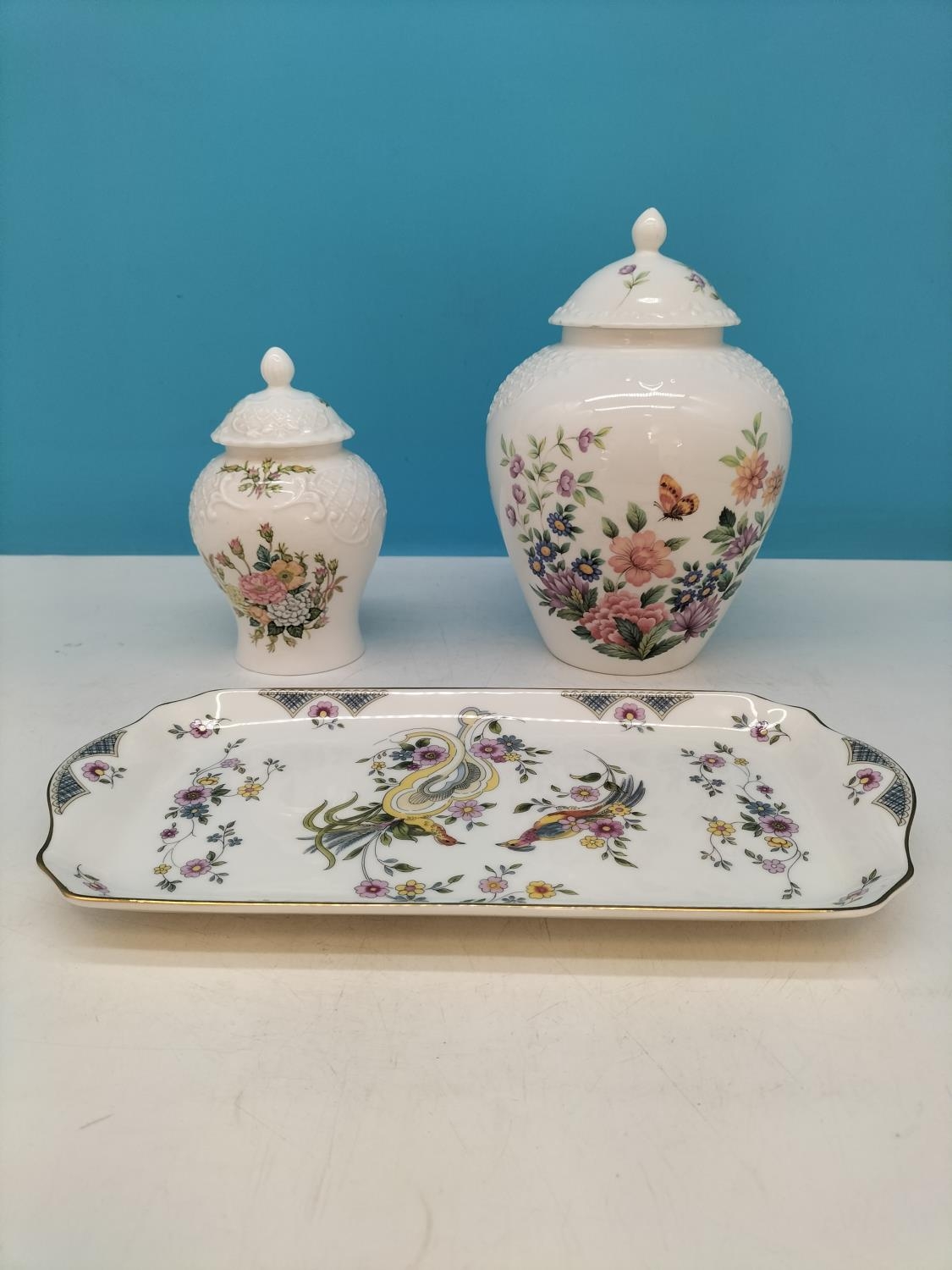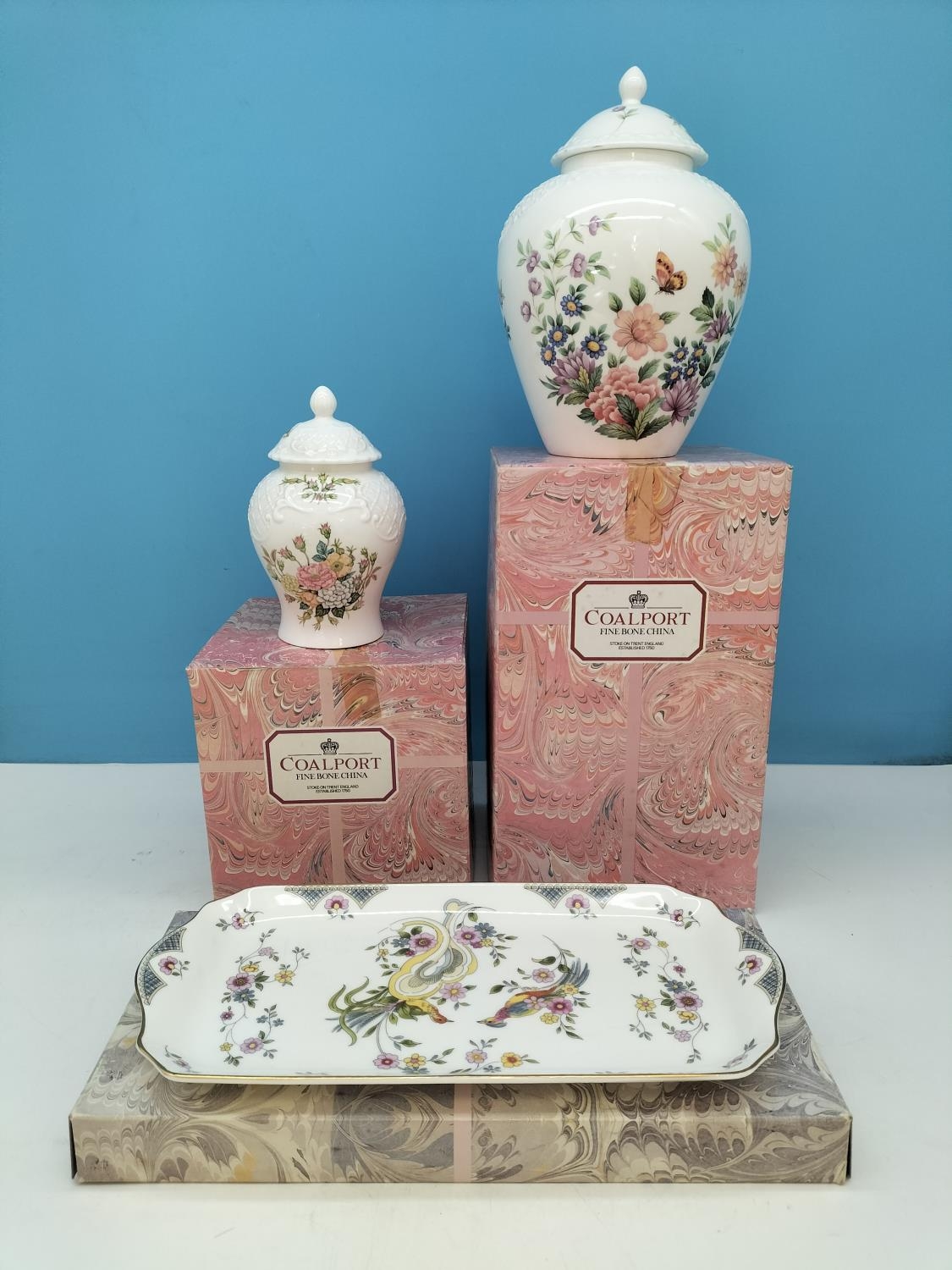 Boxed Coalport Items (3) to include 'Mayfield' 21cm Ginger Jar, 'Rose Garden' 15cm Ginger Jar plus 'Paradise' Sandwich Tray 29cm x 14cm.