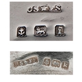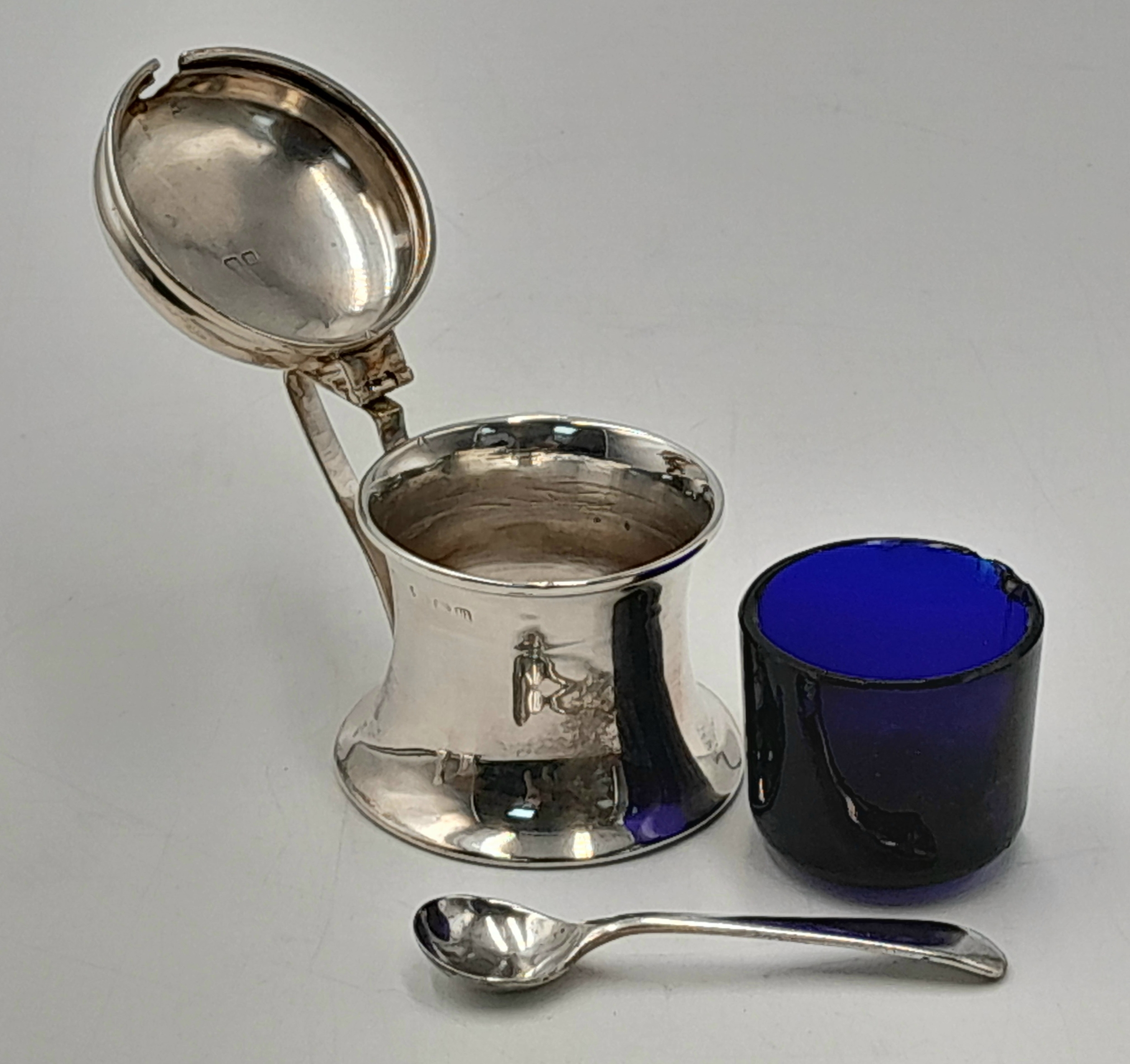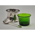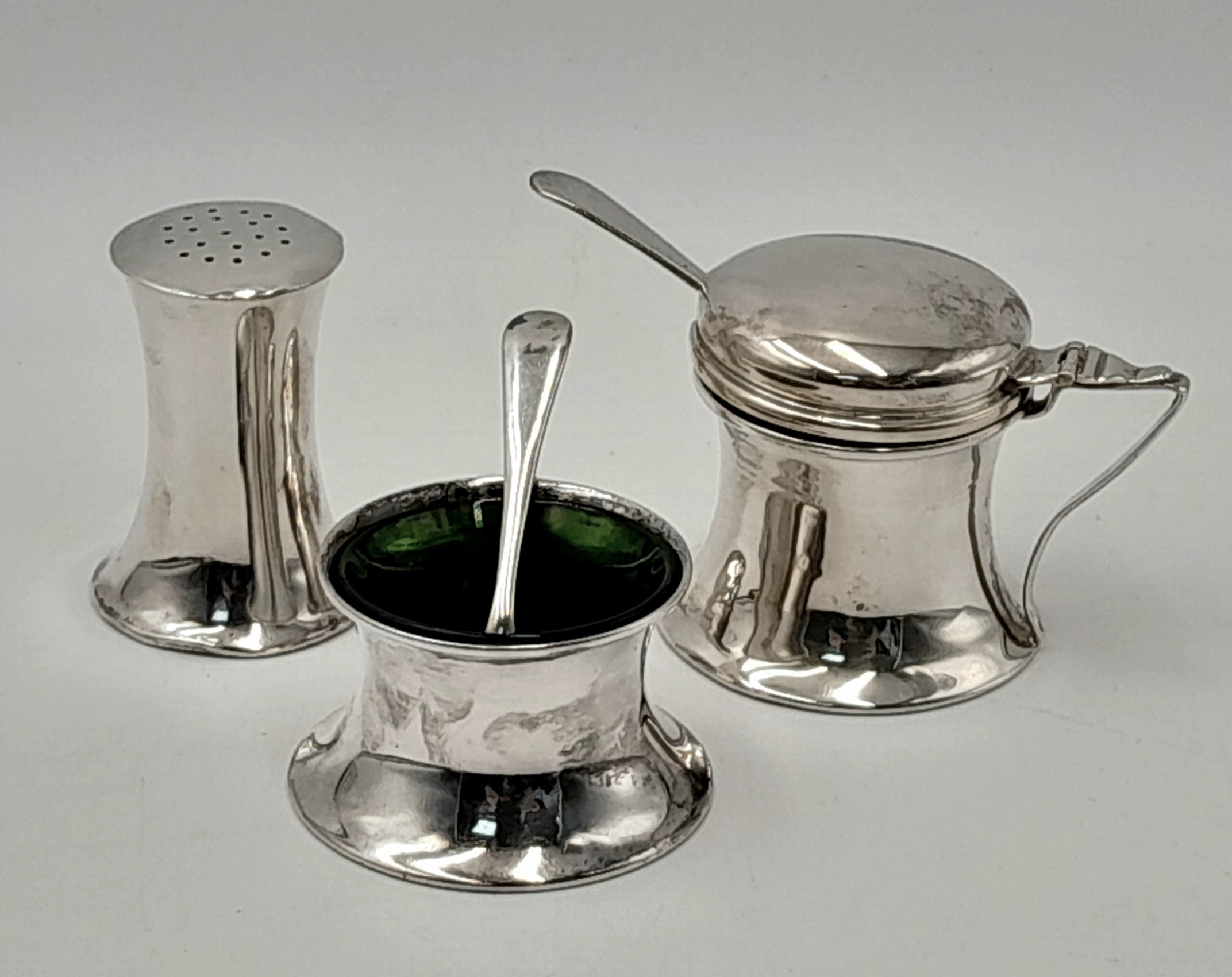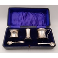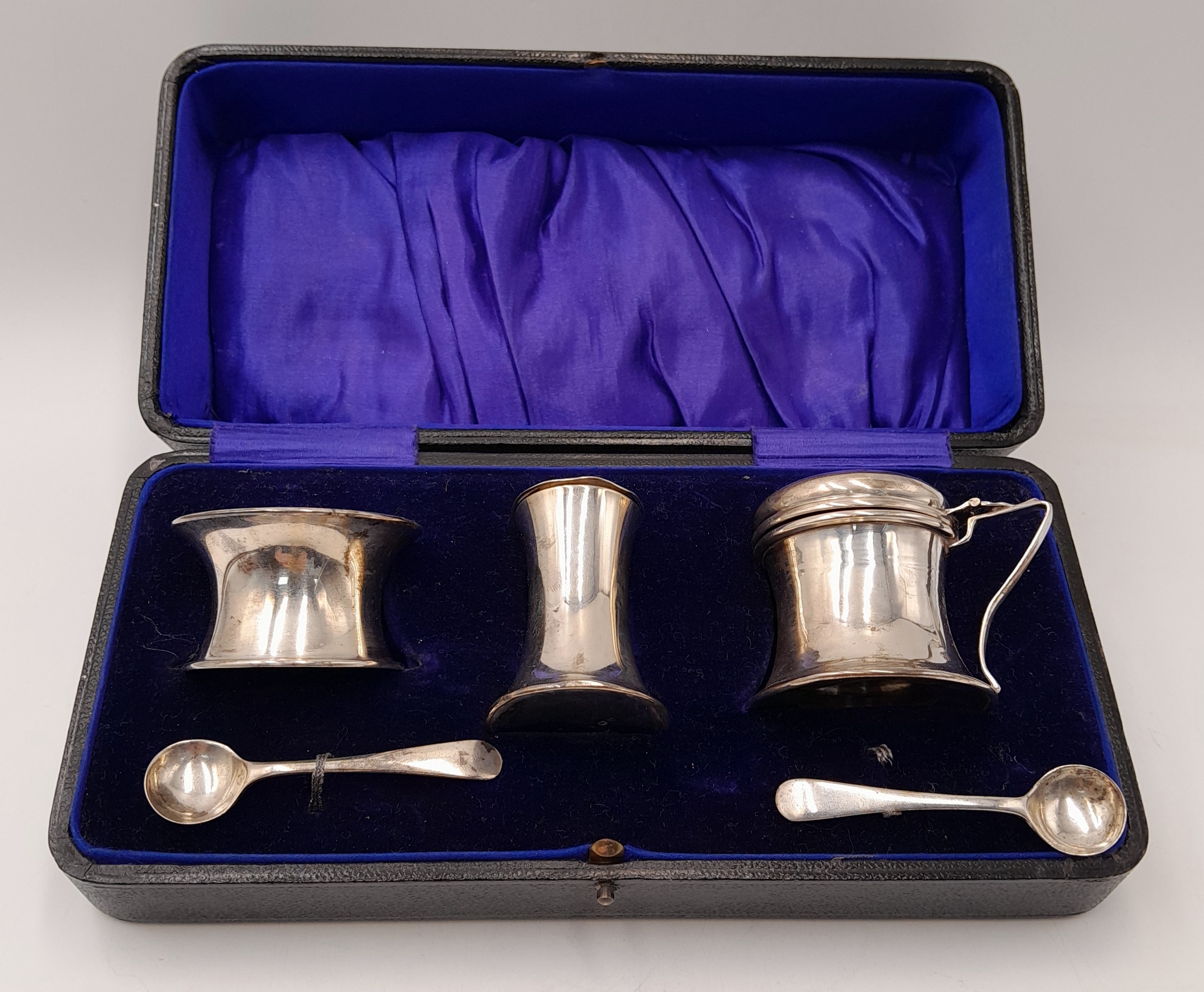 AN ANTIQUE SILVER CONDIMENT SET DATED 1911 COMPRISING OF 2 SILVER SALTS WITH SPOONS AND GLASS LINERS PLUD A SALT CELLAR AND COMING IN THE ORIGINAL CUSTOM MADE CASE .