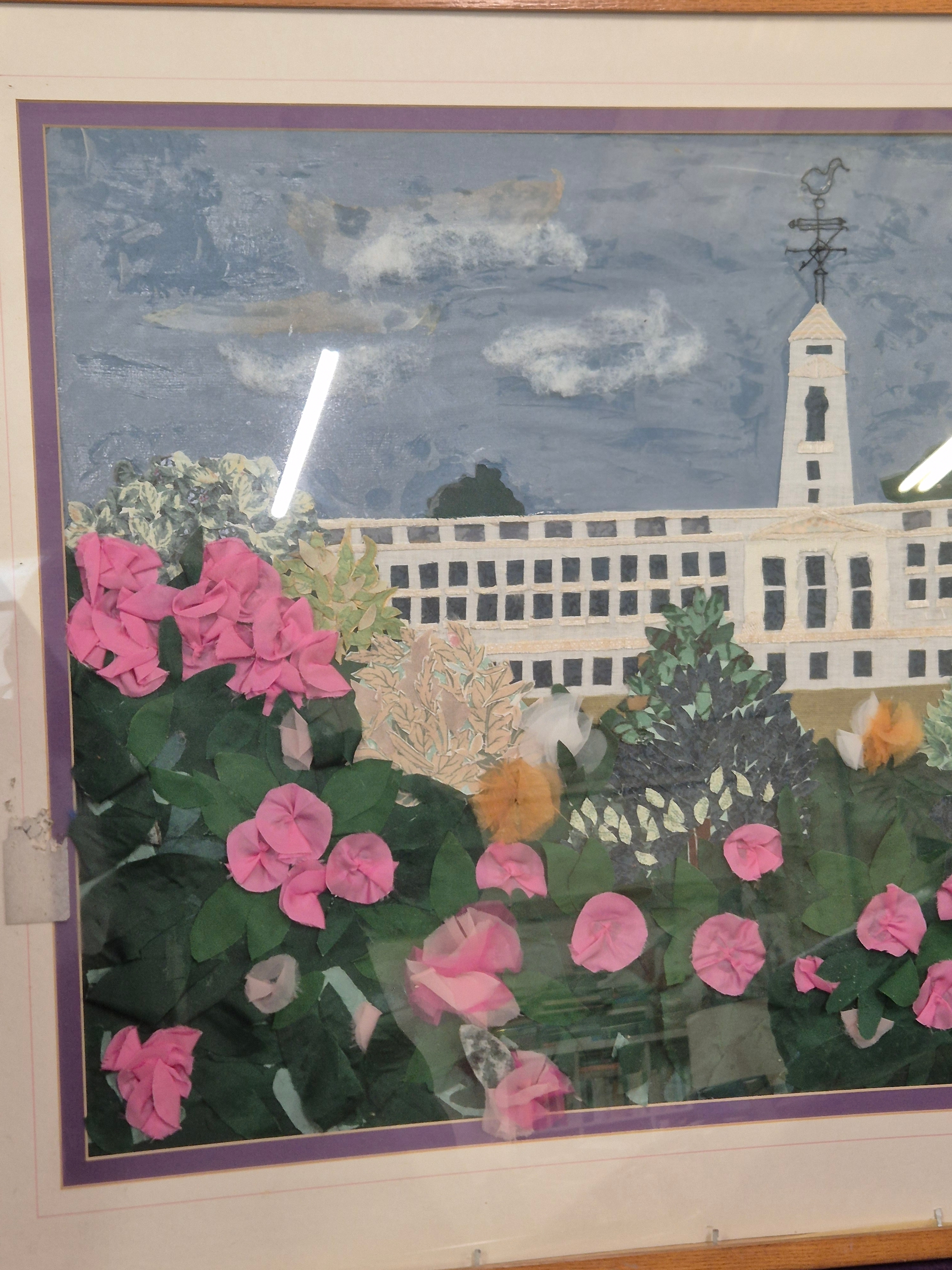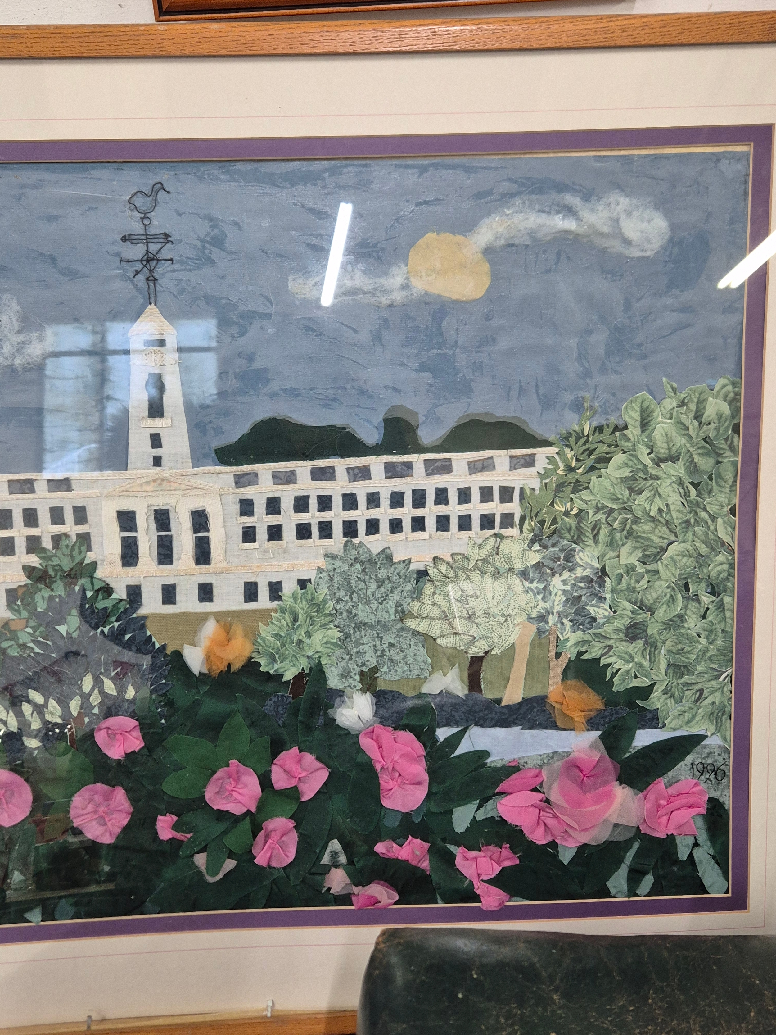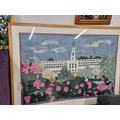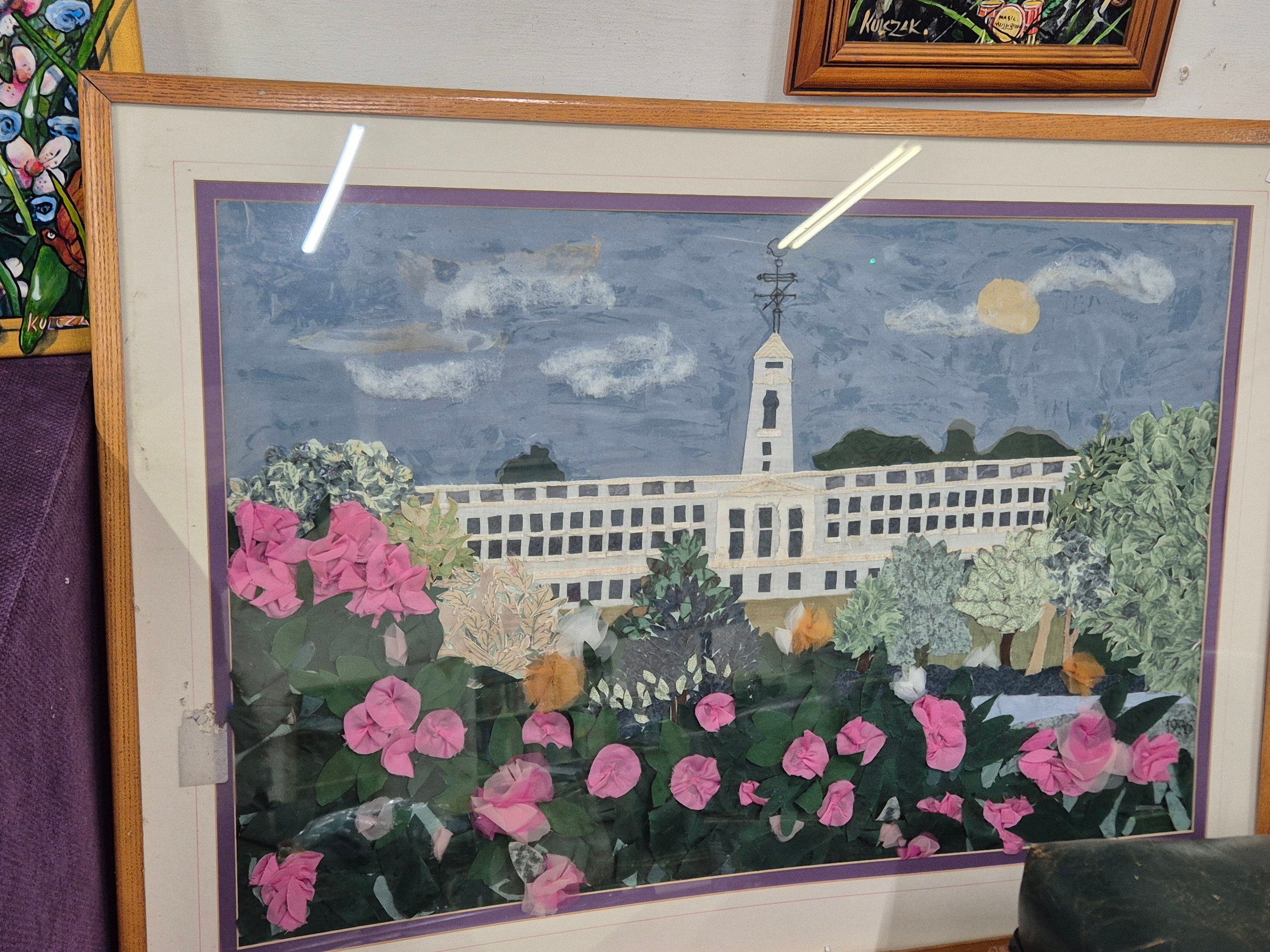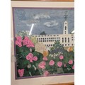 Decoupage 3D artwork of a large building, framed and glazed 97cm x 70cm