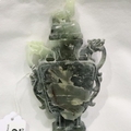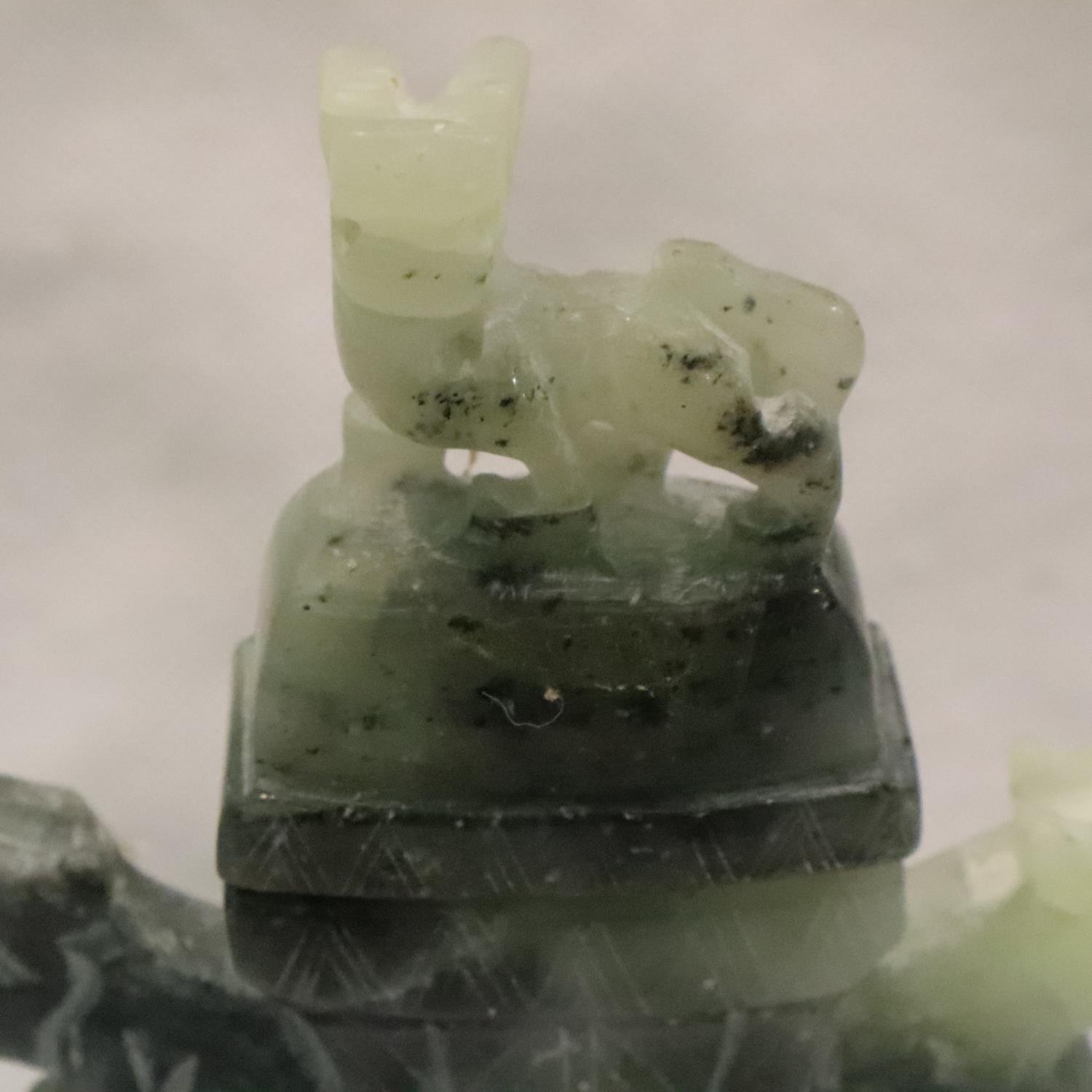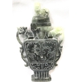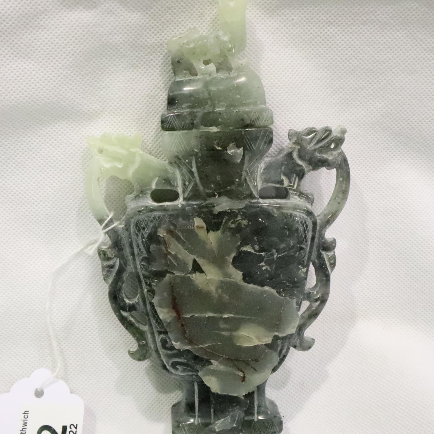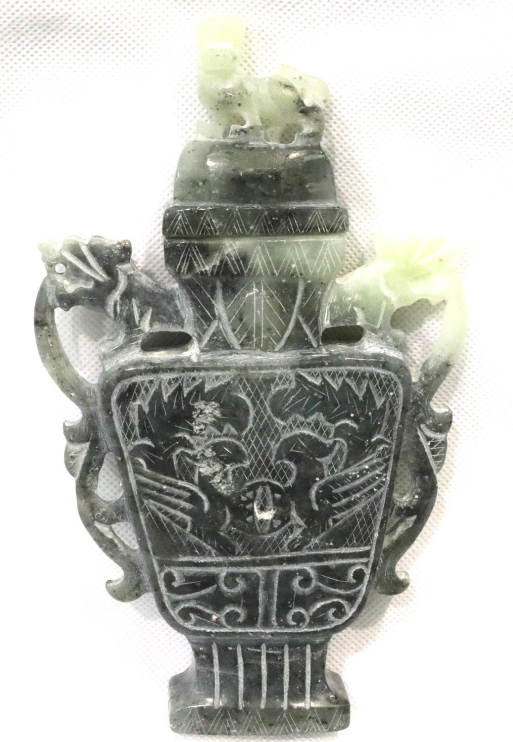Carved blue jade Chinese flat vase with Fo Dog decoration, H: 17 cm. Good aged condition but does have glue residue to the back. P&P Group 2 (£18+VAT for the first lot and £3+VAT for subsequent lots)