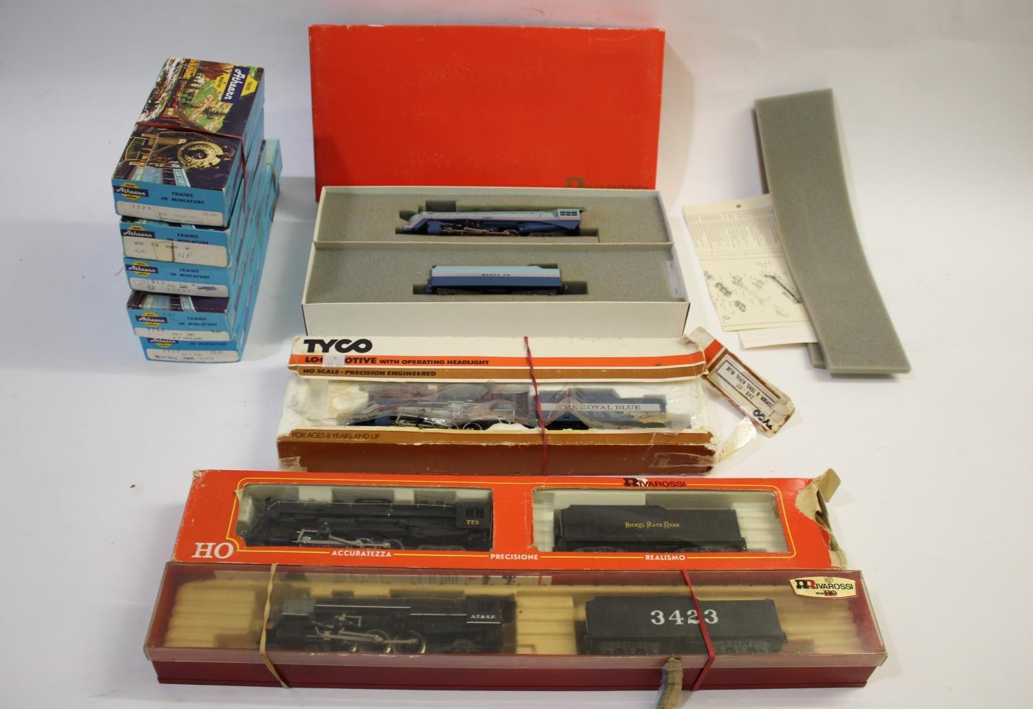 HO GAUGE LOCOMOTIVES boxed and unboxed examples including boxed Rivarossi 1244 Nickel Plate Road, boxed 1283 Atchison Topeka & Santa Fe, boxed 1583 Blue Goose 3460, Athearn boxed models (3229 Northern Pacific, 3366 Southern etc), and various other models.