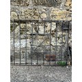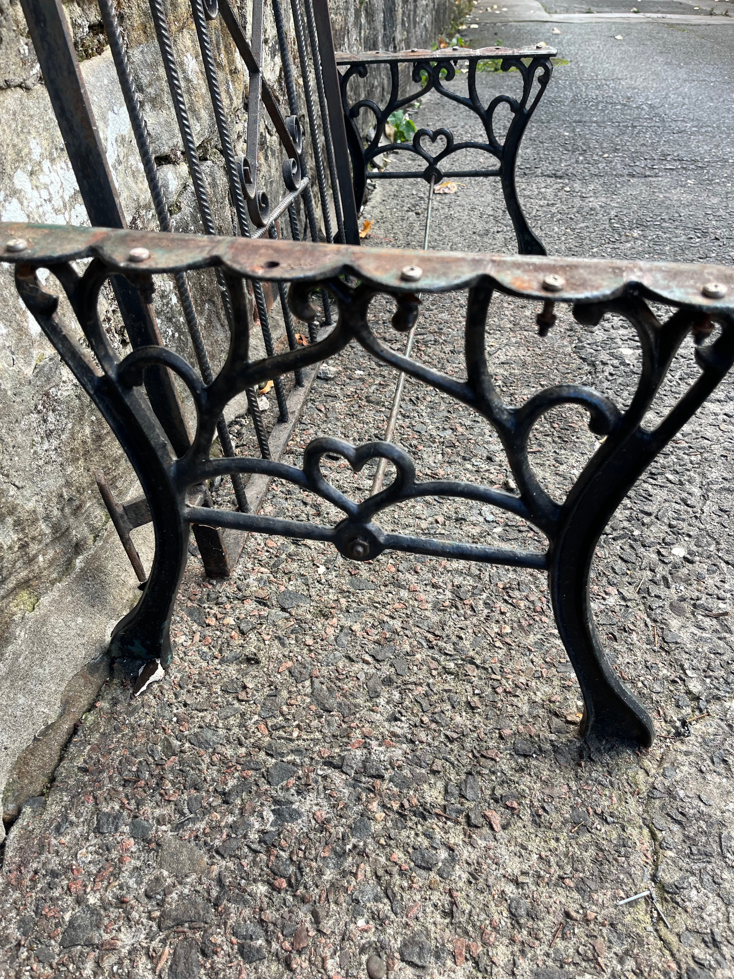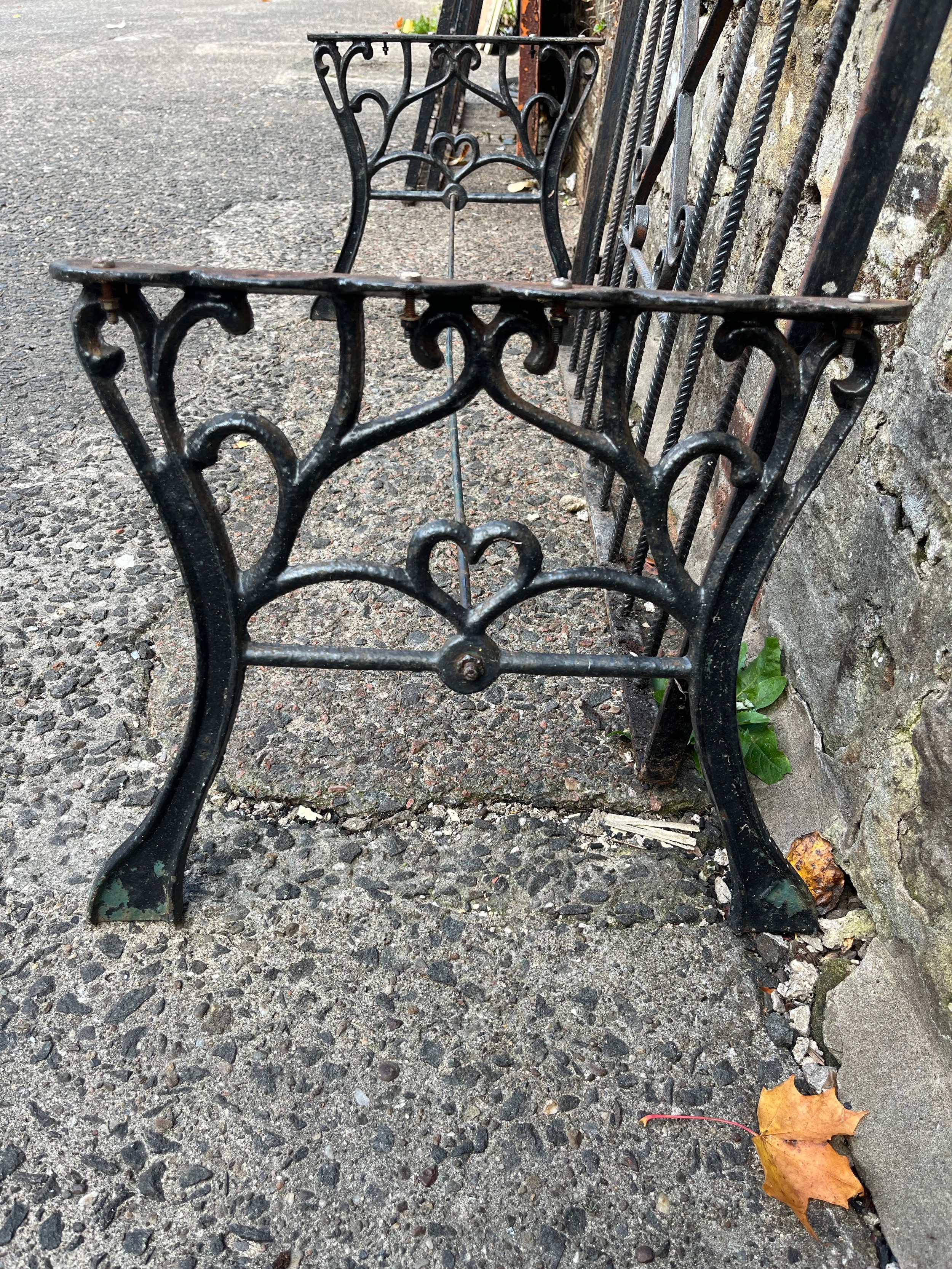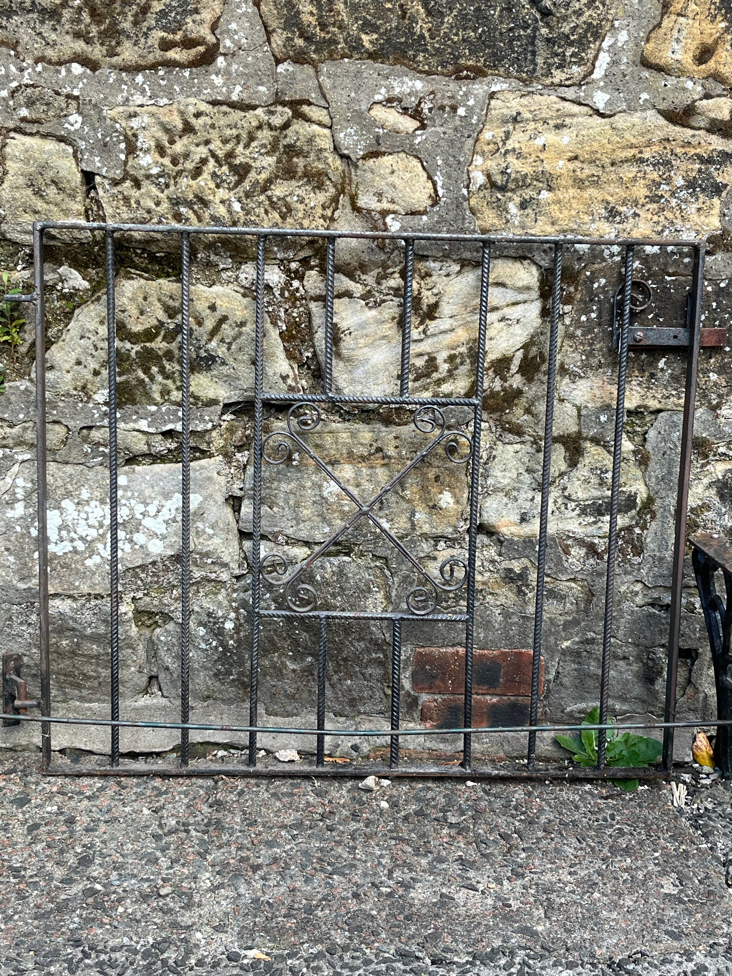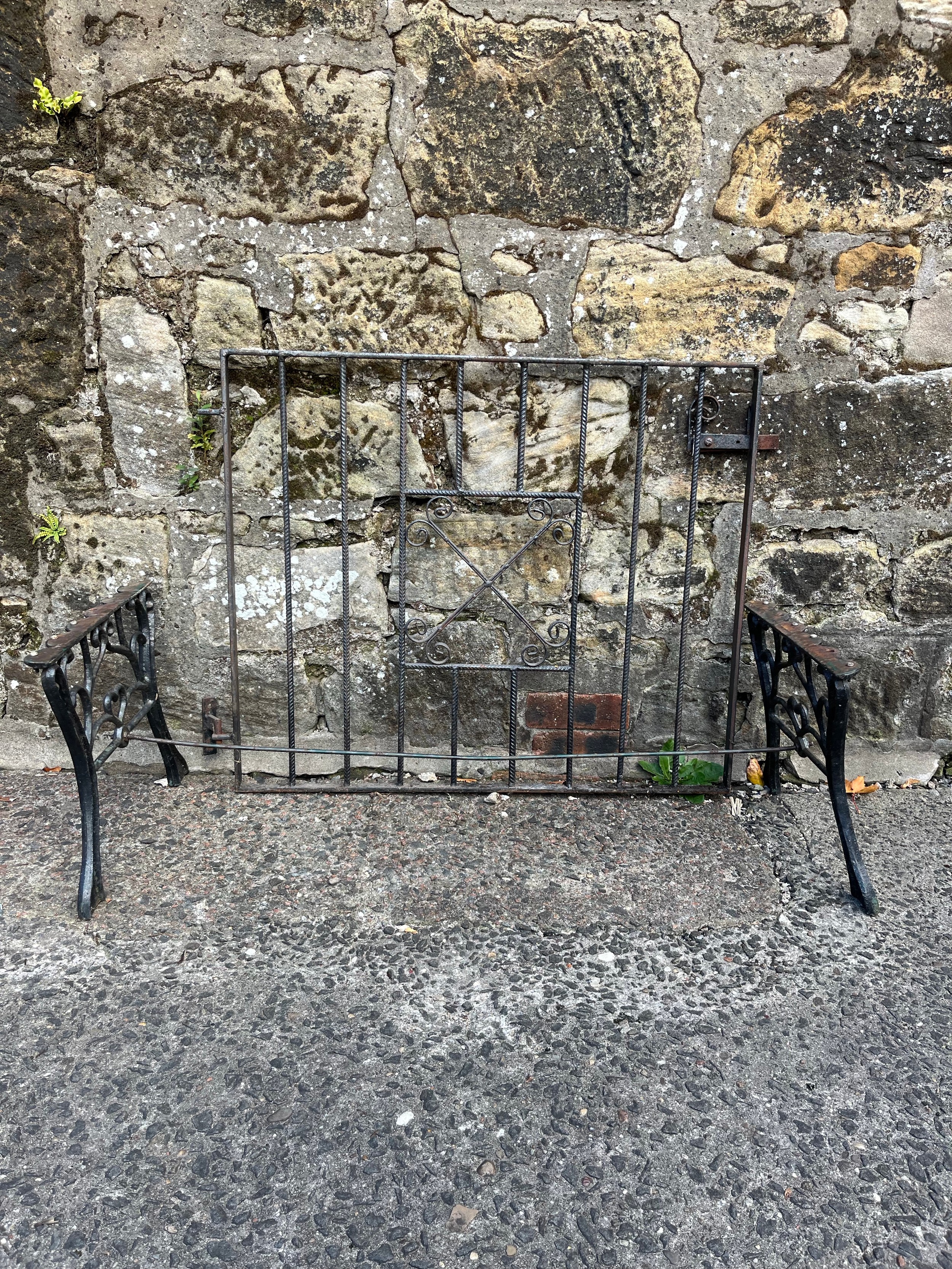 Pair of ornate cast iron table legs along with vintage wrought iron garden gate, 35.5x30"