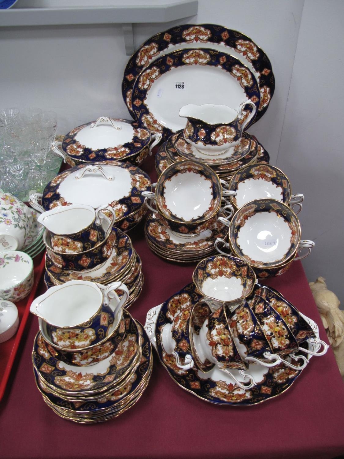 A c.1920's Royal Albert 'Heirloom' Pattern Dinner and Tea Service, comprising two meat plates, two lidded tureens, sauce boat and stand, six dinner plates, six medium and six side plates, six soup bowls and stands, cake plate, ten tea plates, nine saucers, six cups and two milk jugs and sugar bowls.