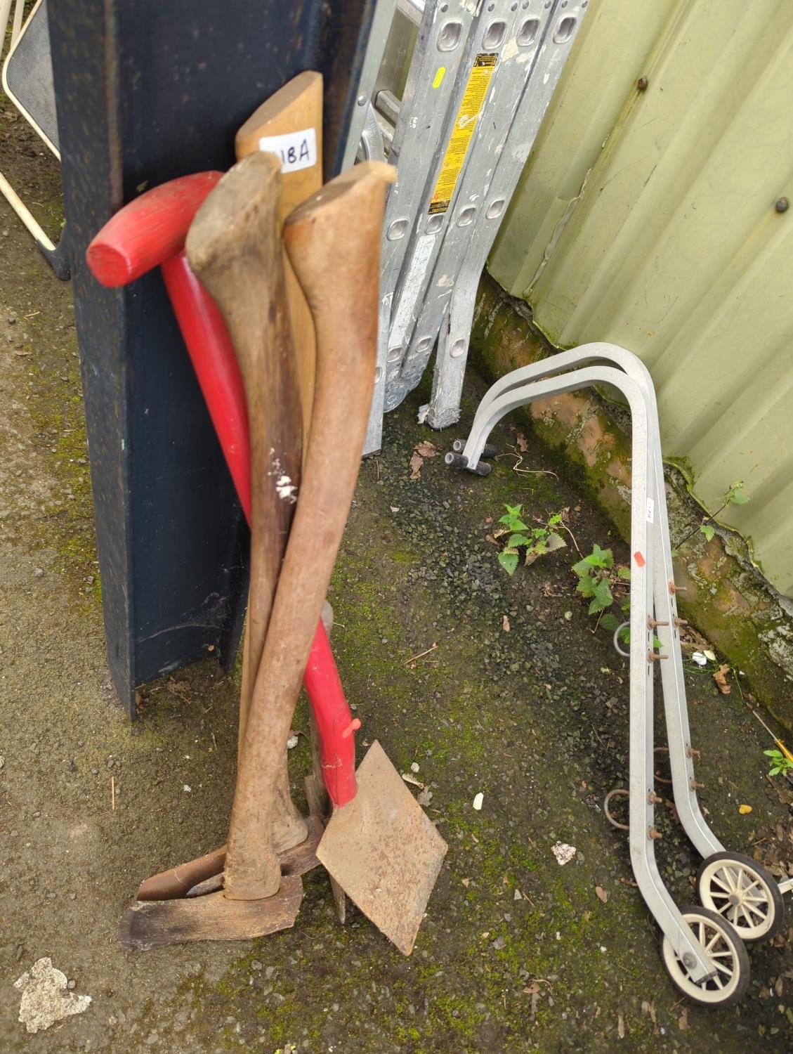 3 x axes, 1 x garden spade, 1 x hatchet.