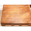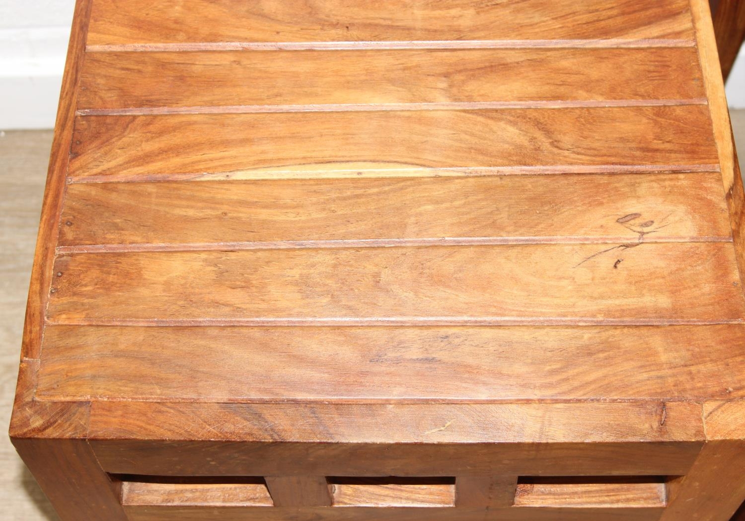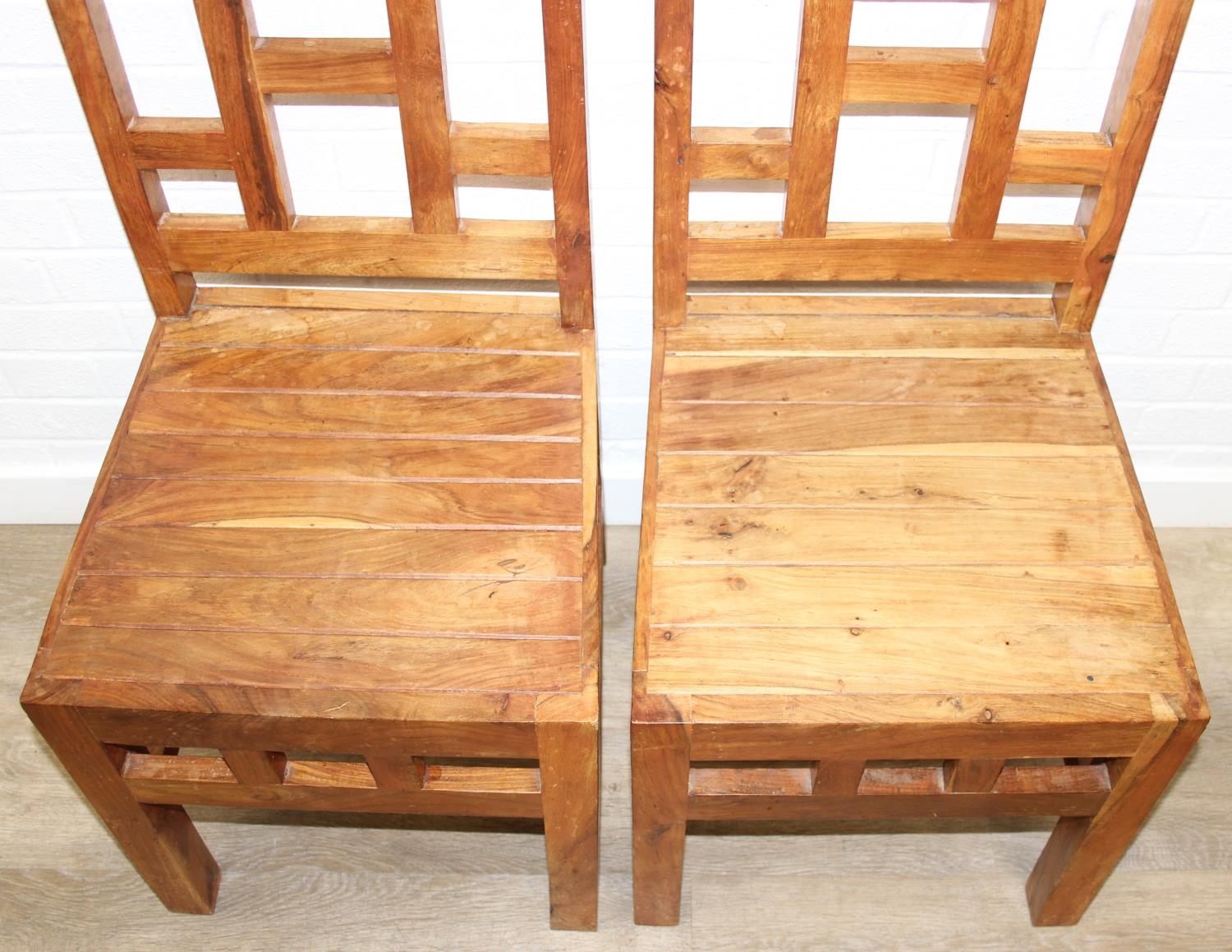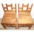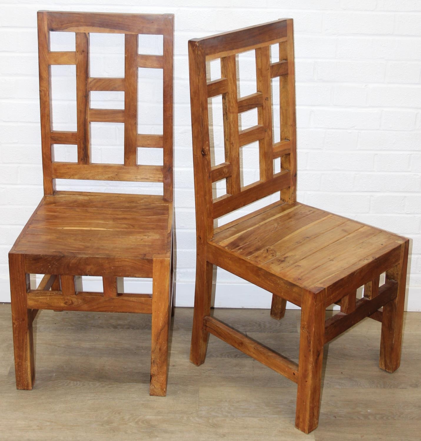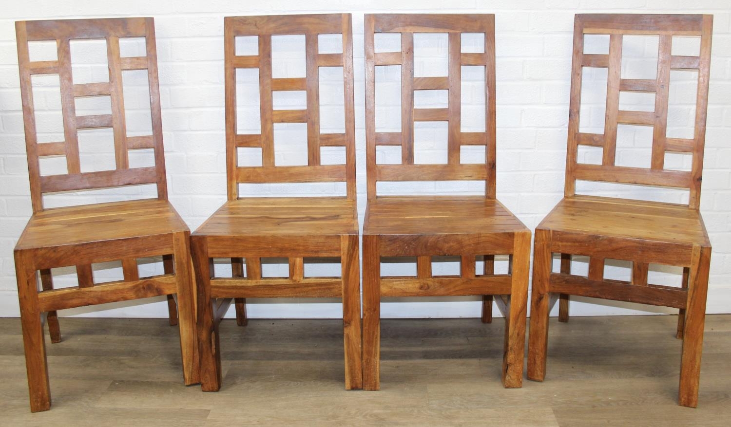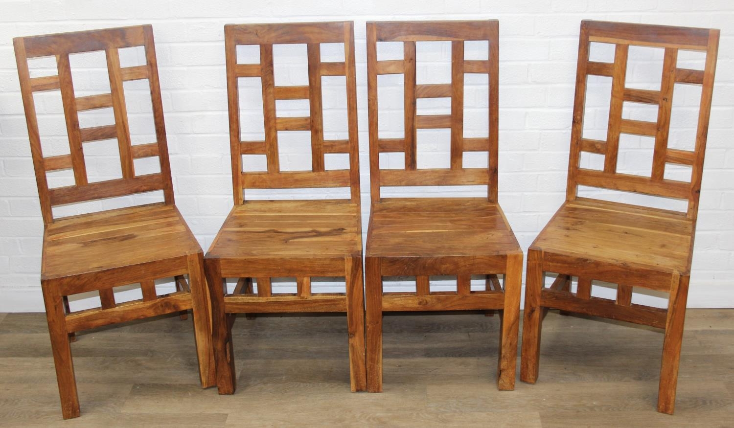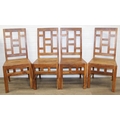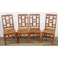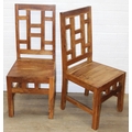Set of four bespoke mango wood dining chairs with geometric detail to backs and aprons, 104cm tall