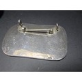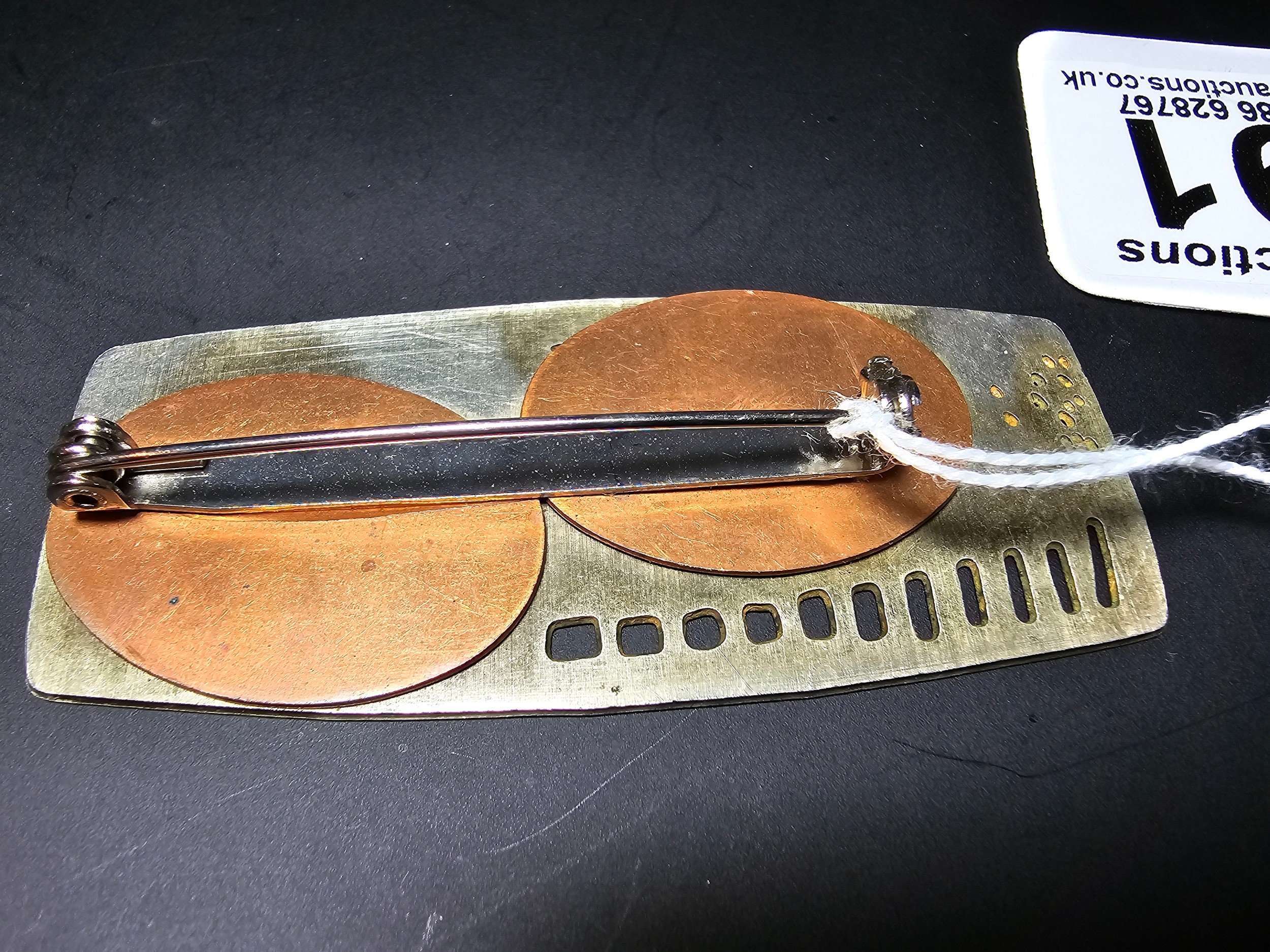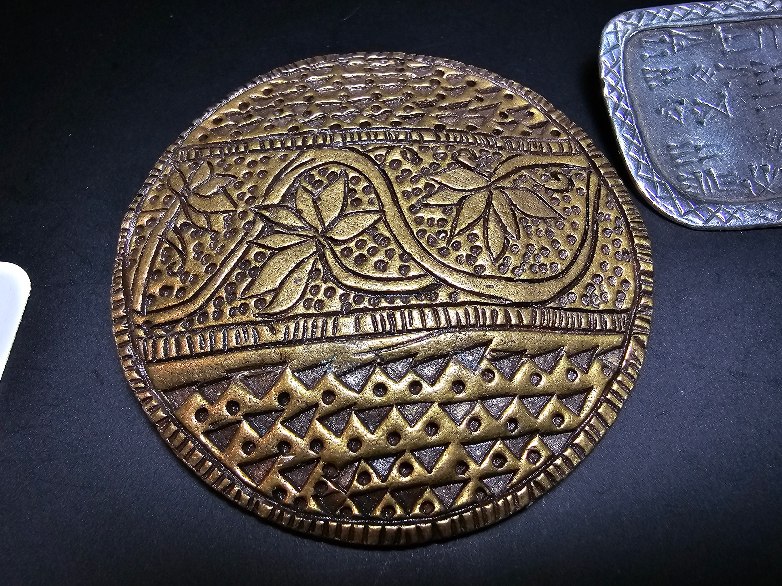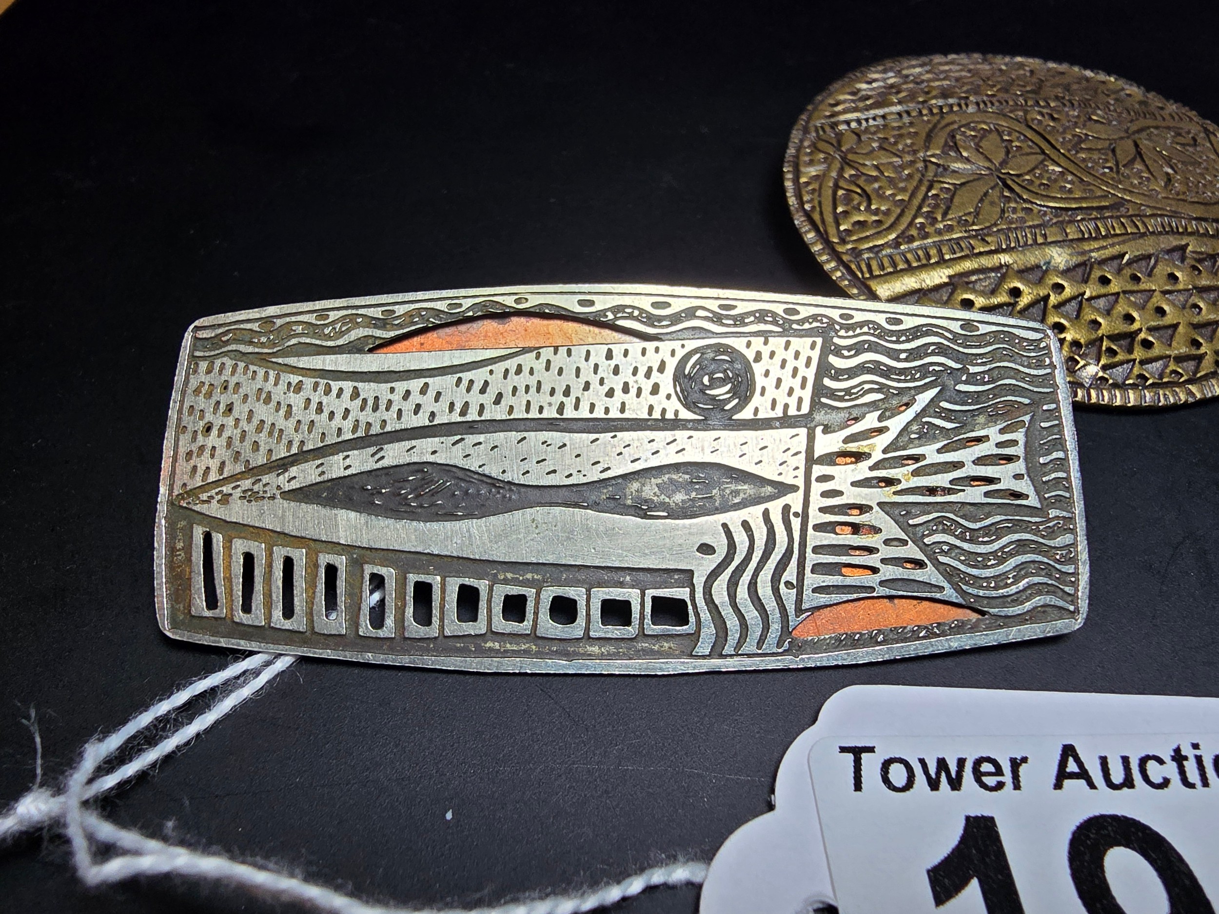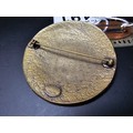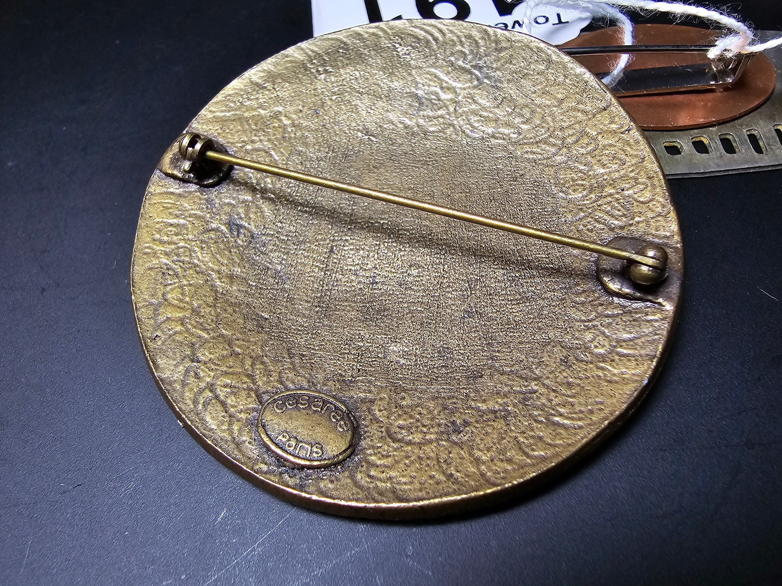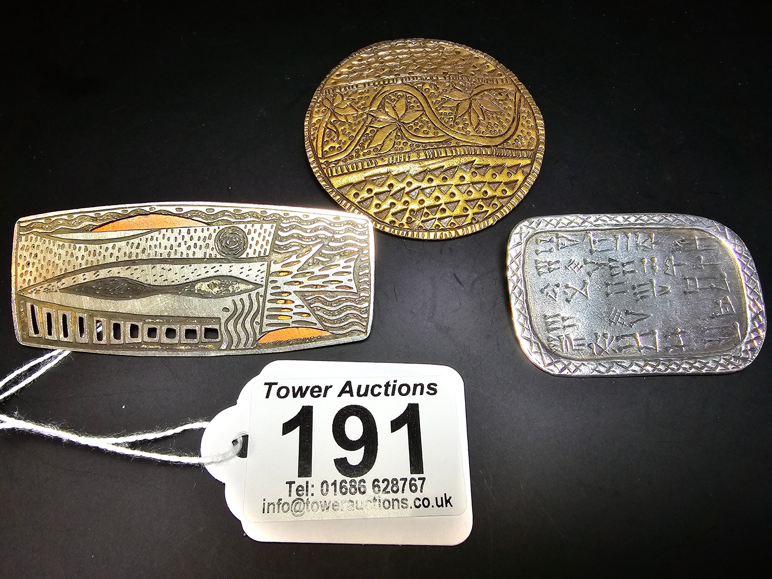 A collection of 3 good unusual large brooches to include a large 925 silver brooch with an ancient script design, an unusual pewter and copper brooch with what appear to be an aboriginal design and a large solid bronze round brooch by Cesaree Paris with an ornate engraved design. The round pendant has a diameter of 6cm, the silver pendant has a length of 5.2cm with a width of 3.5cm, the other pendant has a length of 7cm with a width of 3cm.