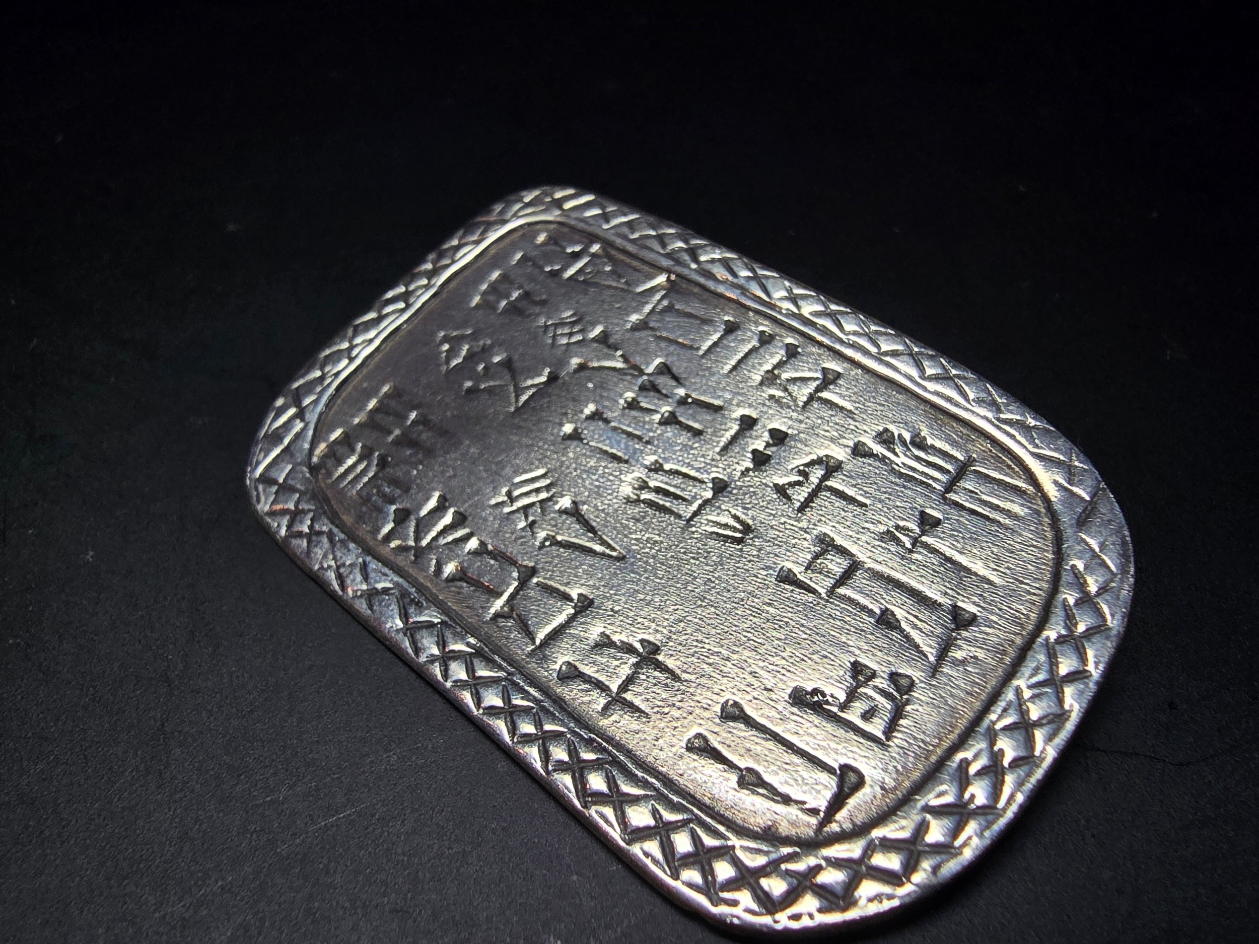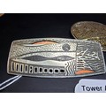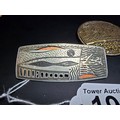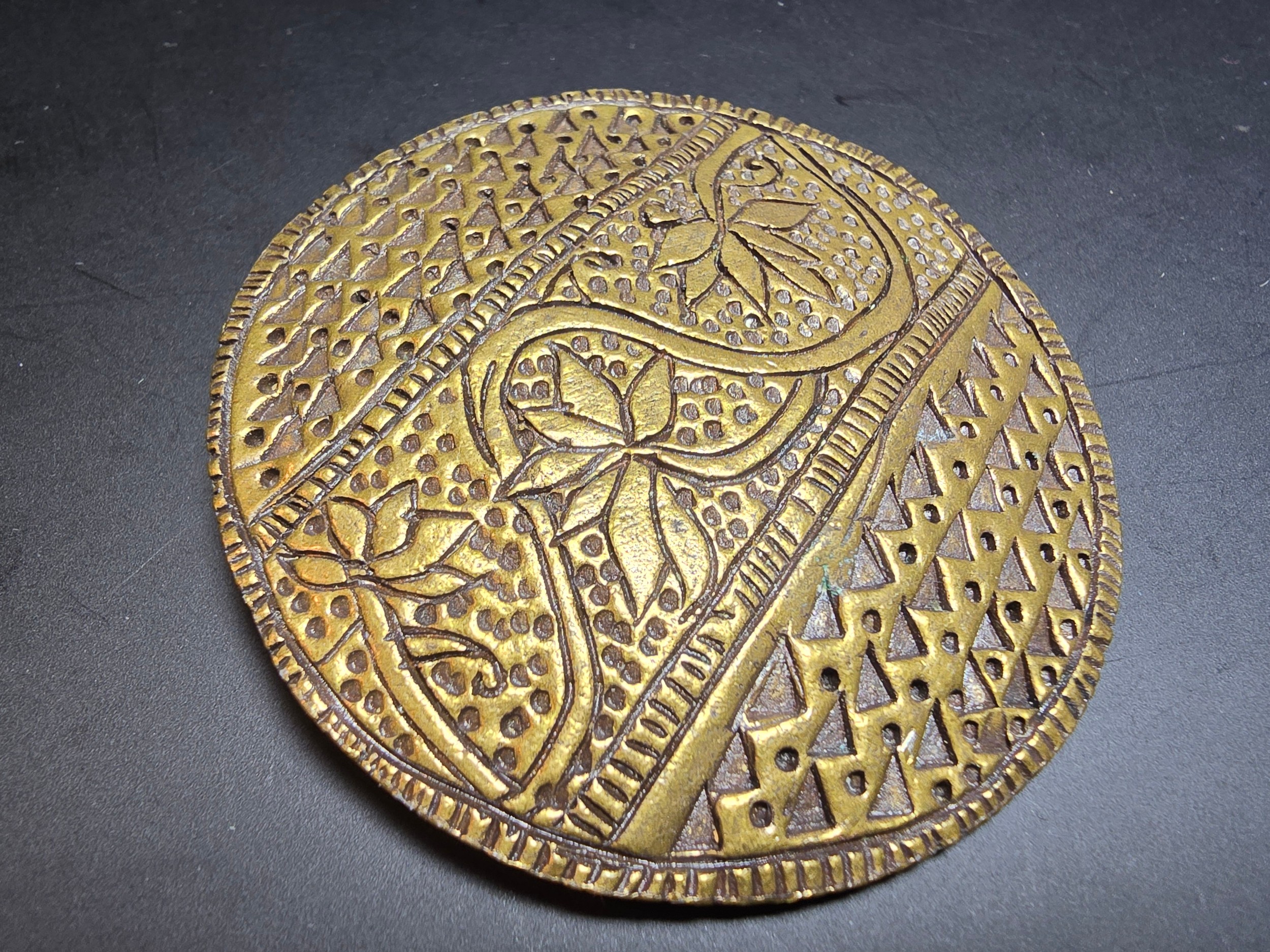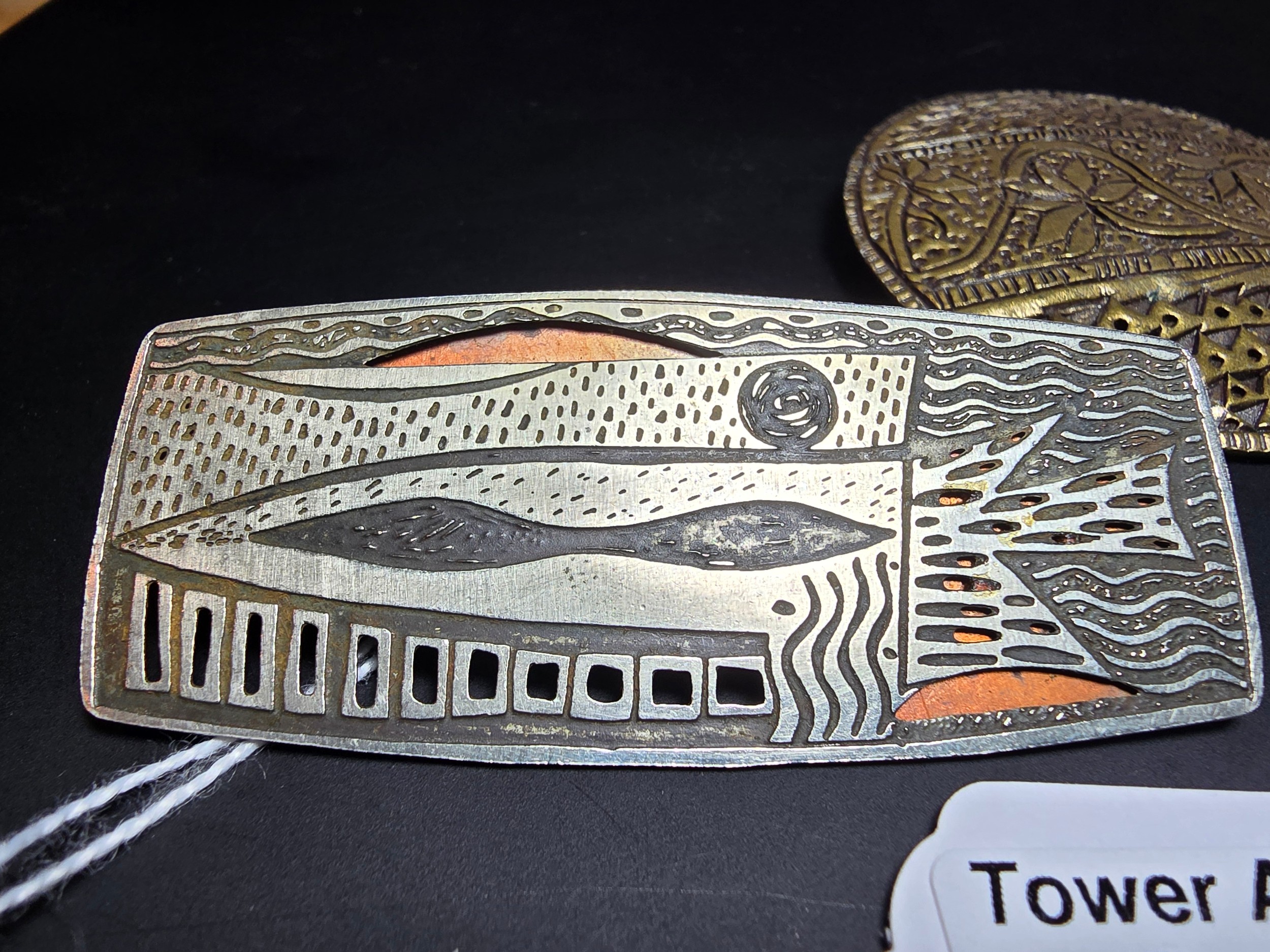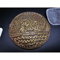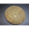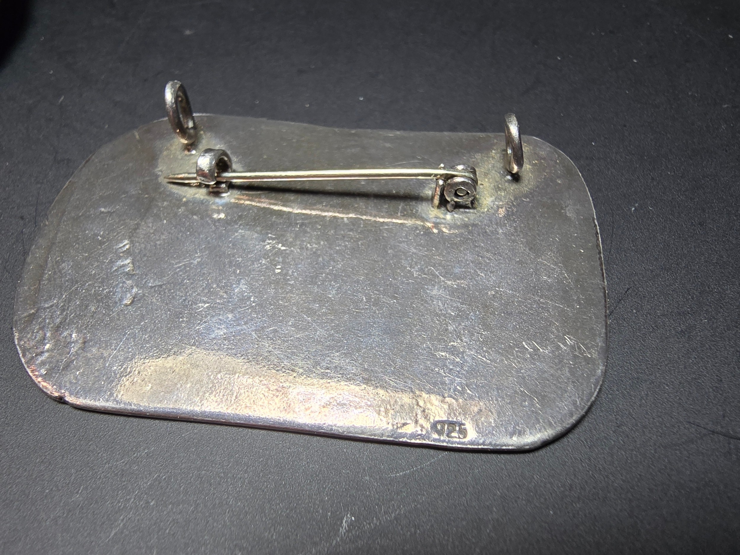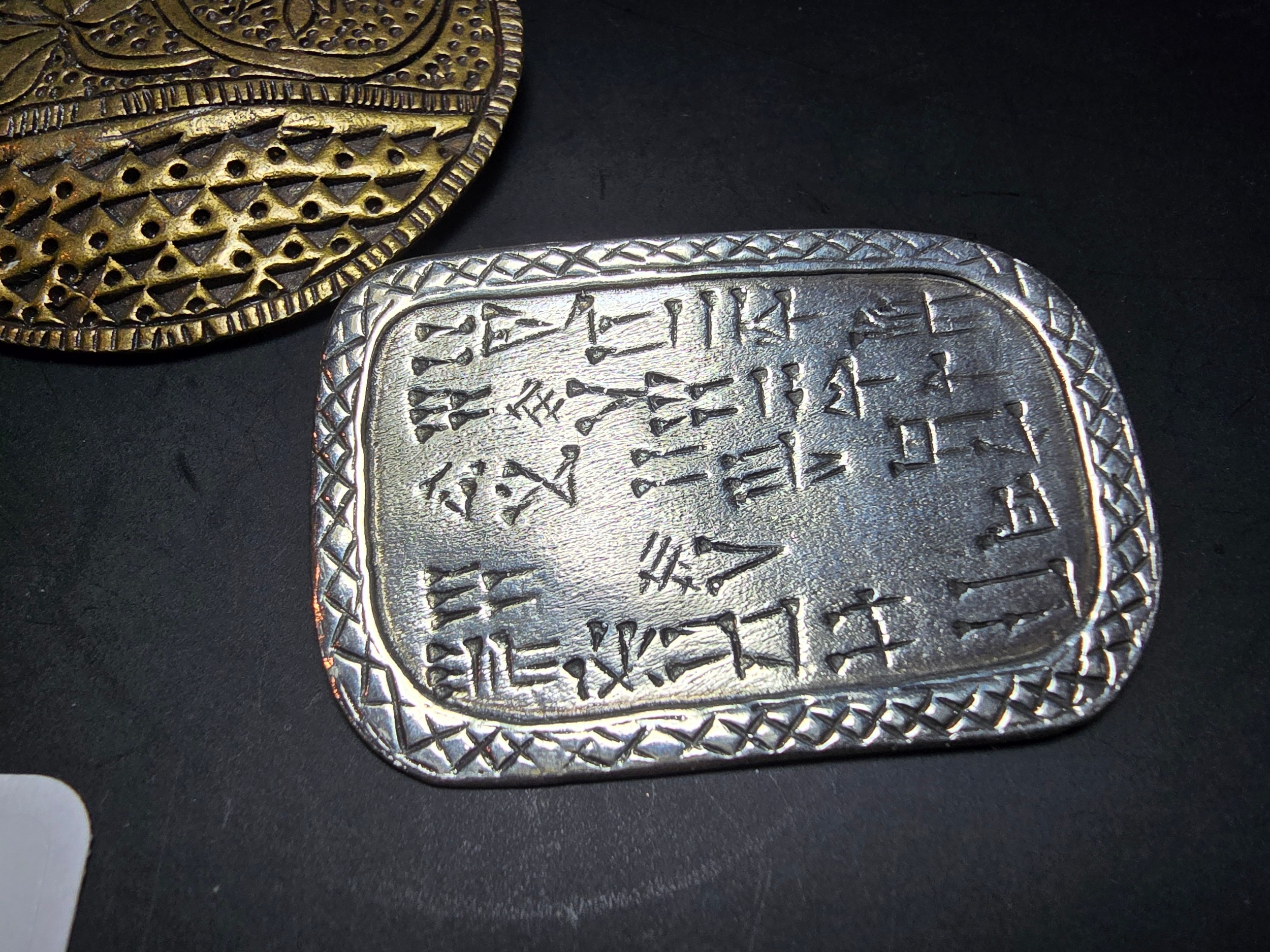 A collection of 3 good unusual large brooches to include a large 925 silver brooch with an ancient script design, an unusual pewter and copper brooch with what appear to be an aboriginal design and a large solid bronze round brooch by Cesaree Paris with an ornate engraved design. The round pendant has a diameter of 6cm, the silver pendant has a length of 5.2cm with a width of 3.5cm, the other pendant has a length of 7cm with a width of 3cm.
