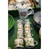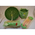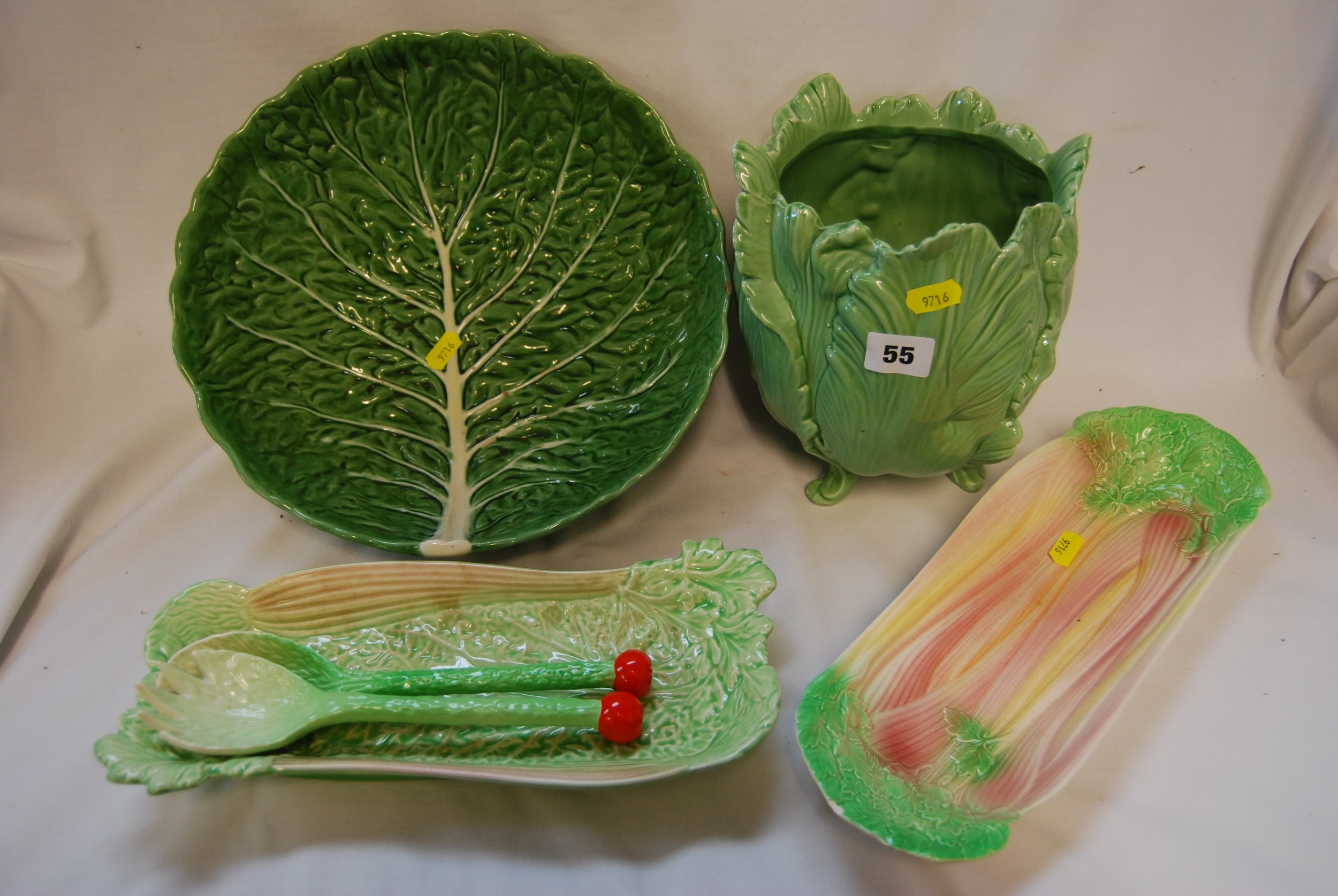 PORTGUESE CABBAGE LEAF SALAD BOWL, GREEN LEAF JARDINIERE, MELBA WARE & ROYAL WINTON RHUBARB DISHES AND PAIR OF SERVERS
