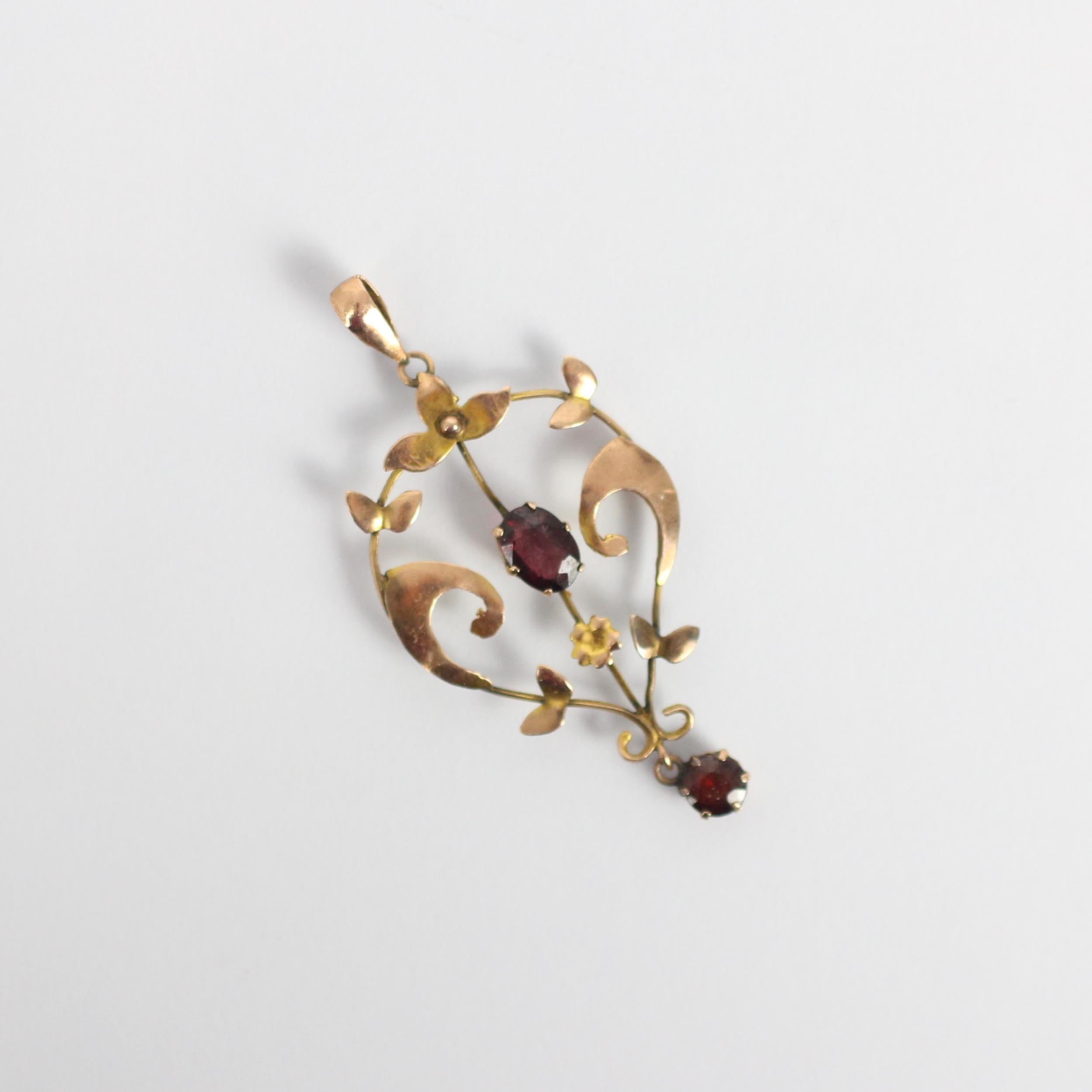 An early 20th century garnet pendant, the oval cut garnet within sinuous yellow metal mount, suspending further garnet, stamped indistinctly to reverse, 5cm long, 1.6gms