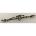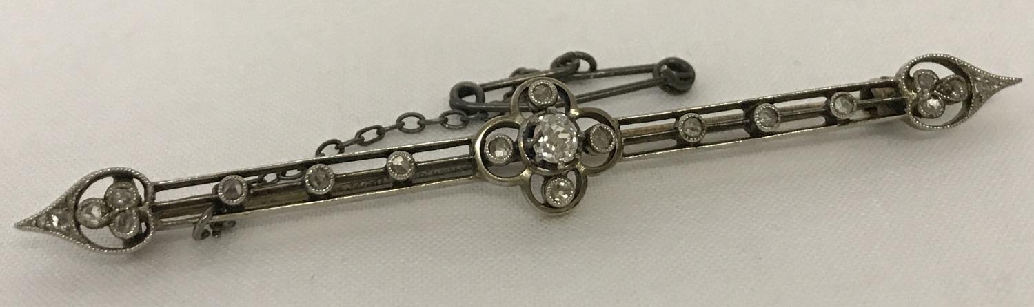 An Edwardian diamond set bar brooch with safety chain. Tests as 14ct gold. Total of 21 diamonds of varying sizes, approx. just over .30ct diamonds. Length approx. 7cm. Total weight approx. 5.7g.