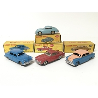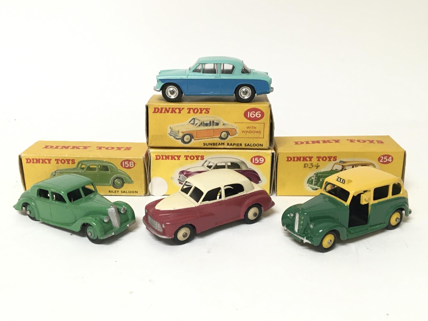 Dinky toys, #158 Riley saloon, #254 Austin taxi, #159 Morris Oxford saloon and #166 Sunbeam rapier saloon, boxed