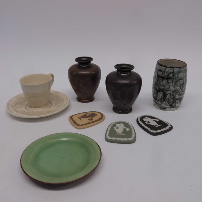 Three Wedgwood jasperware plaques, A Wedgwood Patrician creamware cup and saucer, and sundry items.