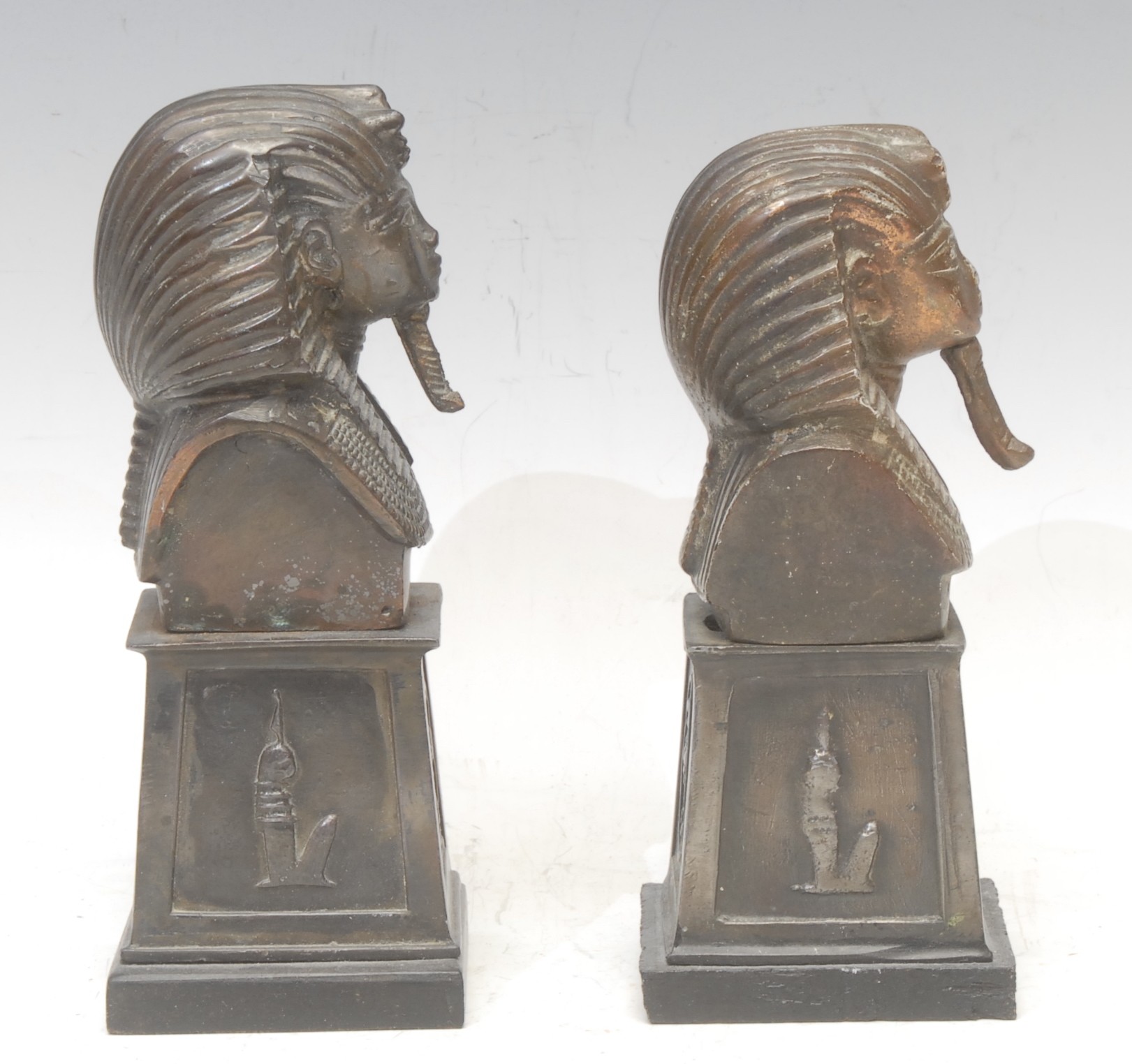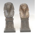 An associated pair of Egyptian cabinet bronze busts, cast after the mask of Tutankhamun, pedestal bases, the largest 18cm high overall