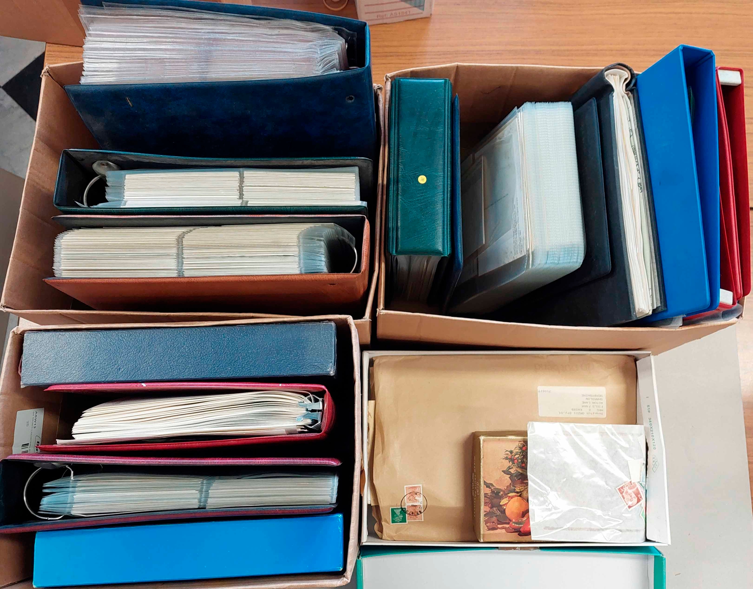 RANGE OF PHQs, COMMONWEALTH A-Z MINT, WORLDWIDE MIXTURE, ETC.: Three cartons containing 14 binders/albums and a shoebox. A diverse assortment inc. New Age Commonwealth 1960s album with mint ranges (some shilling values); 1985 mint Queen Mother commemorative sets & minisheets in two binders; four binders/albums & shoebox with a worldwide mixture inc. early-modern South American issues; mint USA blocks plus mint central/eastern Europe; and 7 binders well-filled with chronologically ordered 1975-2005 PHQs, some used. (Many 100s) Cross Reference: PHQ CARDS