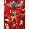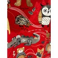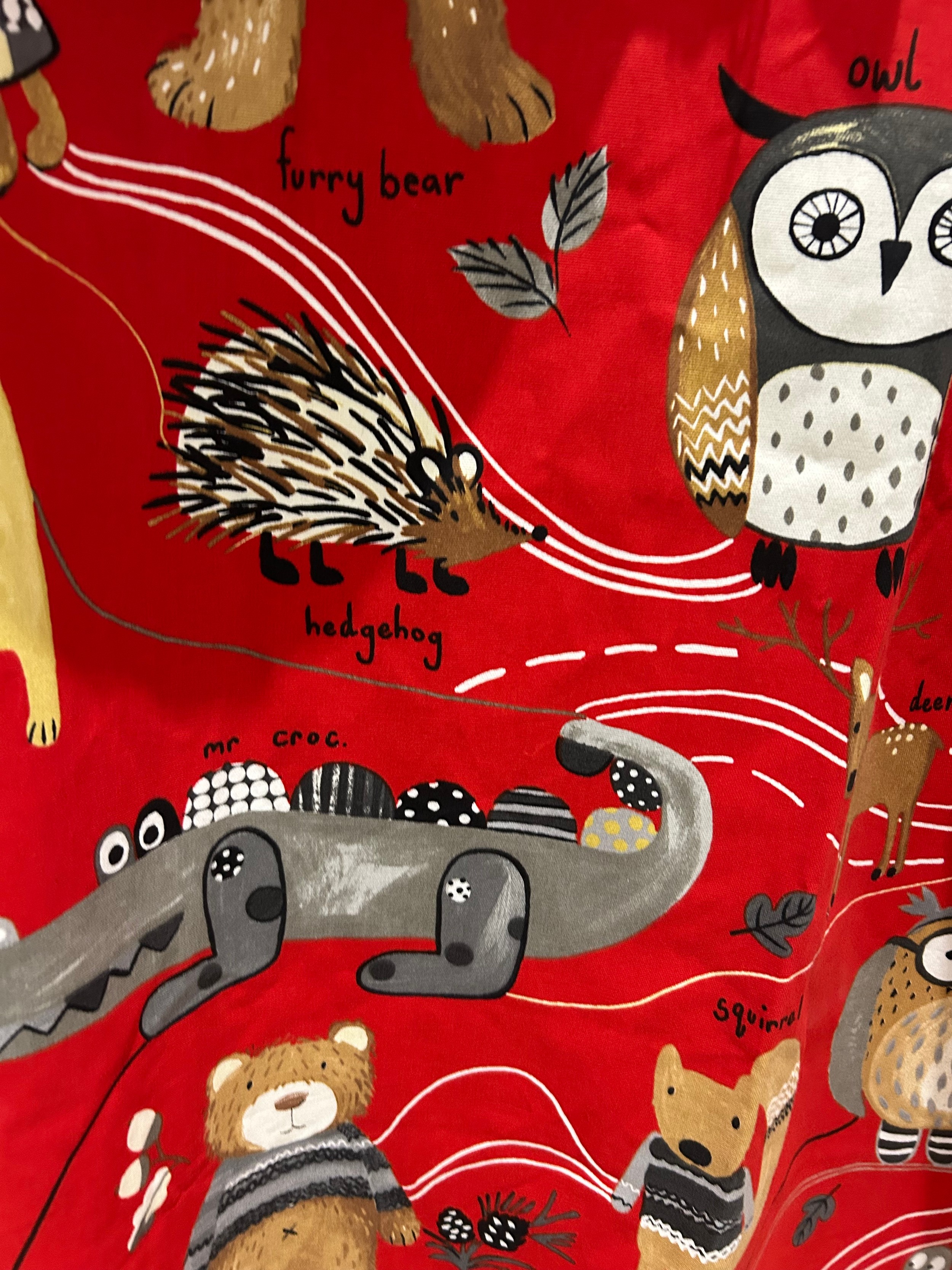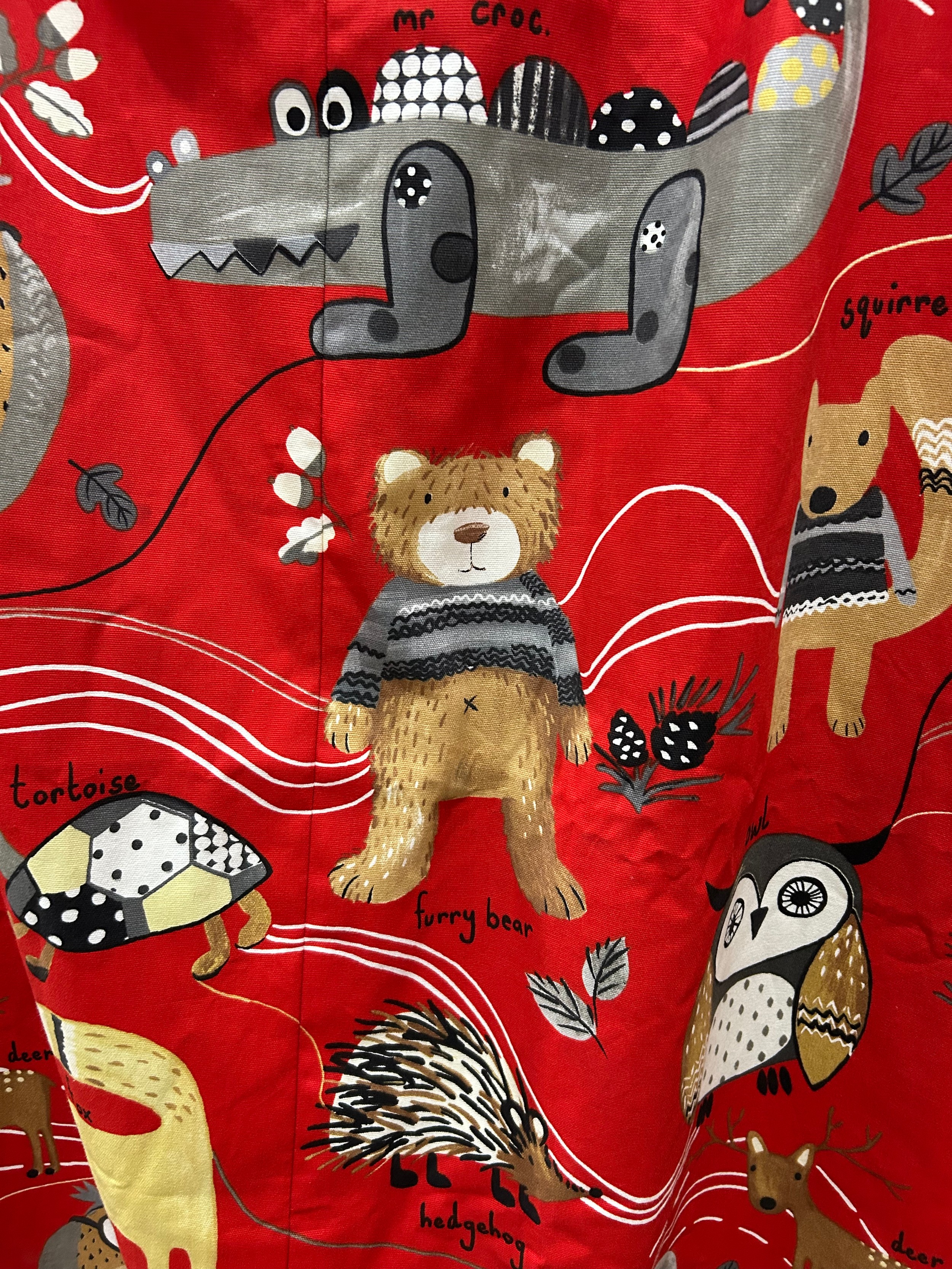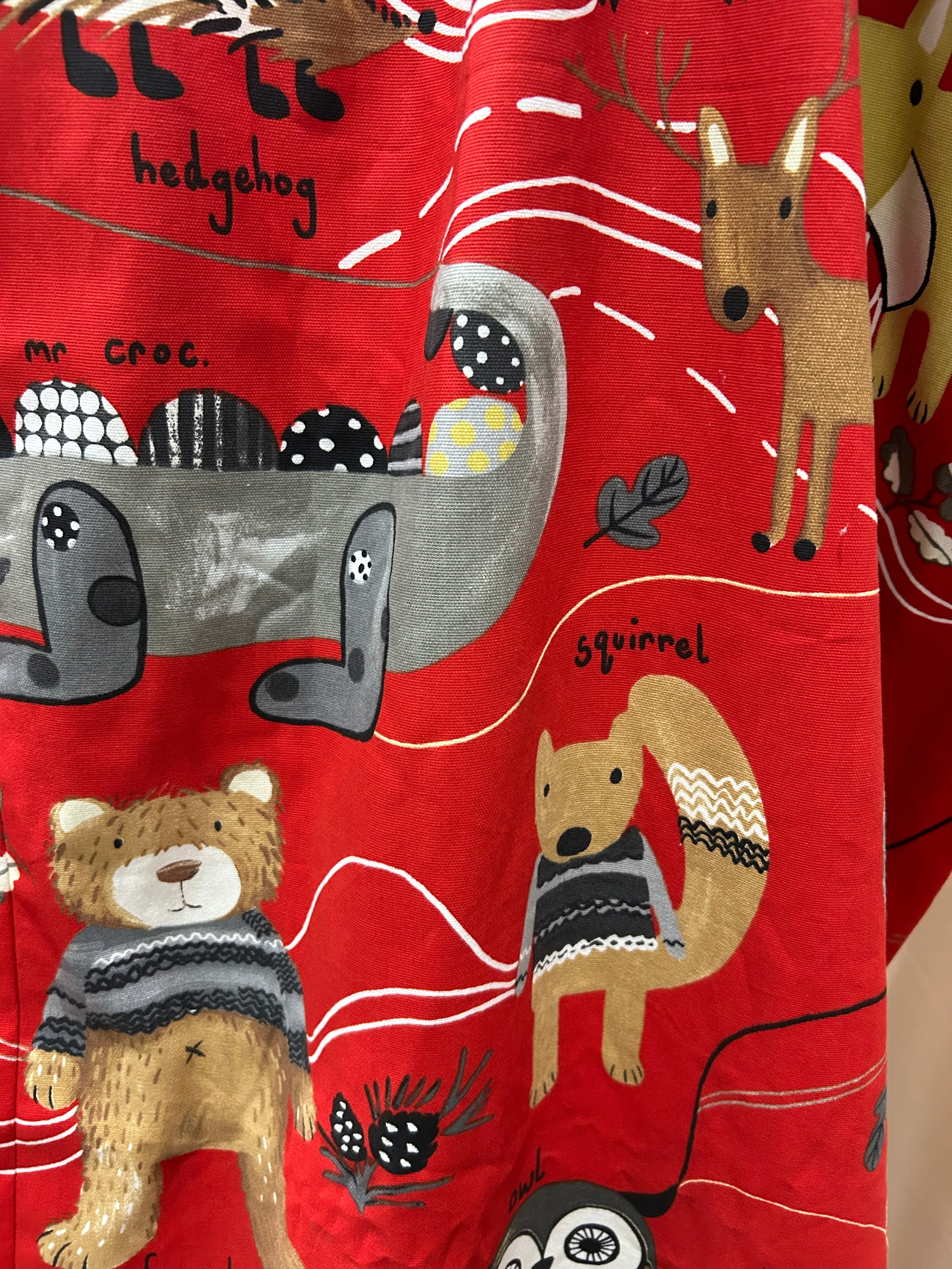 Pair of children’s curtains in Prestigious Textiles “Nature Trail” cotton, red ground printed with whimsical woodland animals, fully lined, each panel approx. 152 cm wide × 200 cm drop.