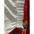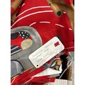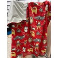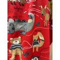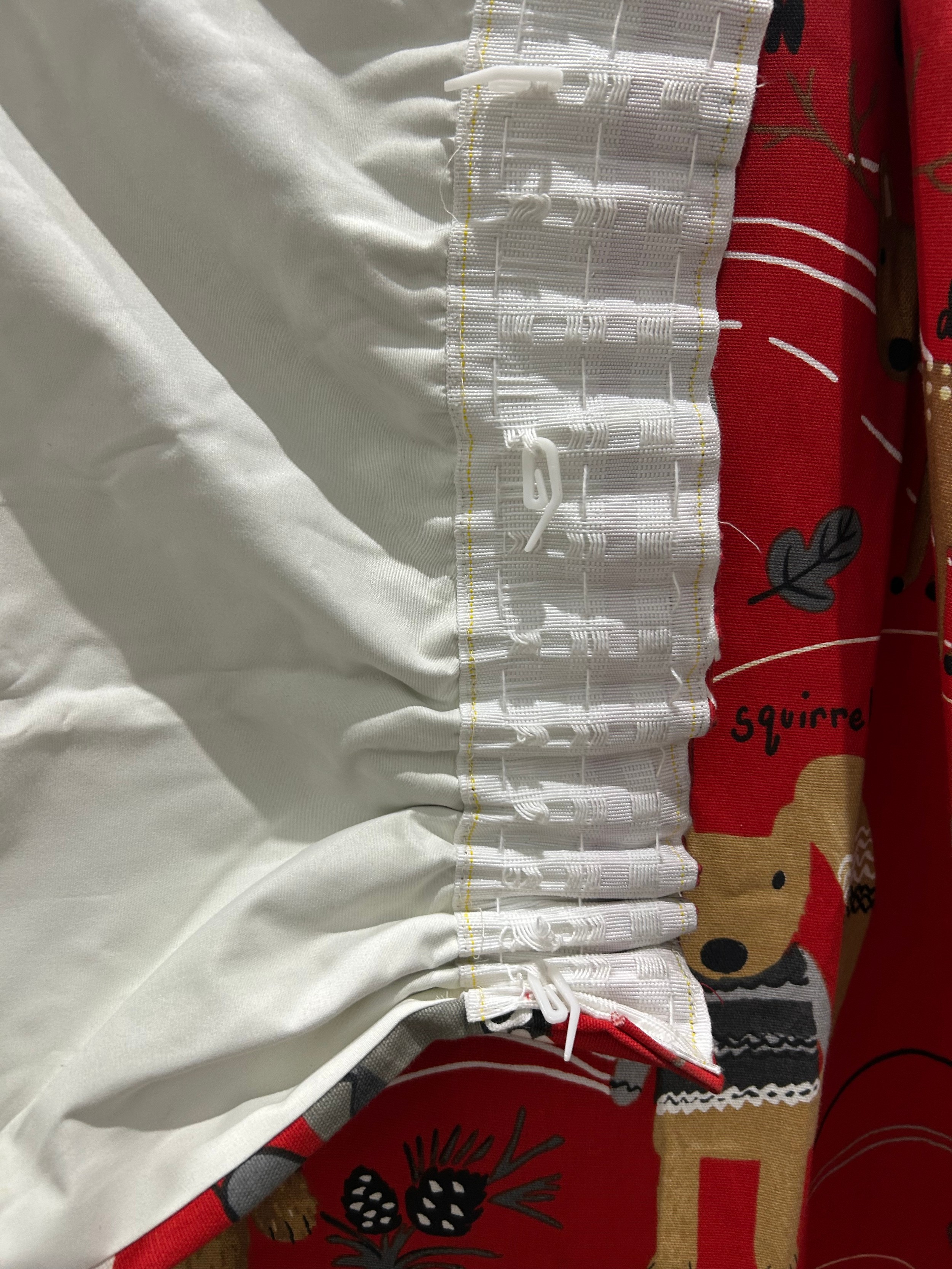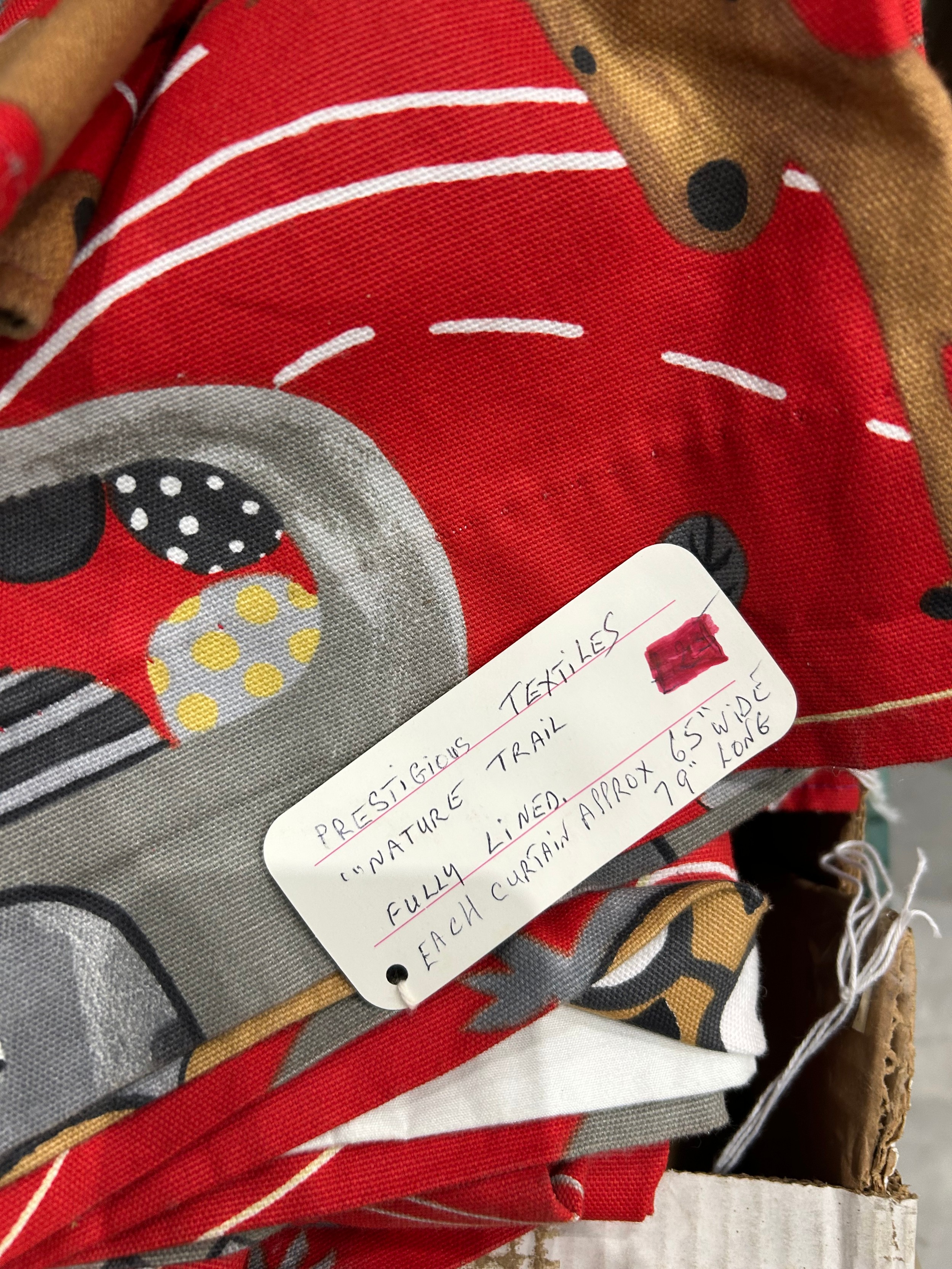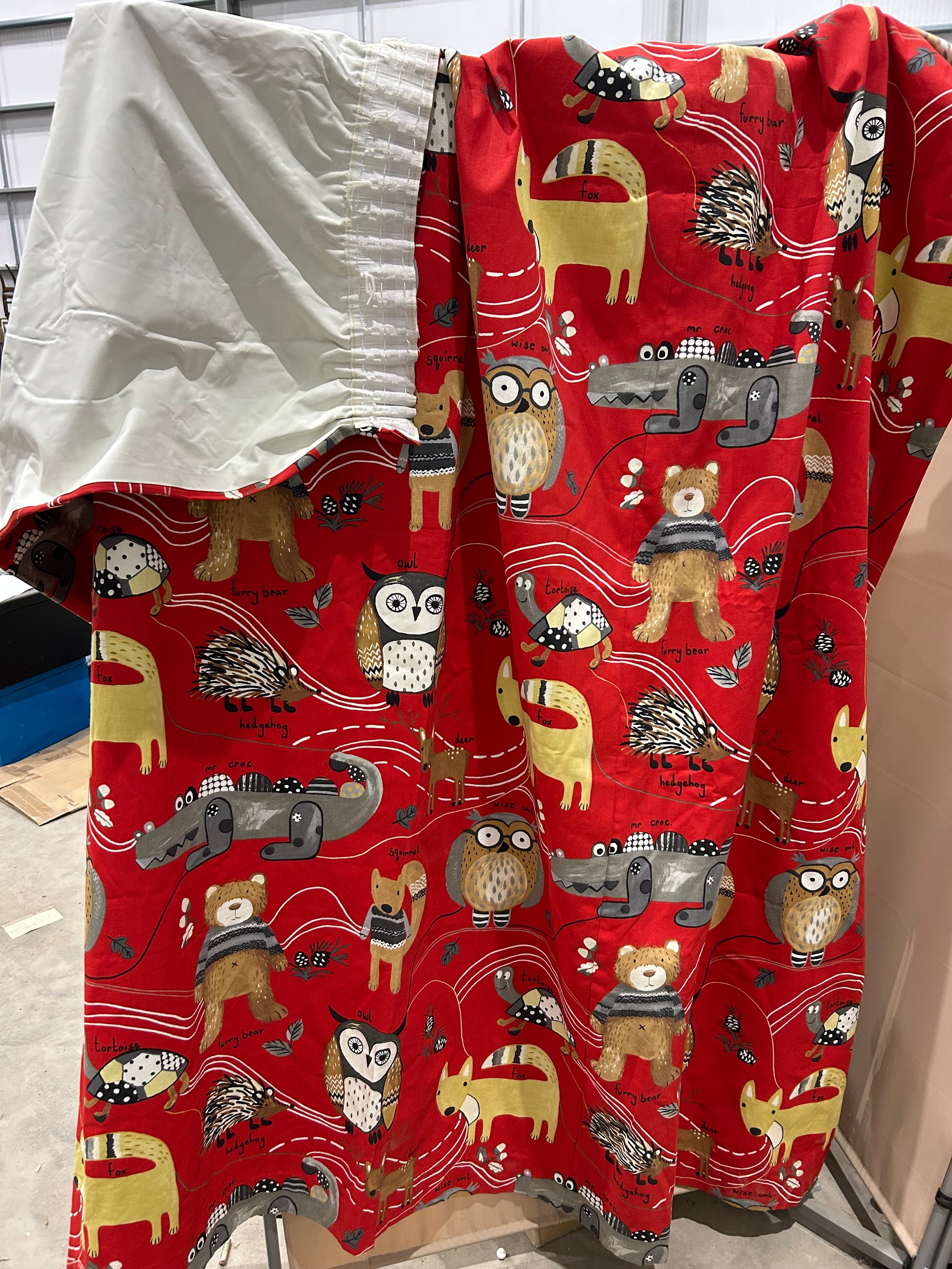 Pair of children’s curtains in Prestigious Textiles “Nature Trail” cotton, red ground printed with whimsical woodland animals, fully lined, each panel approx. 152 cm wide × 200 cm drop.