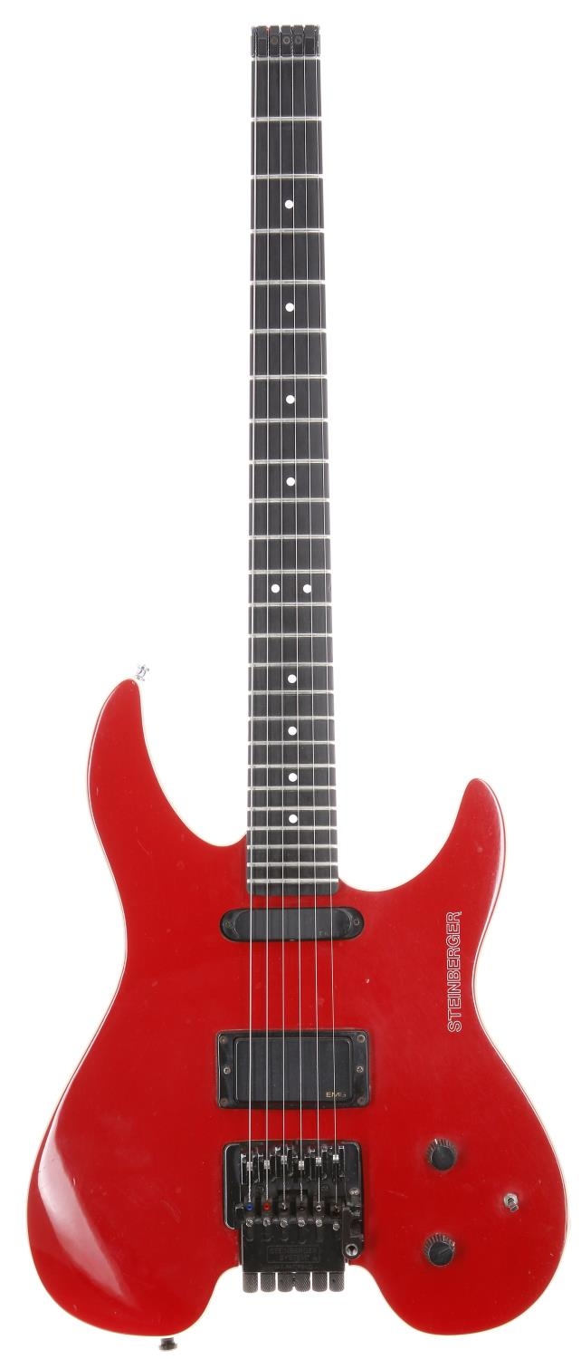 Late 1980s Steinberger GM1T electric guitar, made in USA; Body: red finish, surface scratches and various minor dings; Neck: carbon; Fretboard: carbon; Frets: good; Electrics: working; Hardware: good, minor tarnishing; Case: original gig bag; Weight: 3.51kg; Overall condition: good for age
