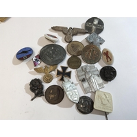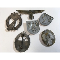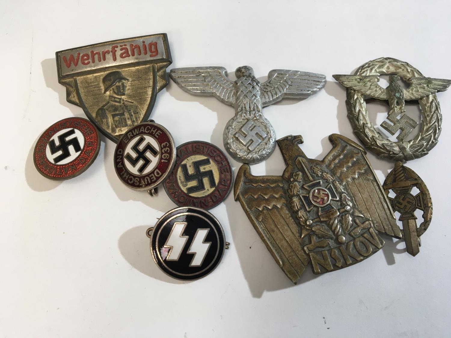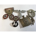 Three German Third Reich Political badges an SS badge a District badge and other German Political and Military badges.