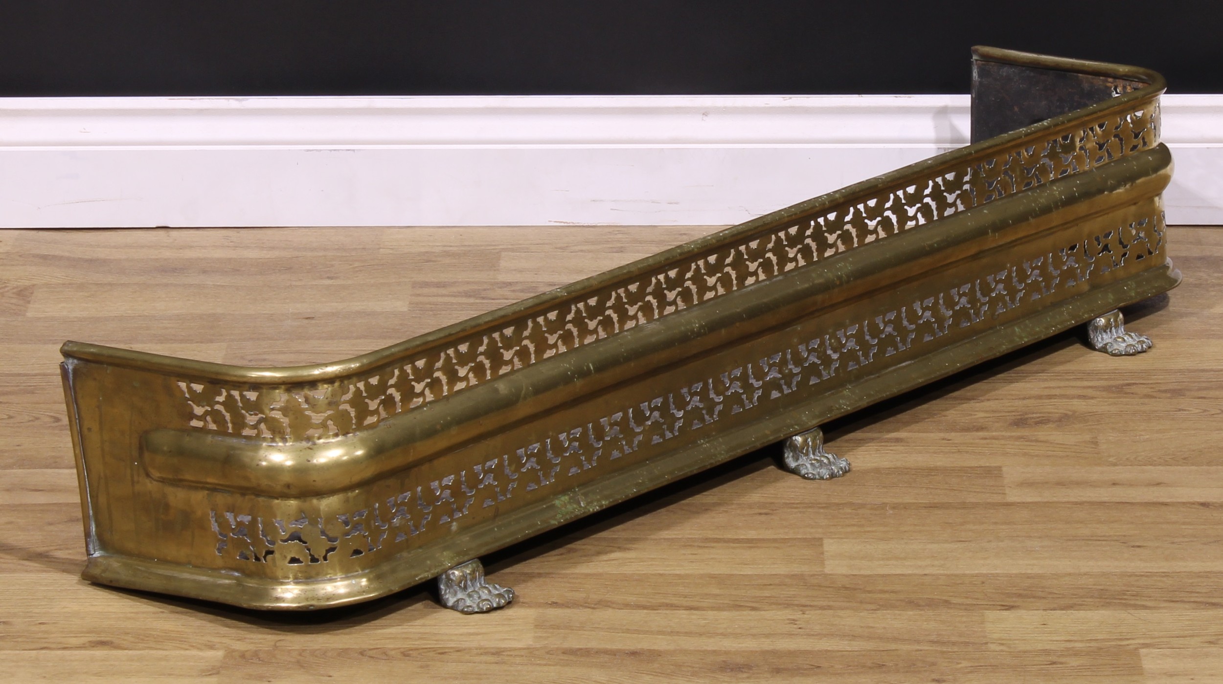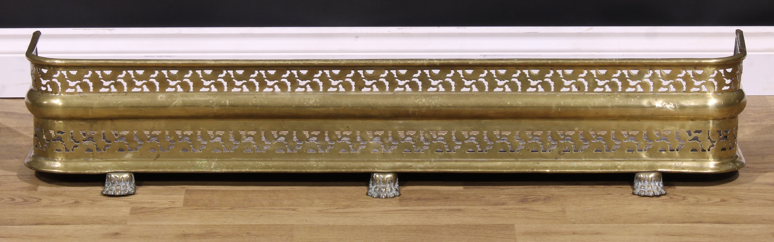 A Regency pierced brass fire curb or fender, paw feet, 20.5cm high, 115cm wide, 32cm deep, c.1820