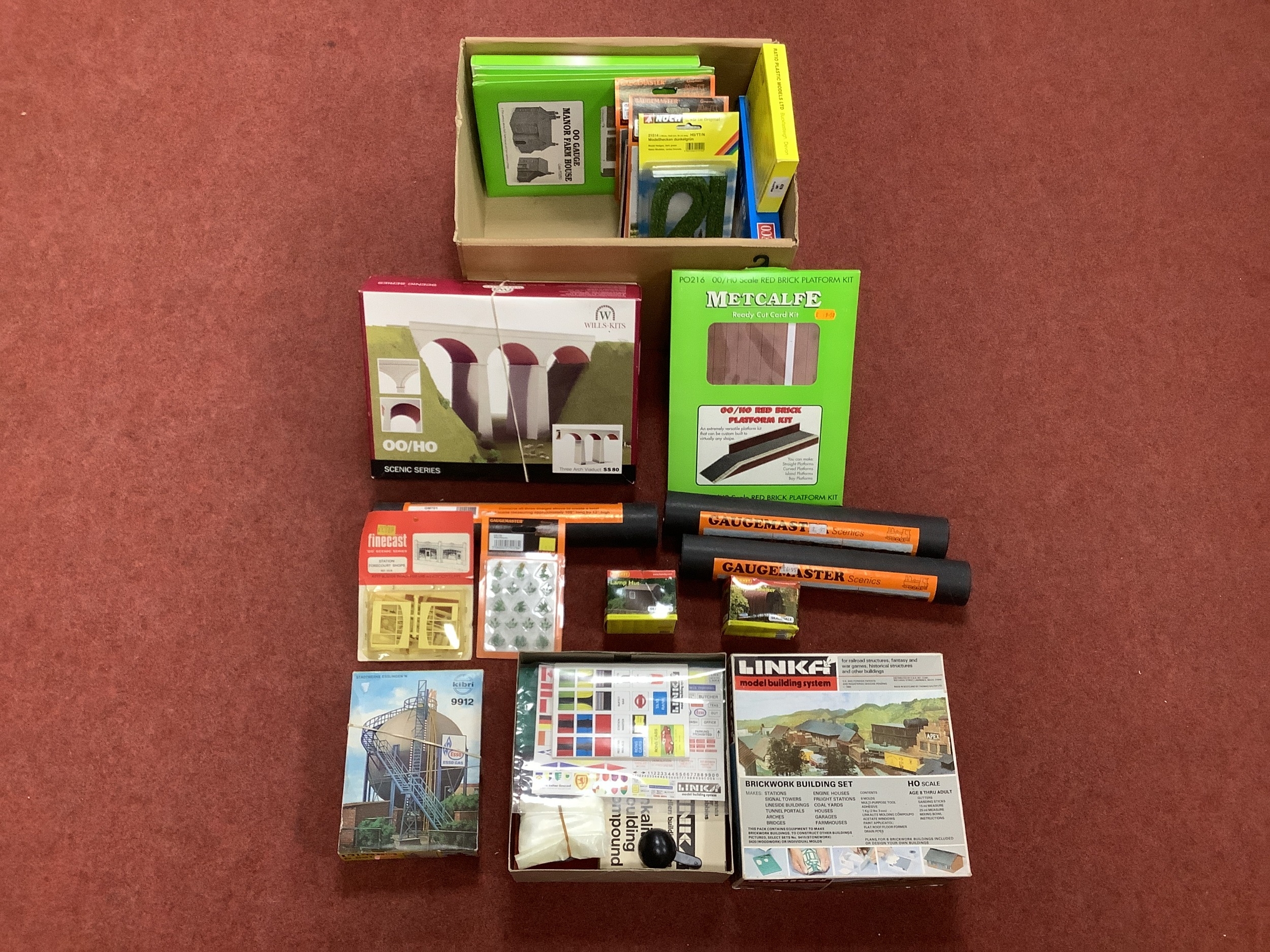 A Box of '00'/'HO' Scenic Items, including a Linka model building system (Ref 8410) for brickwork buildings (appears complete), a Wills viaduct kit, three Gaugemaster scenic backscenes and other kits by Dapol, Peco, Ratio and Metcalfe.