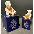 A Royal Crown Derby paperweight, Debonair Bear, Collector's Guild exclusive, gold stopper, 11.5cm, boxed; another, Shona Scottish Teddy, gold stopper, 8cm, boxed (2)