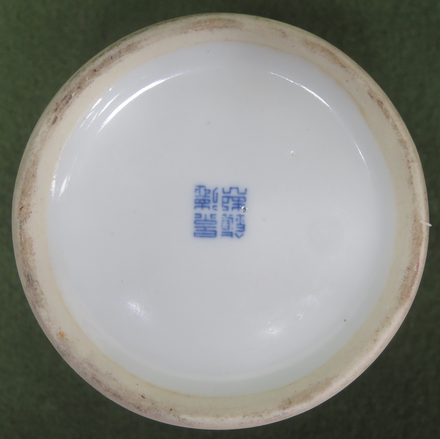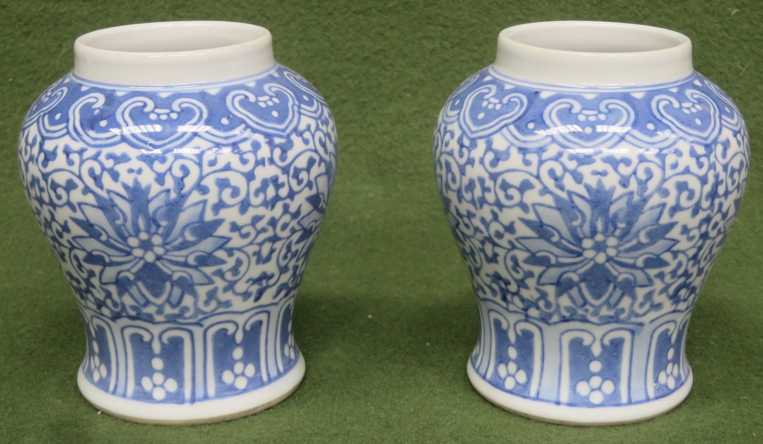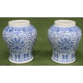 Pair of interesting Oriental blue and white glazed ceramic baluster vases, both stamped with character marks to base. Approx. 12cms H