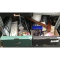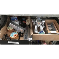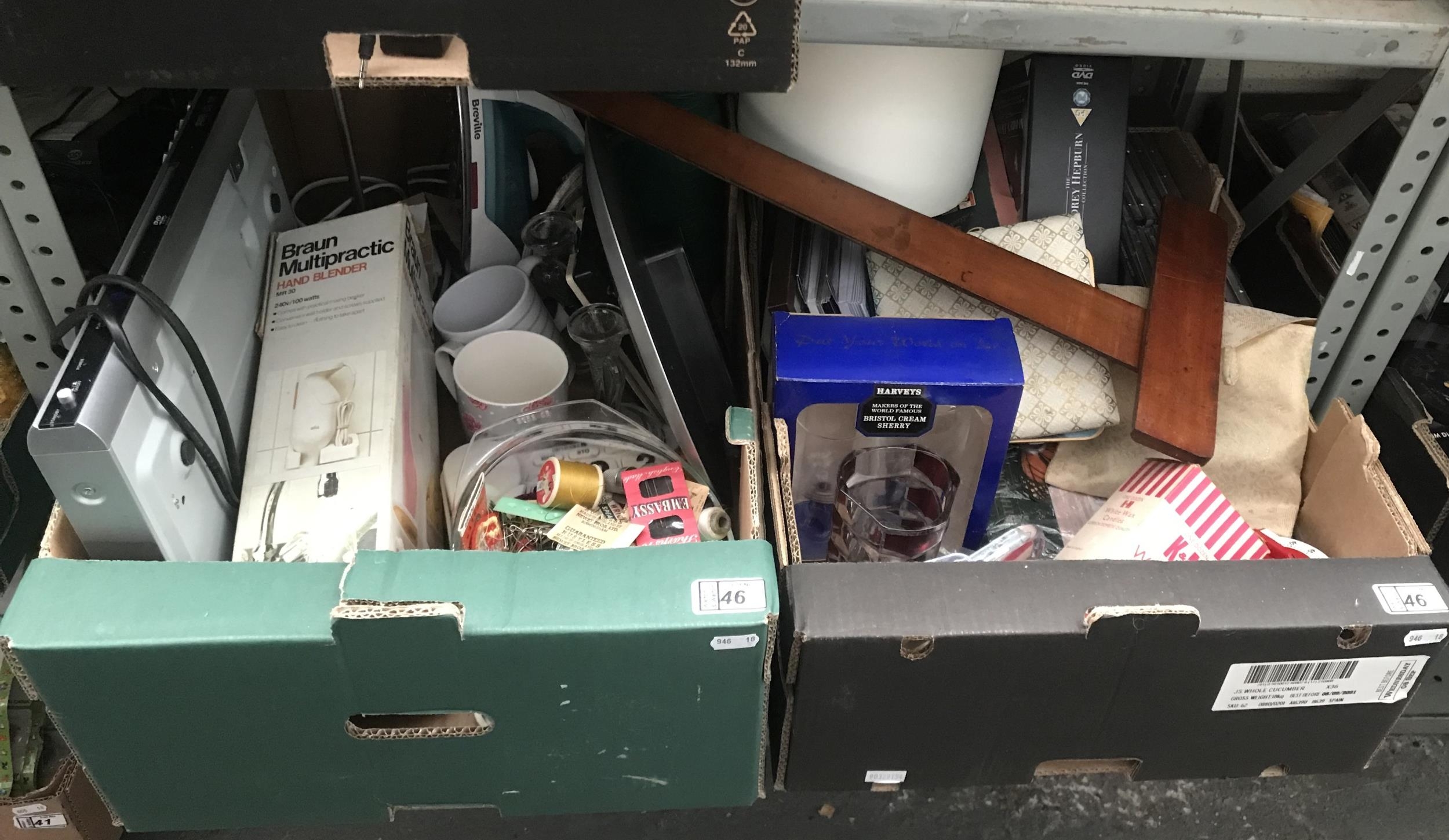 2 Boxes containing a DVD player, an iron and blender etc