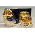A Royal Crown Derby paperweight, Tawny Owl, designed by Louise Adams and modelled by Mark Delf, 21st anniversary gold stopper, 8.5cm, printed mark in red, boxed; another, Little Owl, gold stopper, 8cm, printed mark in red, boxed (2)