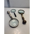 Three magnifying glasses with brass and inlaid handles, varying sizes.
