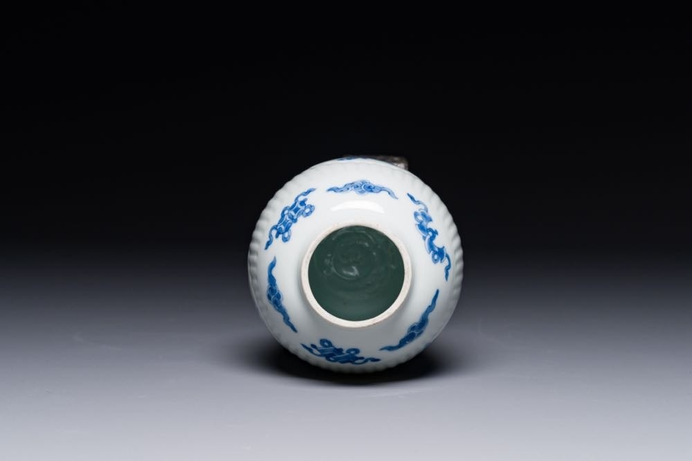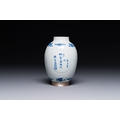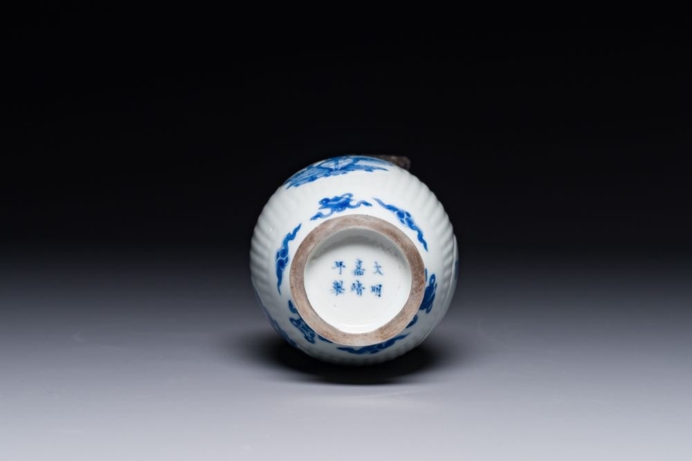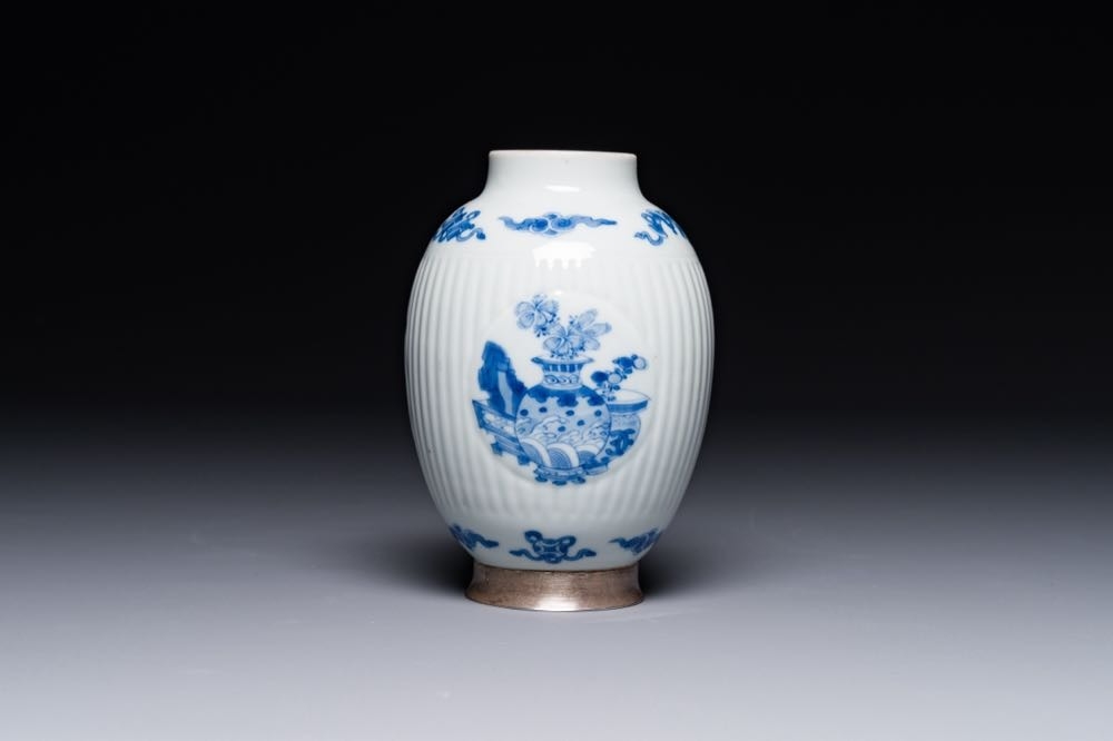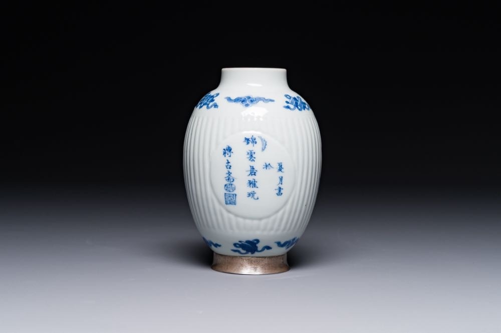 A fine Chinese blue and white silver mounted jar, signed Bo Gu Zhai, Jiajing mark, Kangxi
