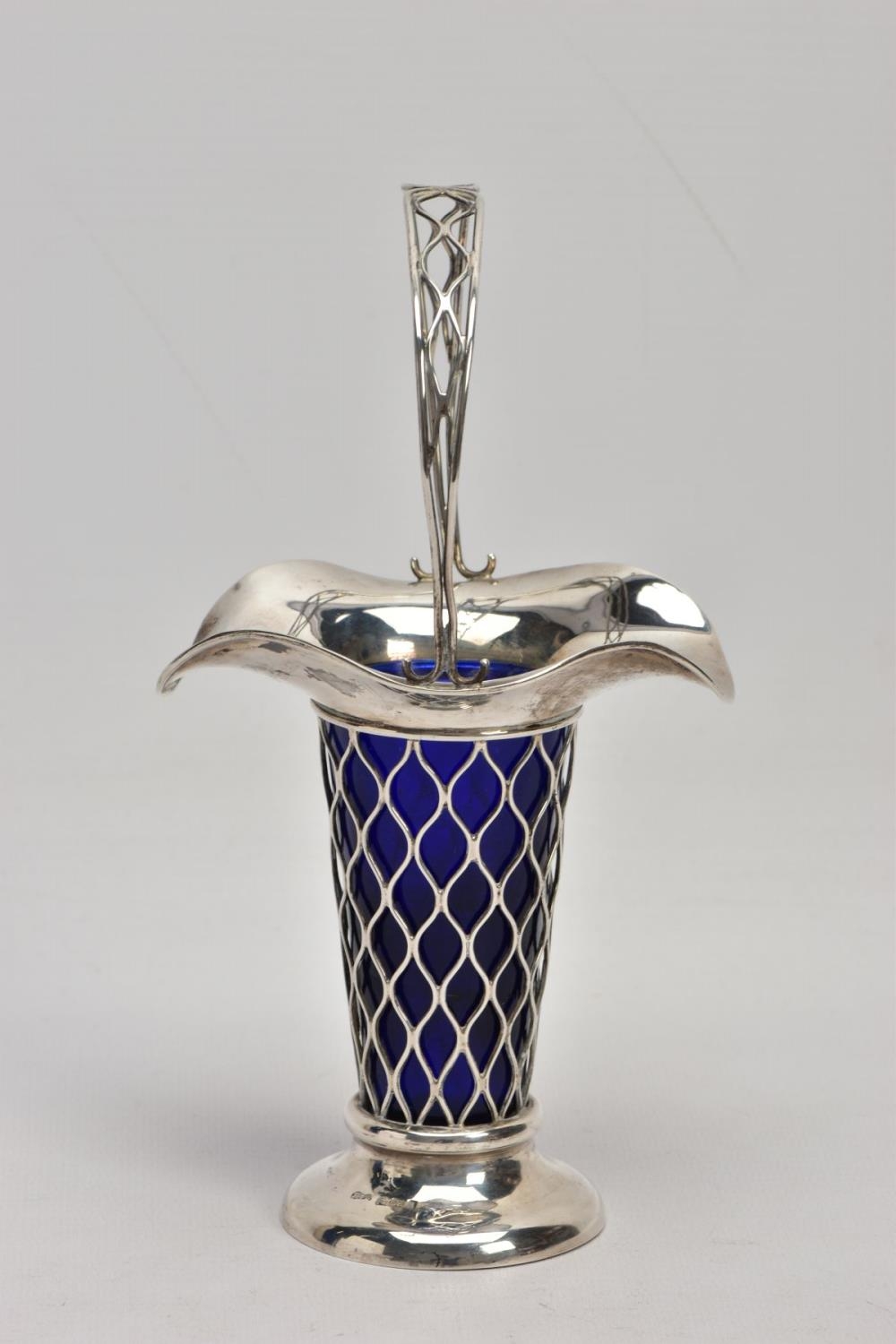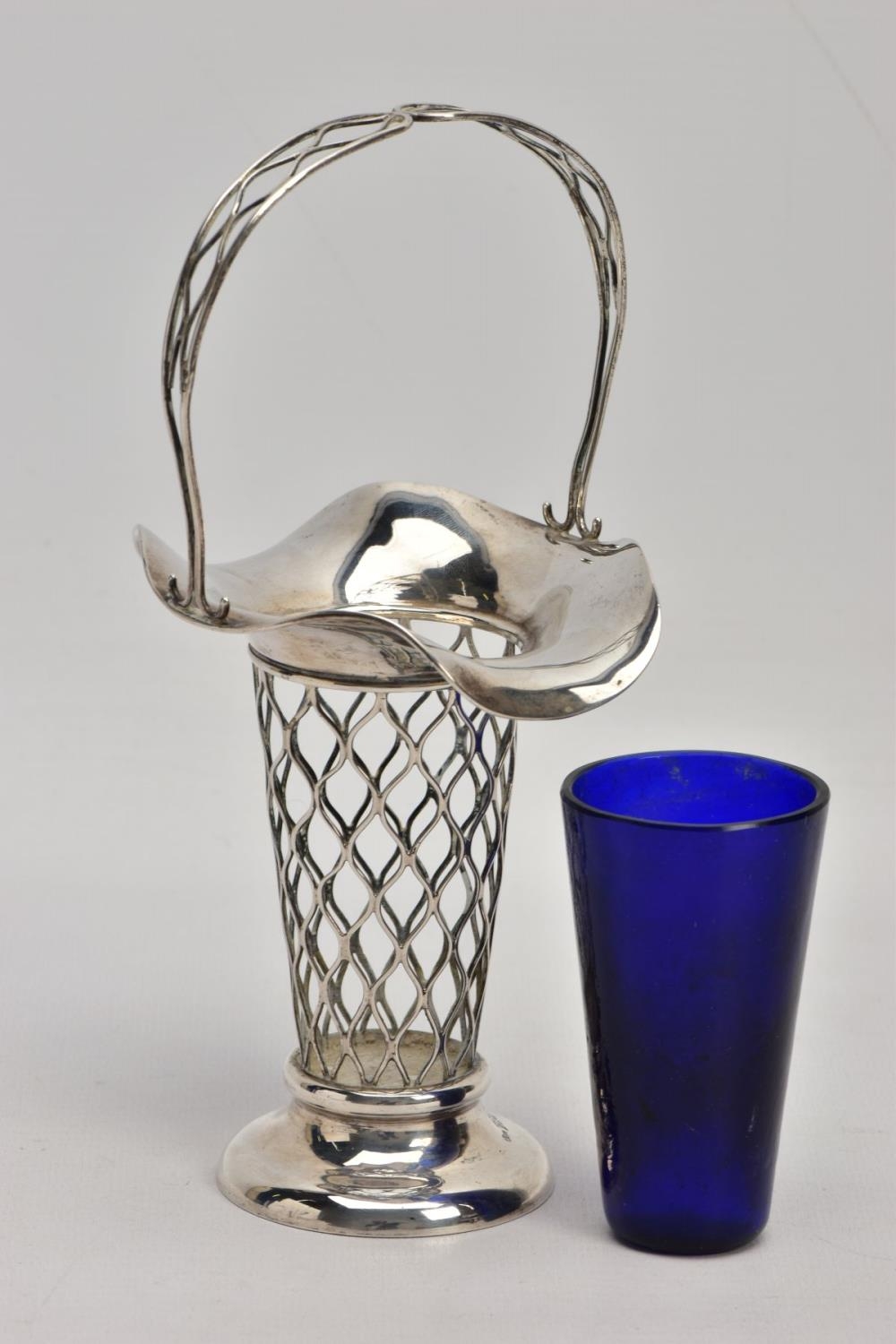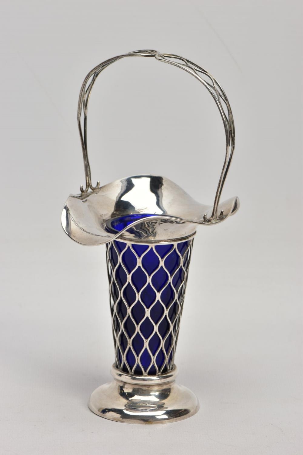 AN EARLY 20TH CENTURY SILVER BUD VASE, of basket design with tapered body, scalloped rim and blue glass liner, silver hallmark for Harrison & Hipwood, Birmingham 1910, height 190mm, approximate gross weight (excluding glass liner) 88 grams, 2.8ozt (condition report: overall good condition, light tarnishing and general wear, probably used to have weighted base as there is remnants of adhesive inside the base)