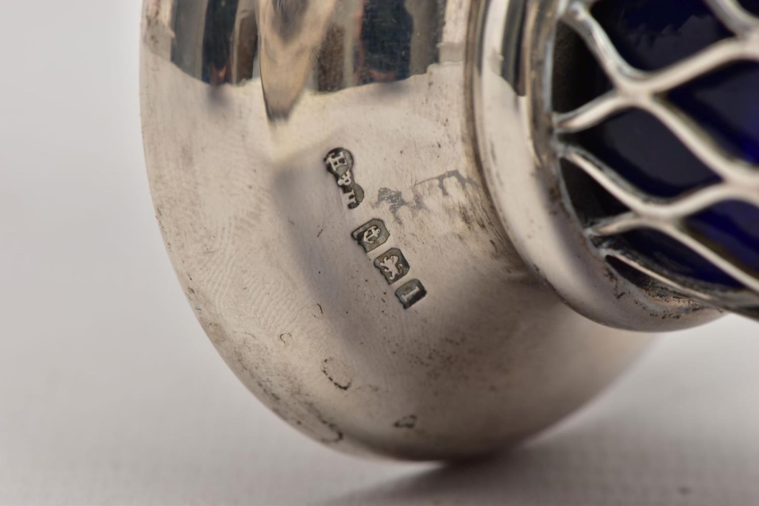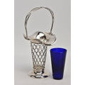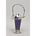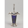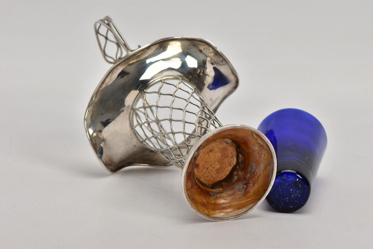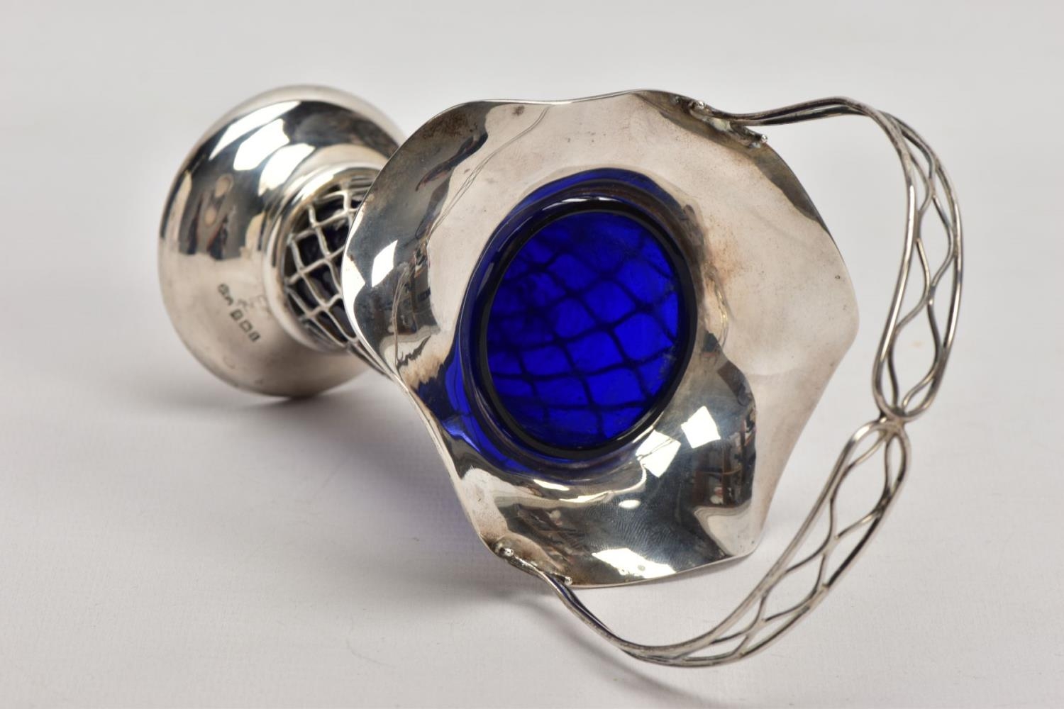 AN EARLY 20TH CENTURY SILVER BUD VASE, of basket design with tapered body, scalloped rim and blue glass liner, silver hallmark for Harrison & Hipwood, Birmingham 1910, height 190mm, approximate gross weight (excluding glass liner) 88 grams, 2.8ozt (condition report: overall good condition, light tarnishing and general wear, probably used to have weighted base as there is remnants of adhesive inside the base)