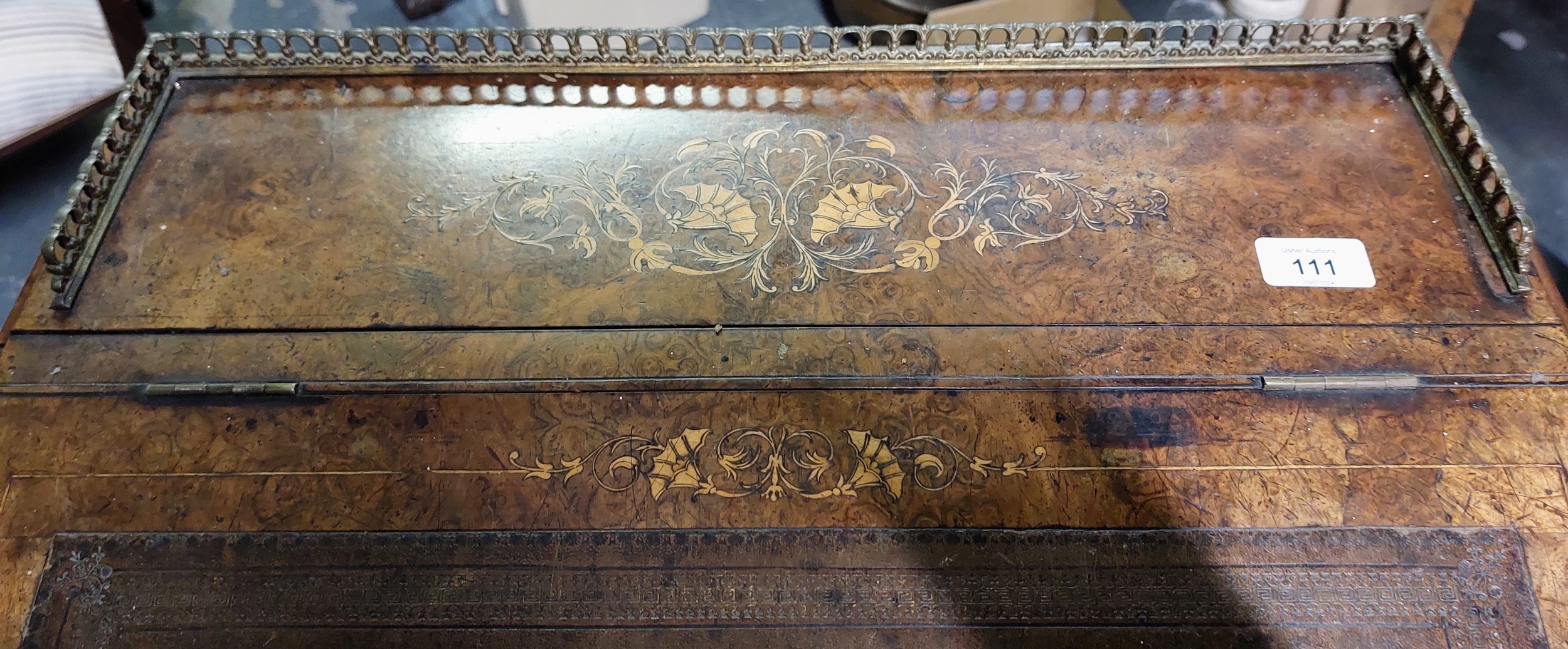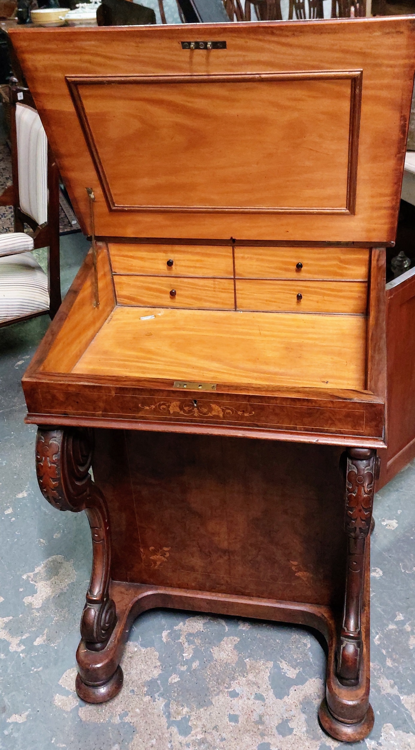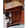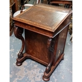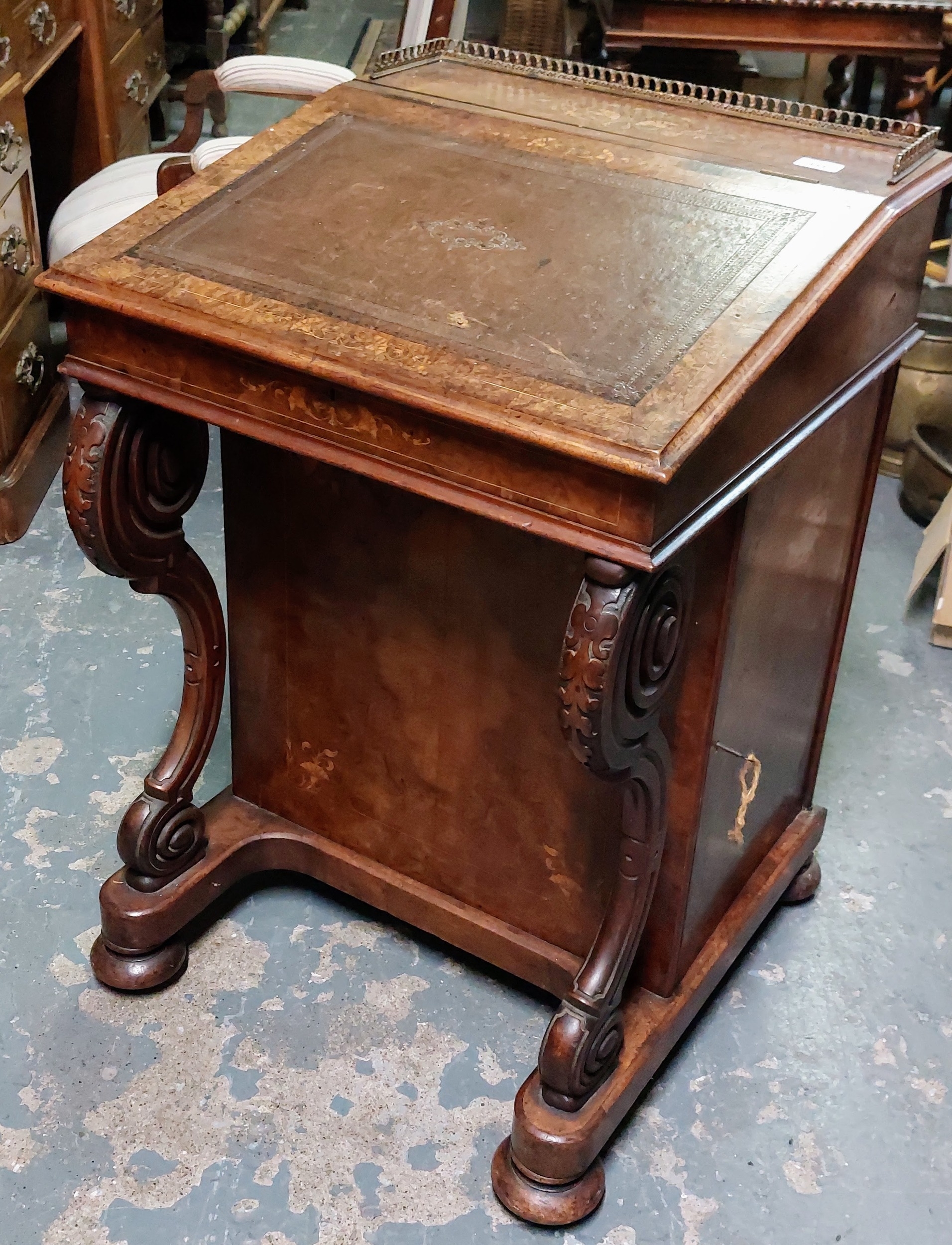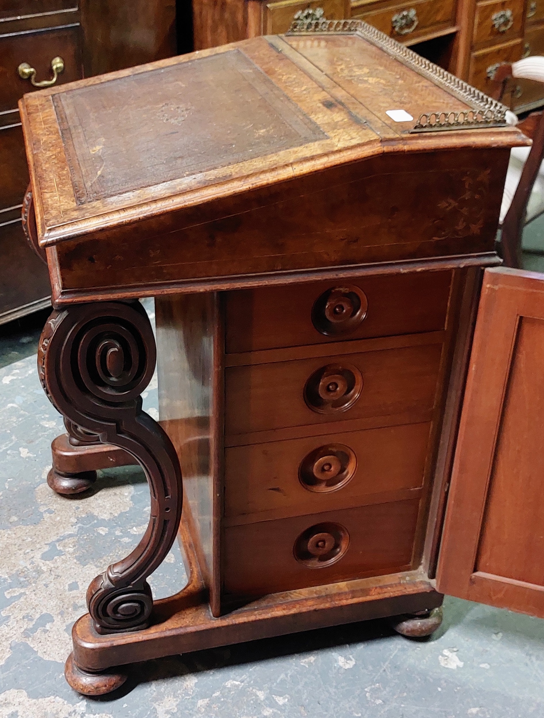 Inlaid Birds Eye Walnut Davenport with Brass Gallery, Tooled Leather Slope and on Castors - C. 57cm W x 59cm D x 87cm H