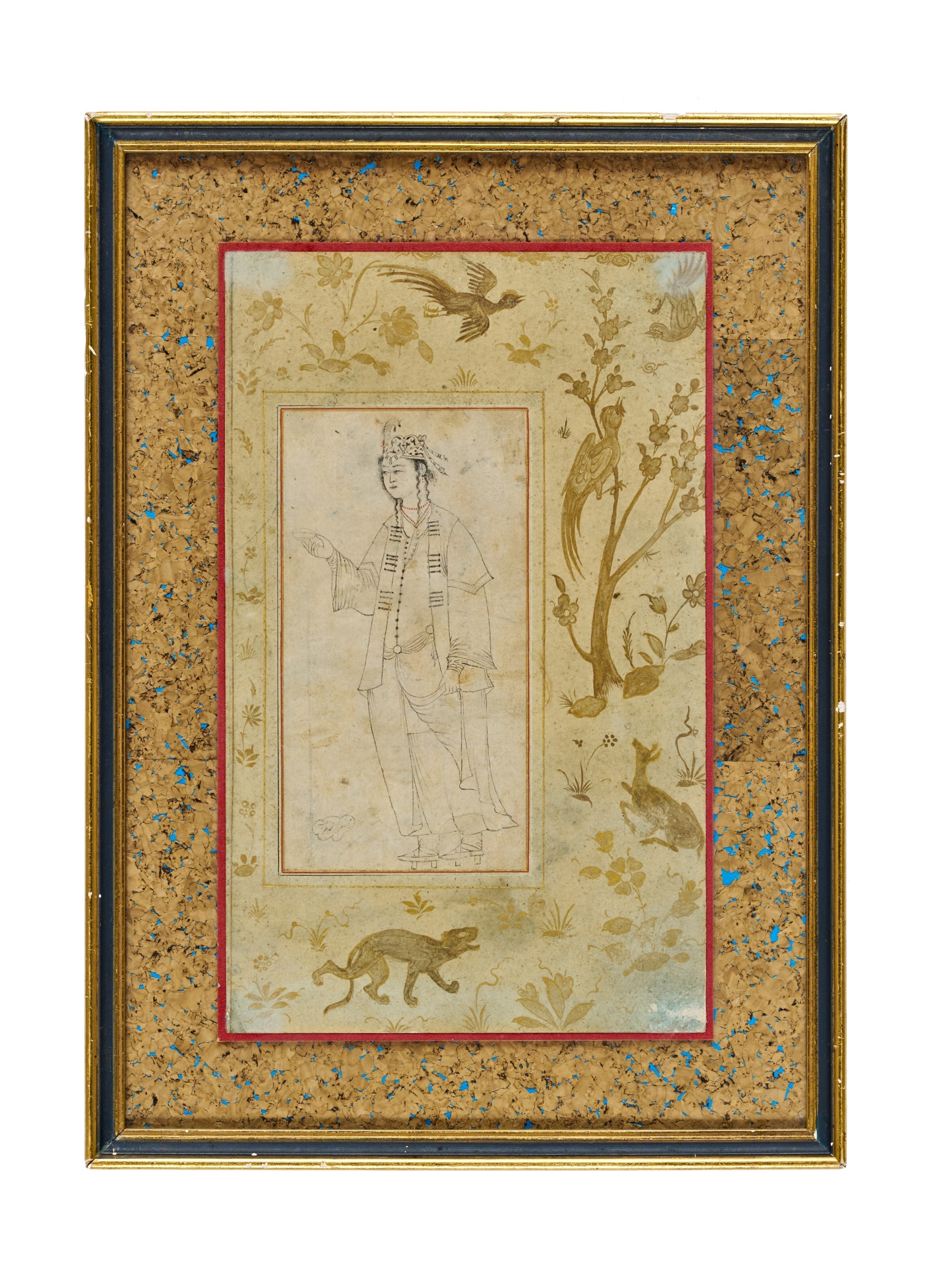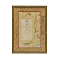 A SAFAVID PAINTING OF A STANDING YOUTH WITH GILDED BIRDS AND ANIMAL BORDER, 17TH CENTURY