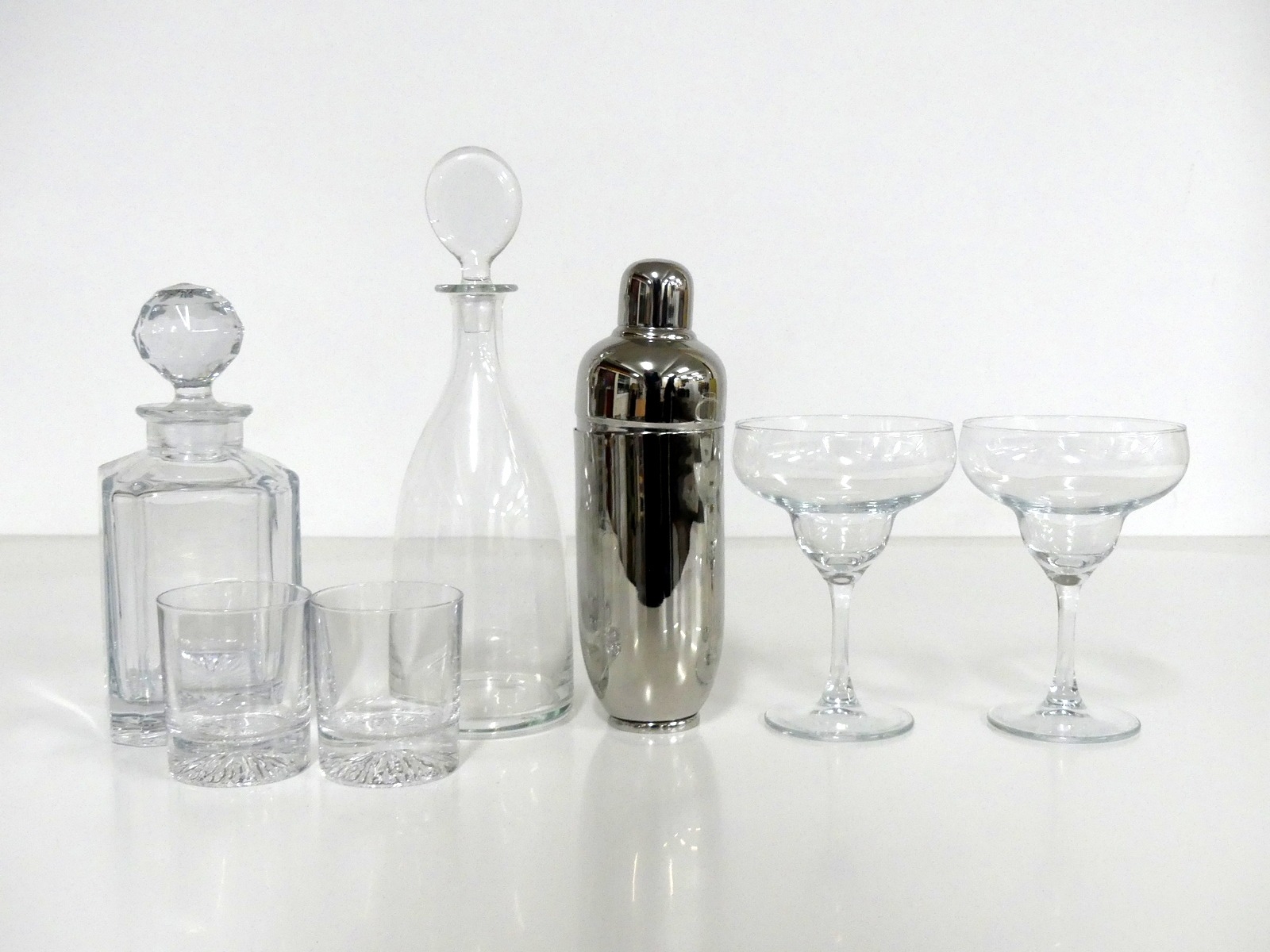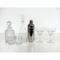 A Whisky Decanter and 2 glasses A Decanter A cocktail shake and 2 Margarita glasses
