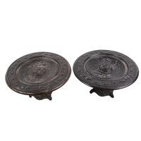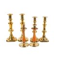 Three pairs of 19th century and later brass candlesticks. Comprising two pairs with double knop stems, square dishes and canted bases, H27.5cm and H25cm and a pair with circular bases, H30cm