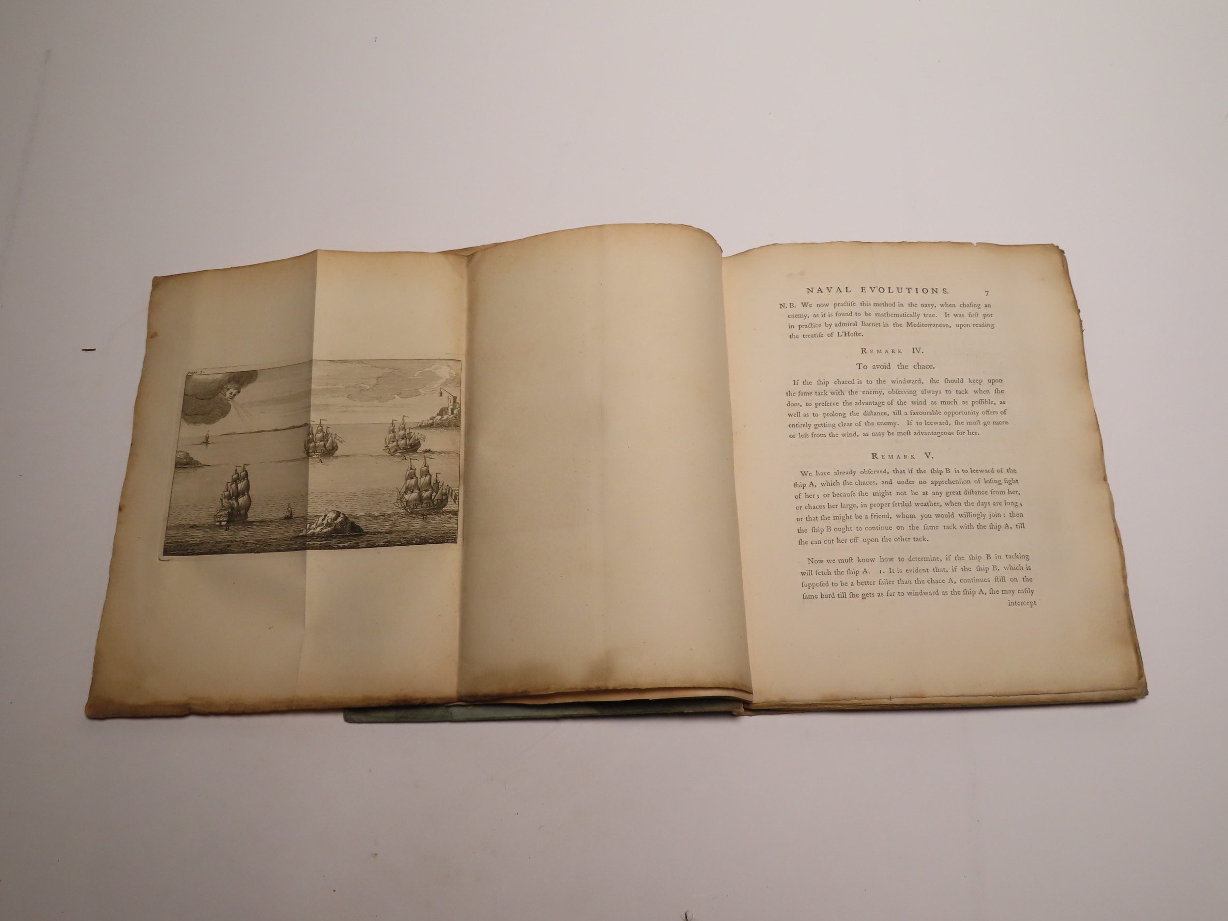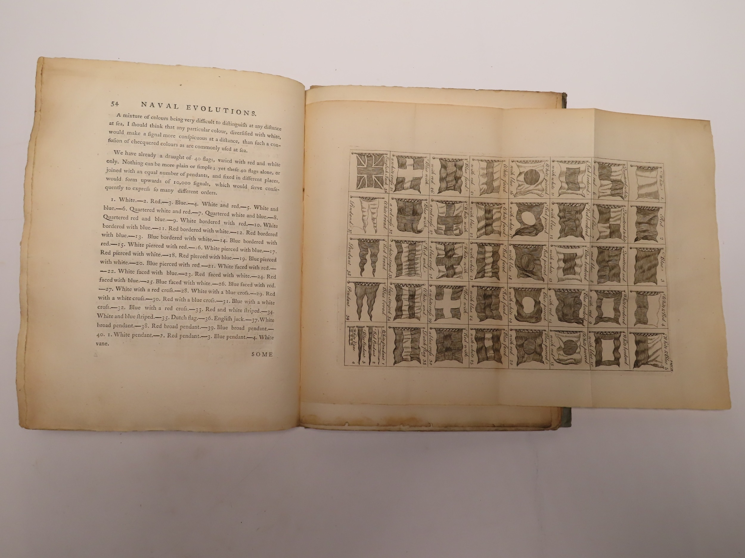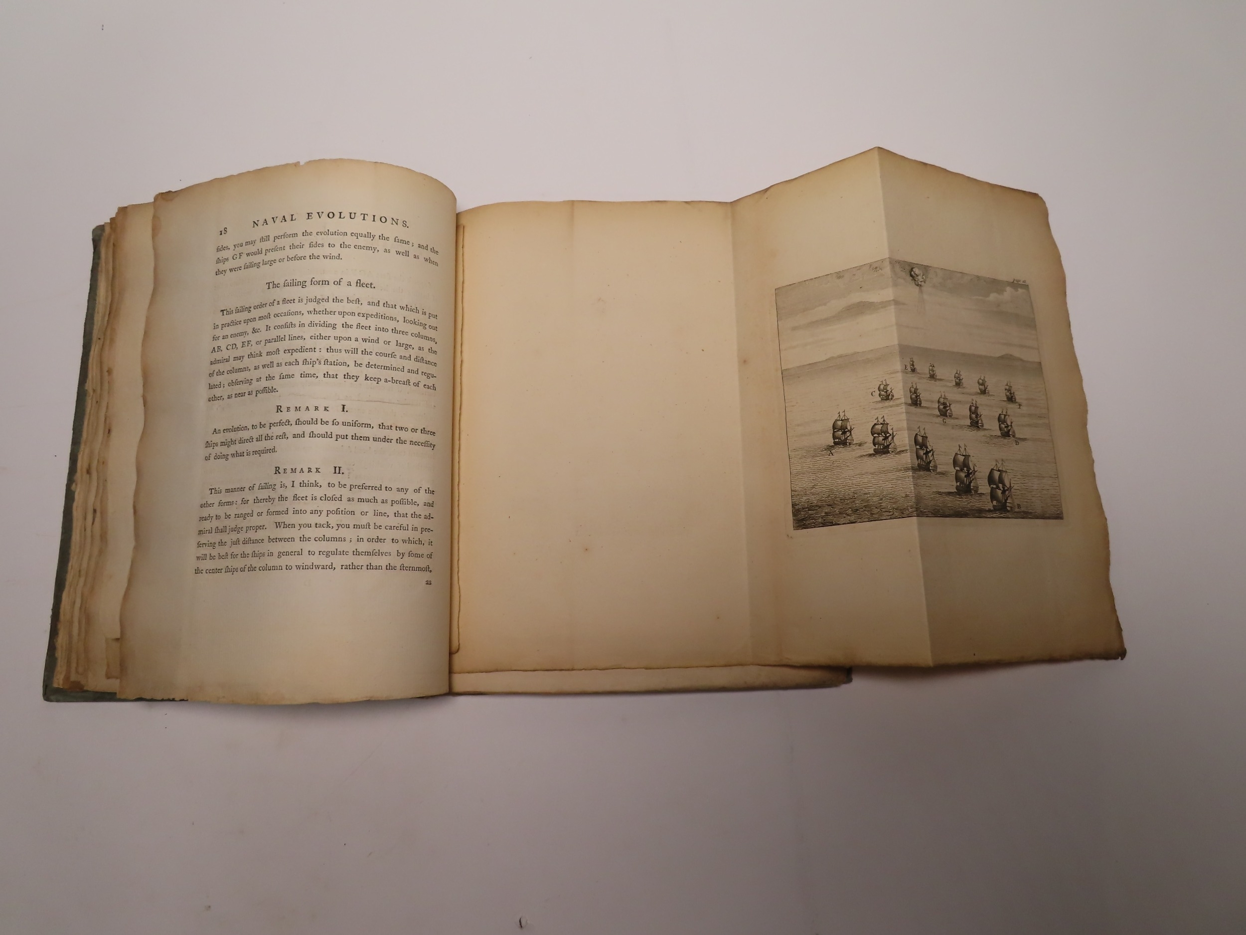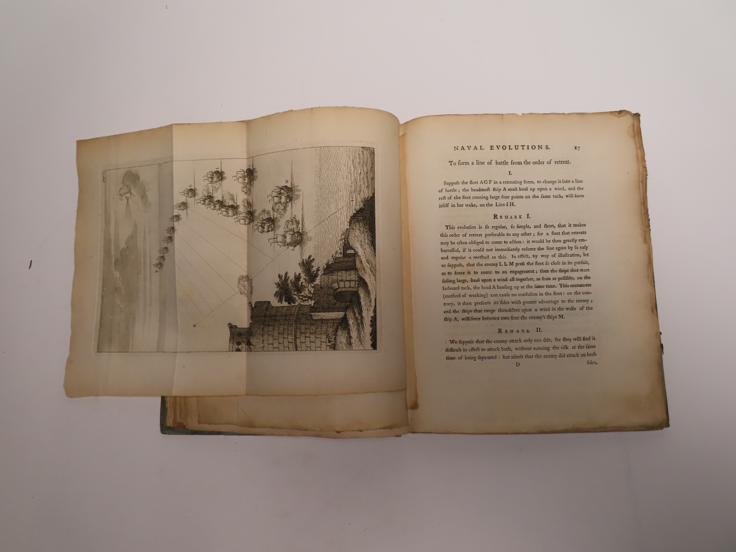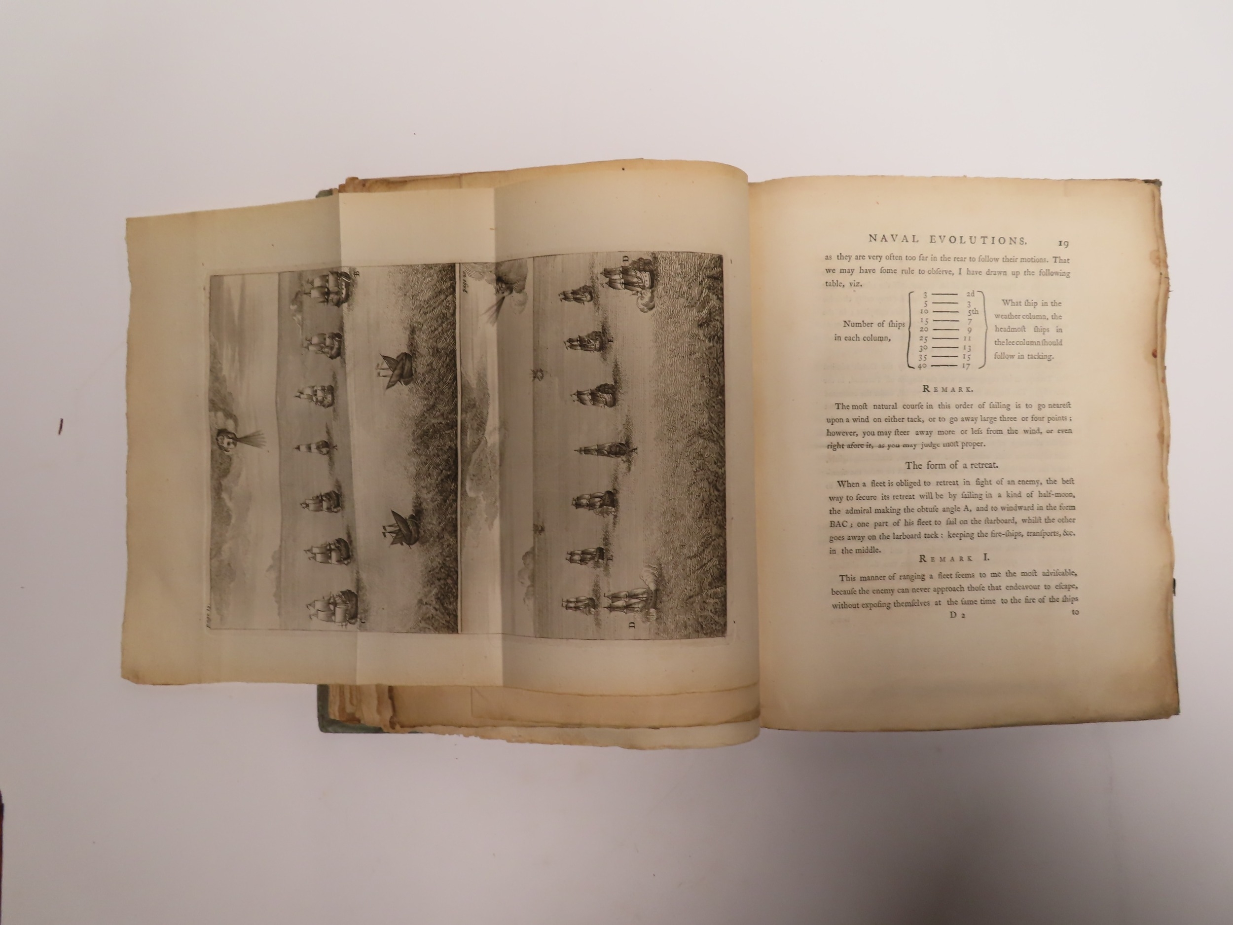 Naval Evolutions: or, a System of Sea-Discipline; extracted from the Celebrated Treatise of P. L'Hoste..., London, W. Johnston, 1762, 18 folding engraved plates, with the final leaf of ‘Ships lost by the English during the present war’ and errata, original boards with paper label on spine, lower fore-corner of front cover repaired, unopened, Sir Home Riggs Popham’s signature on front paste-down endpaper -- 9½ x 11½in. (24 x 29cm.)