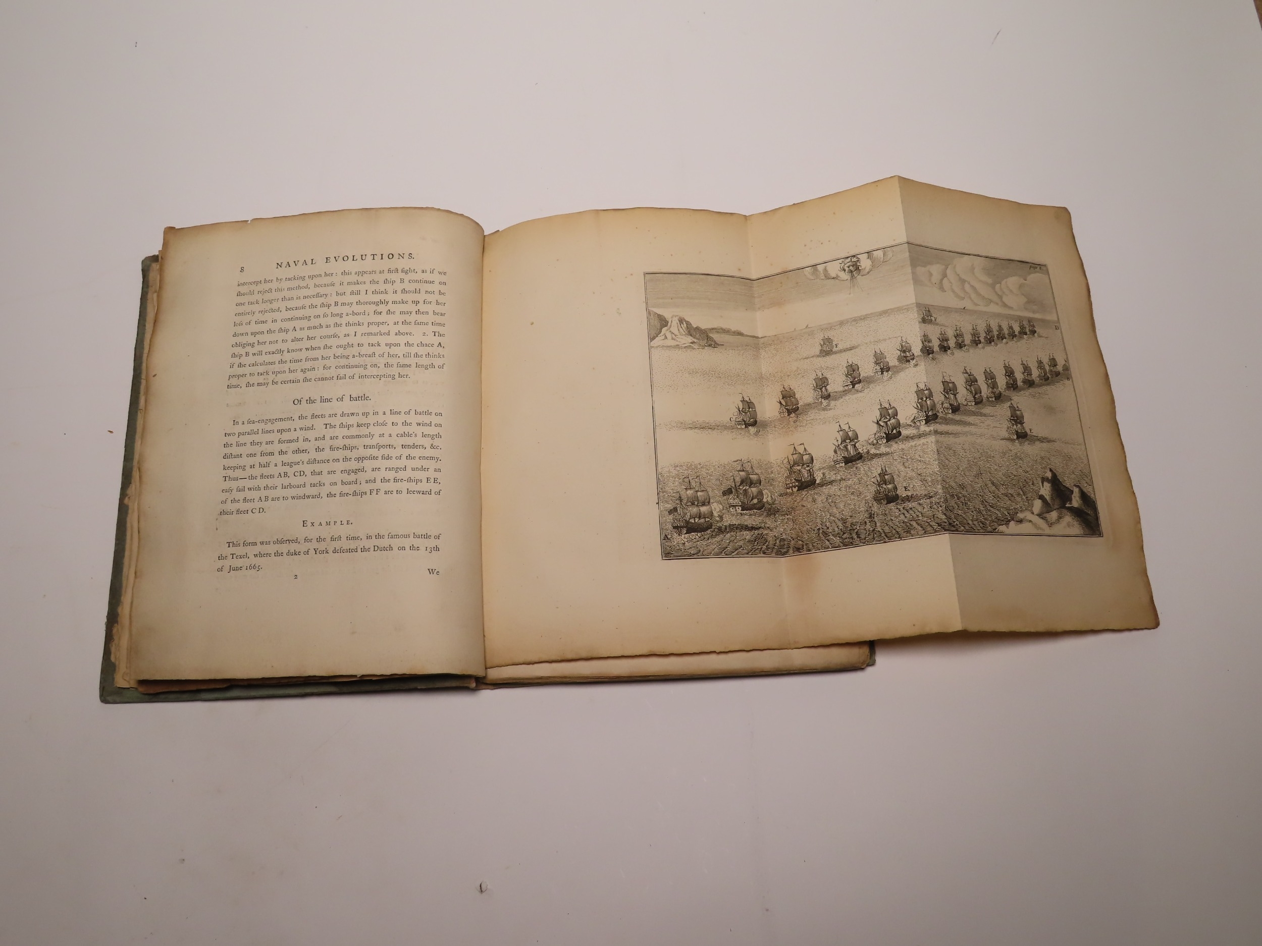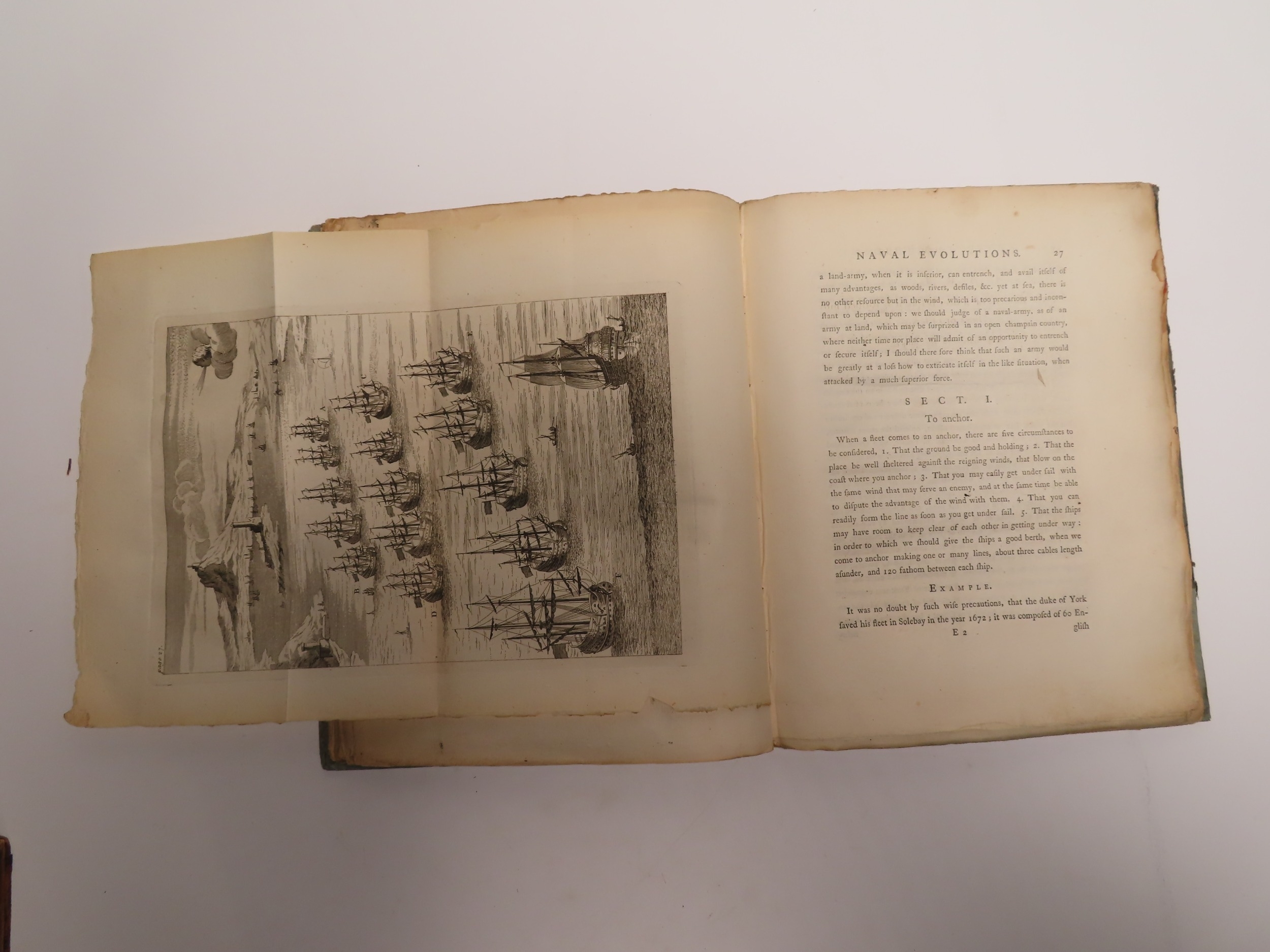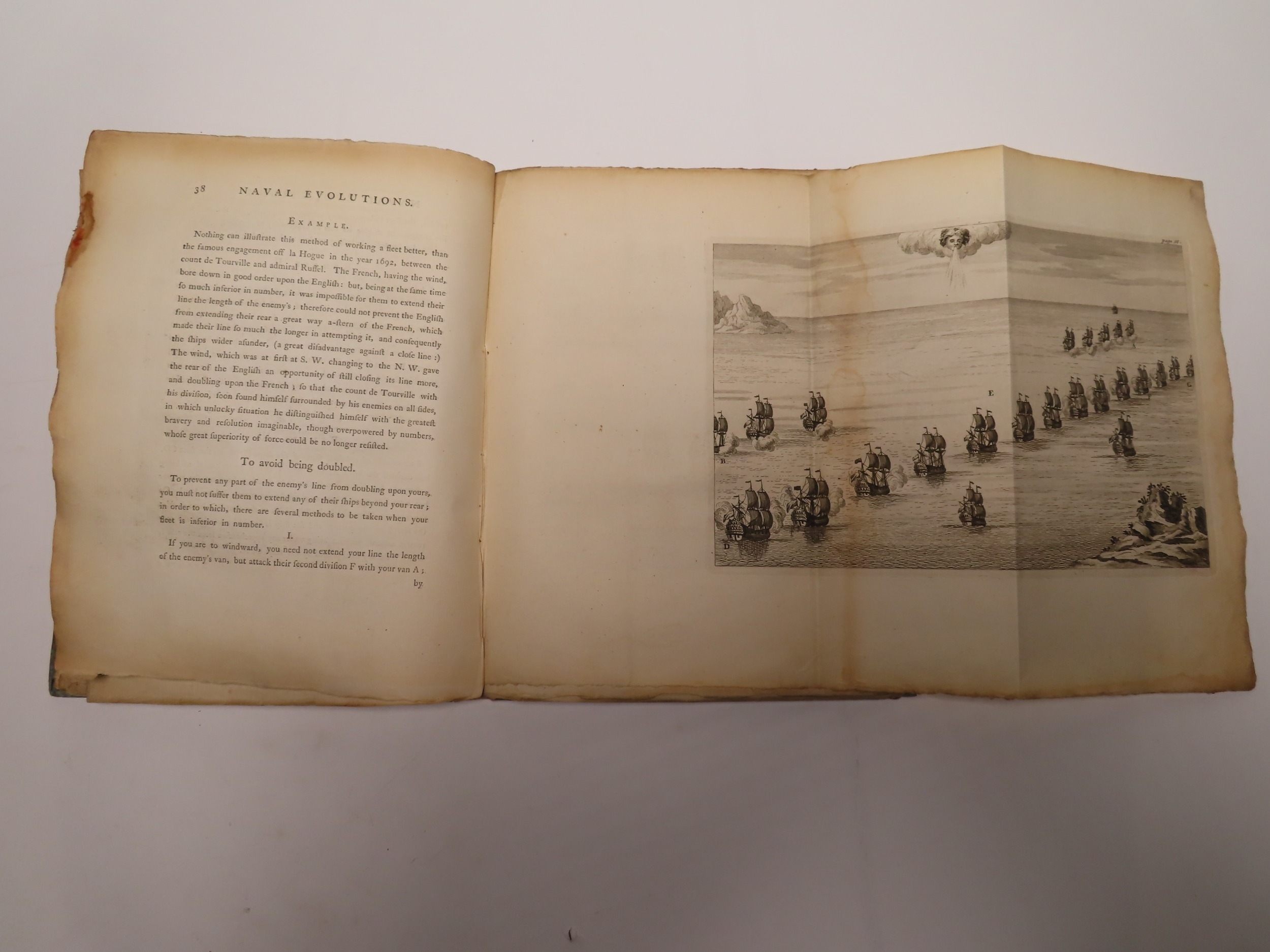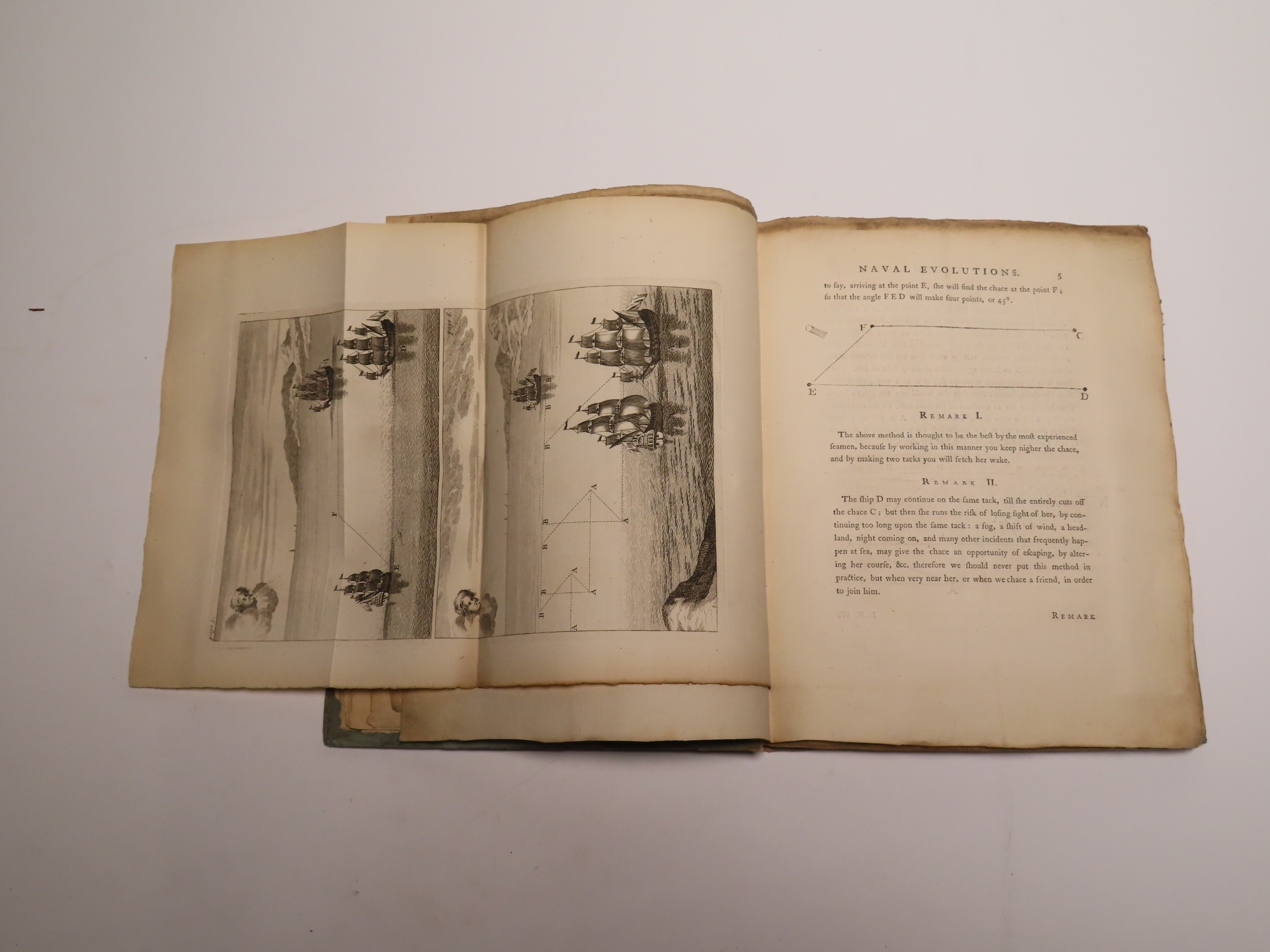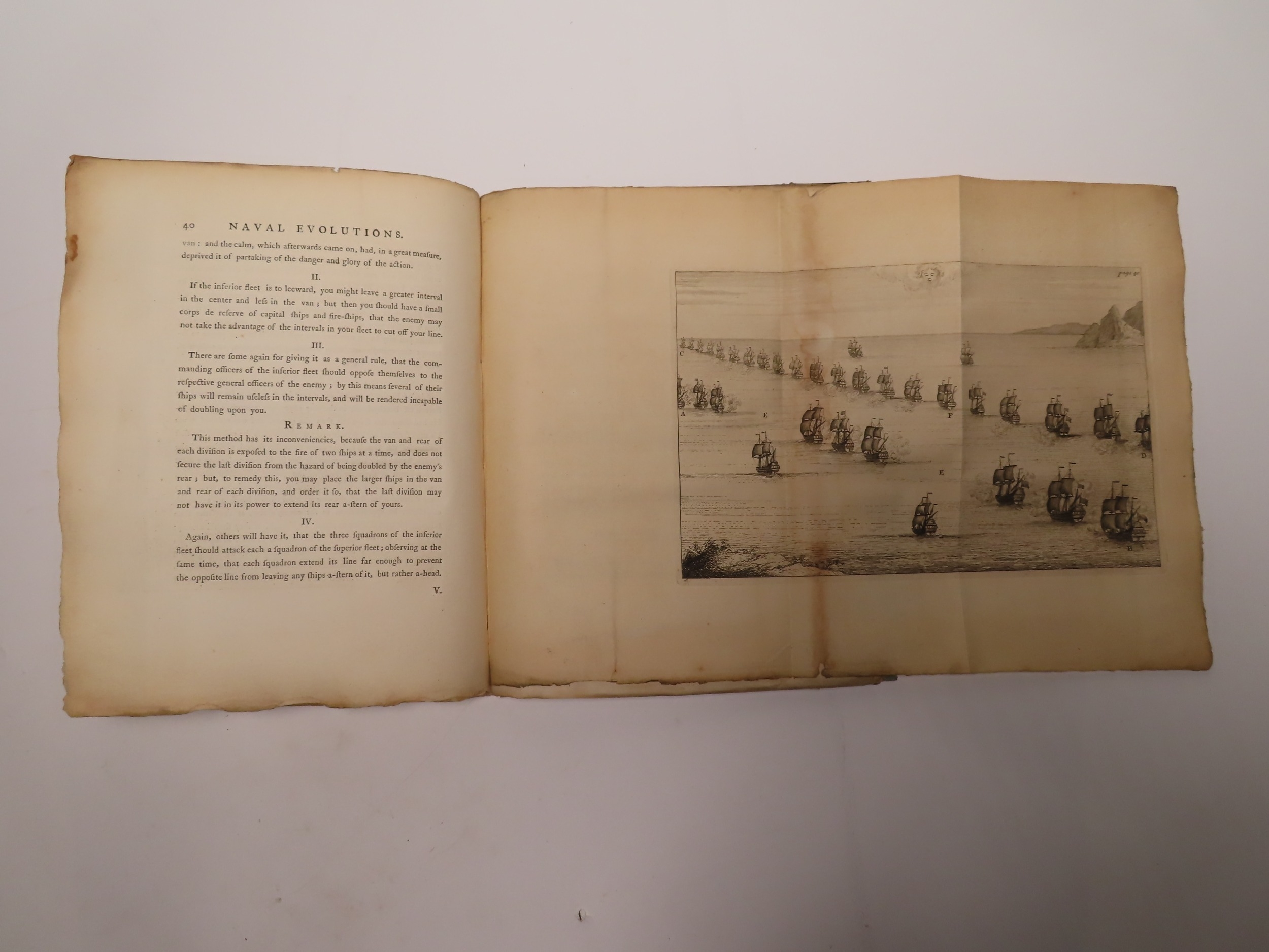 Naval Evolutions: or, a System of Sea-Discipline; extracted from the Celebrated Treatise of P. L'Hoste..., London, W. Johnston, 1762, 18 folding engraved plates, with the final leaf of ‘Ships lost by the English during the present war’ and errata, original boards with paper label on spine, lower fore-corner of front cover repaired, unopened, Sir Home Riggs Popham’s signature on front paste-down endpaper -- 9½ x 11½in. (24 x 29cm.)